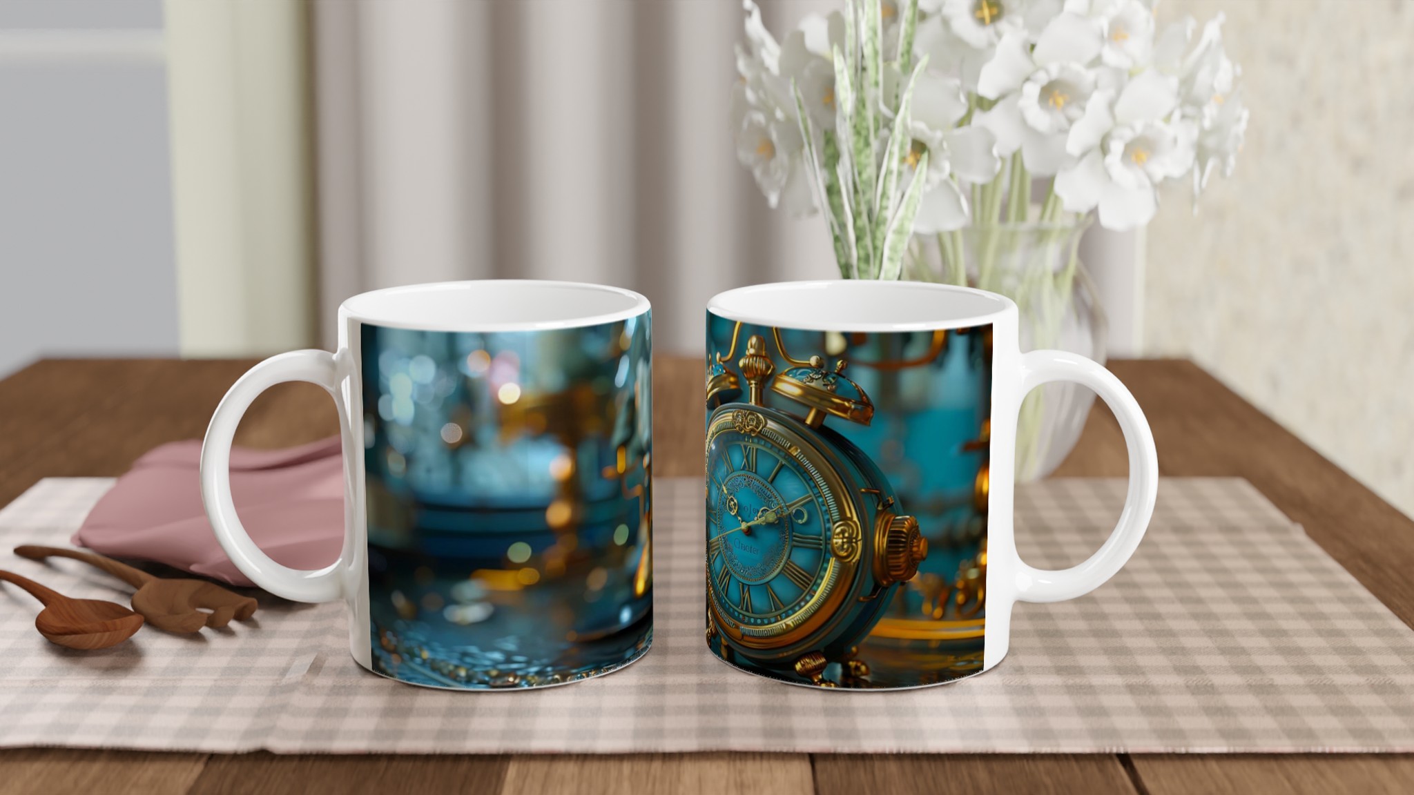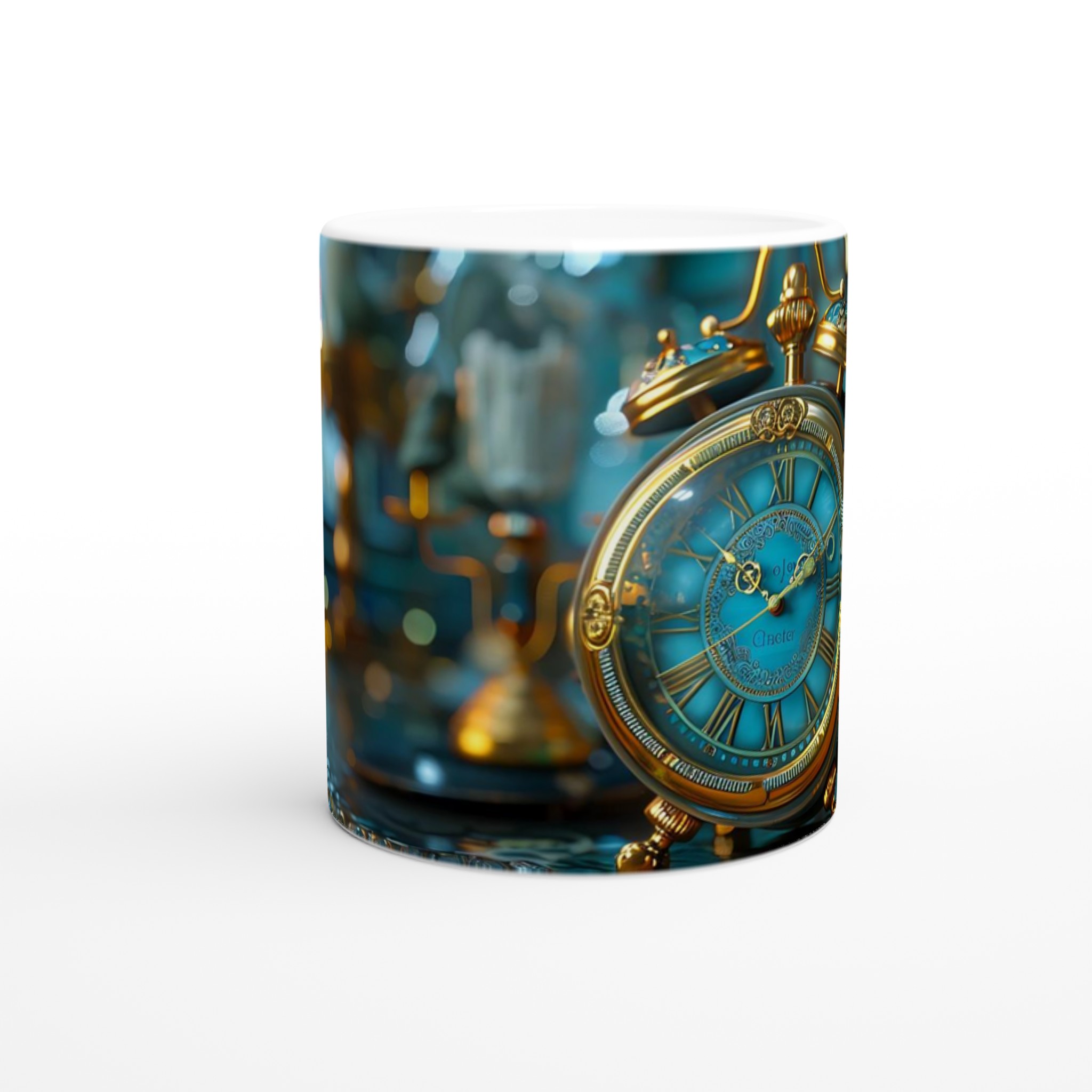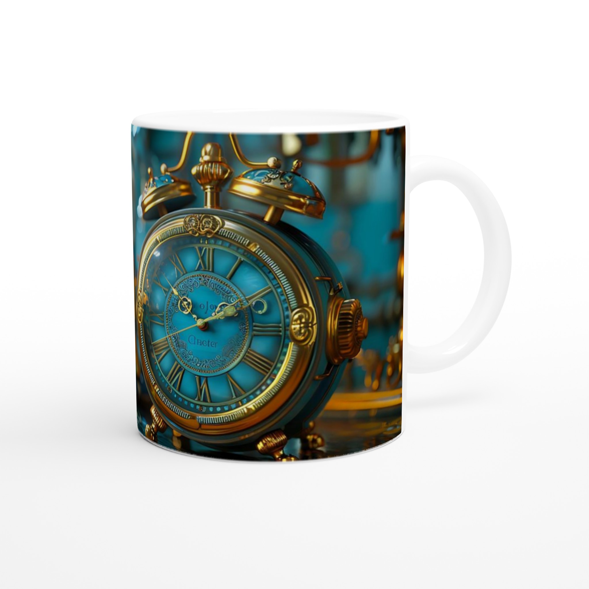 Kliv in i en värld av tidlös charm med vår Steampunk Vintage Klocka Keramiska Mugg. Denna mugg är inte bara en dryckesbehållare; den är en inbjudan att drömma dig bort till ett annat århundrade, perfekt för morgonkaffet, kvällens varma choklad eller när du bara vill njuta av en kopp te. Den detaljerade designen, inspirerad av en utsmyckad vintageklocka i turkosa och guldiga toner, ger varje fika en känsla av mystik och äventyr. Den blanka ytan säkerställer att trycket framhävs med klara och levande färger, som håller sig fina även efter många turer i mikron och diskmaskinen.