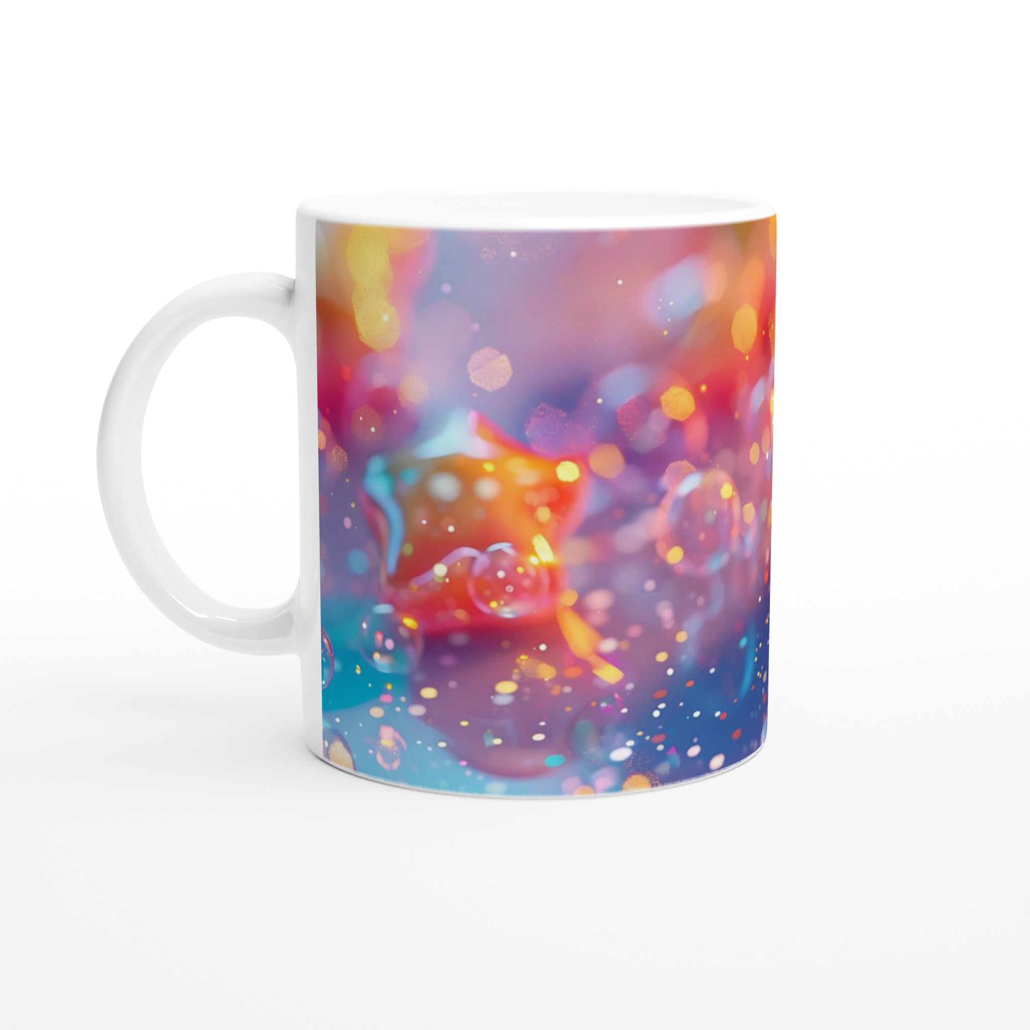 Inspirerad av en värld av glädje och festliga färger, fångar denna mugg den sprudlande energin från stjärnformade konfettibitar och gnistrande bokeh-ljus. Den blanka vita ytan ger ett skarpt och levande tryck som verkligen sticker ut, oavsett om det är en personlig design, ett roligt citat eller en present till någon du tycker om.