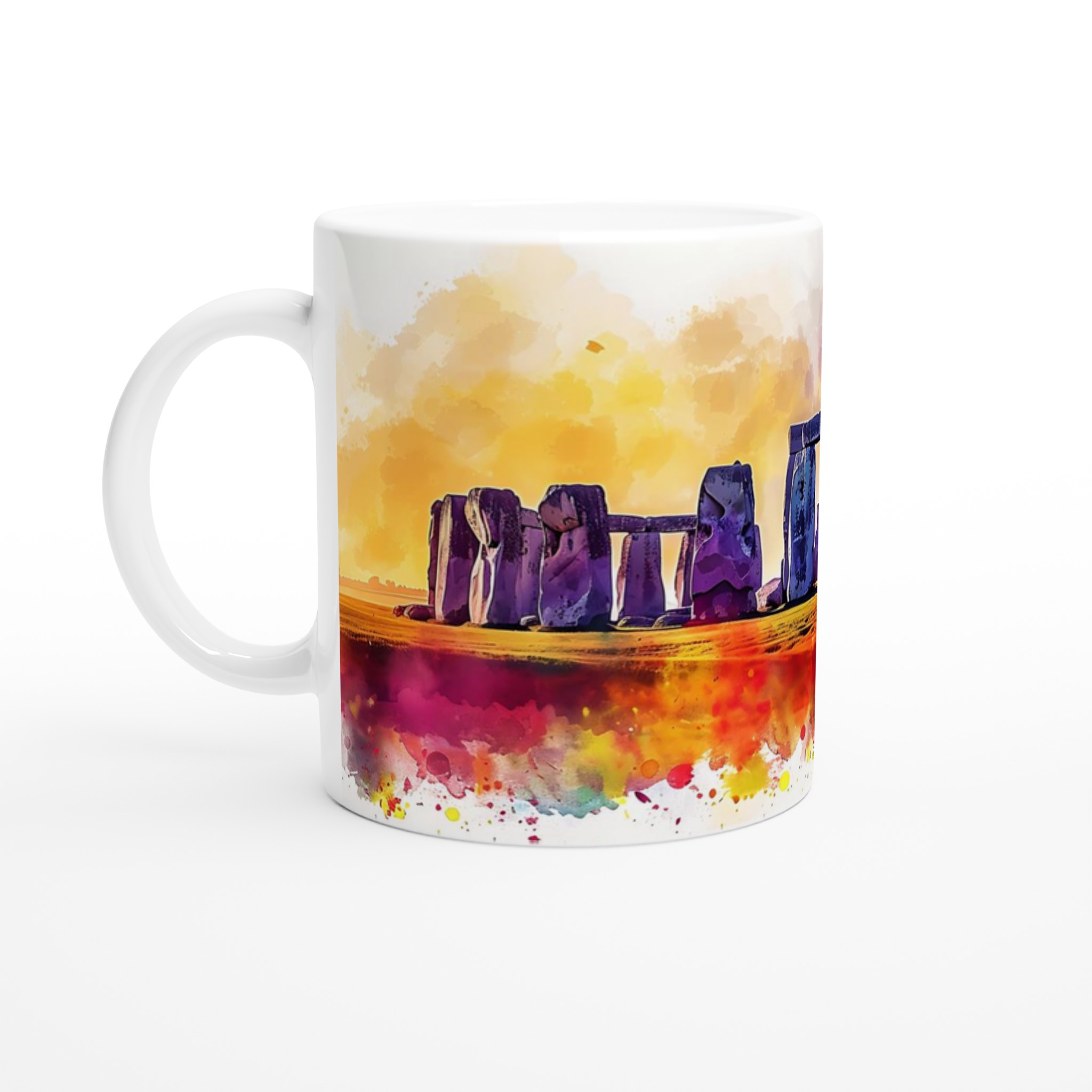 Förvandla din dagliga fikaritual till en konstnärlig upplevelse med vår unika Stonehenge akvarellmugg. Denna mugg fångar den mystiska skönheten hos Stonehenge, omgiven av en levande explosion av akvarellfärger som för tankarna till en solnedgång över de historiska stenarna. Den rika färgpaletten och den konstnärliga stilen gör varje sipp till en stund av inspiration och lugn, perfekt för dig som älskar historia, konst och en touch av färg i vardagen.