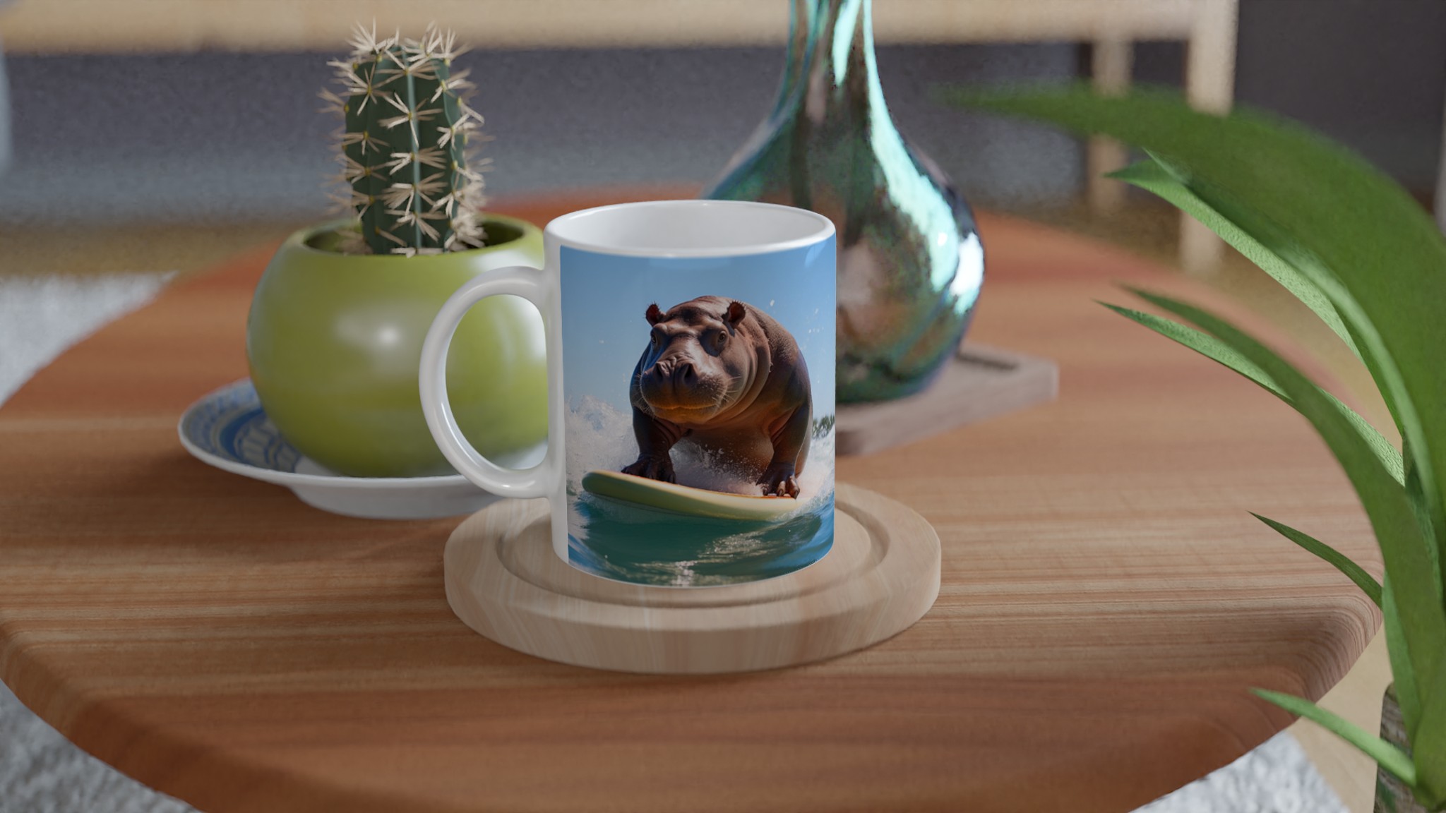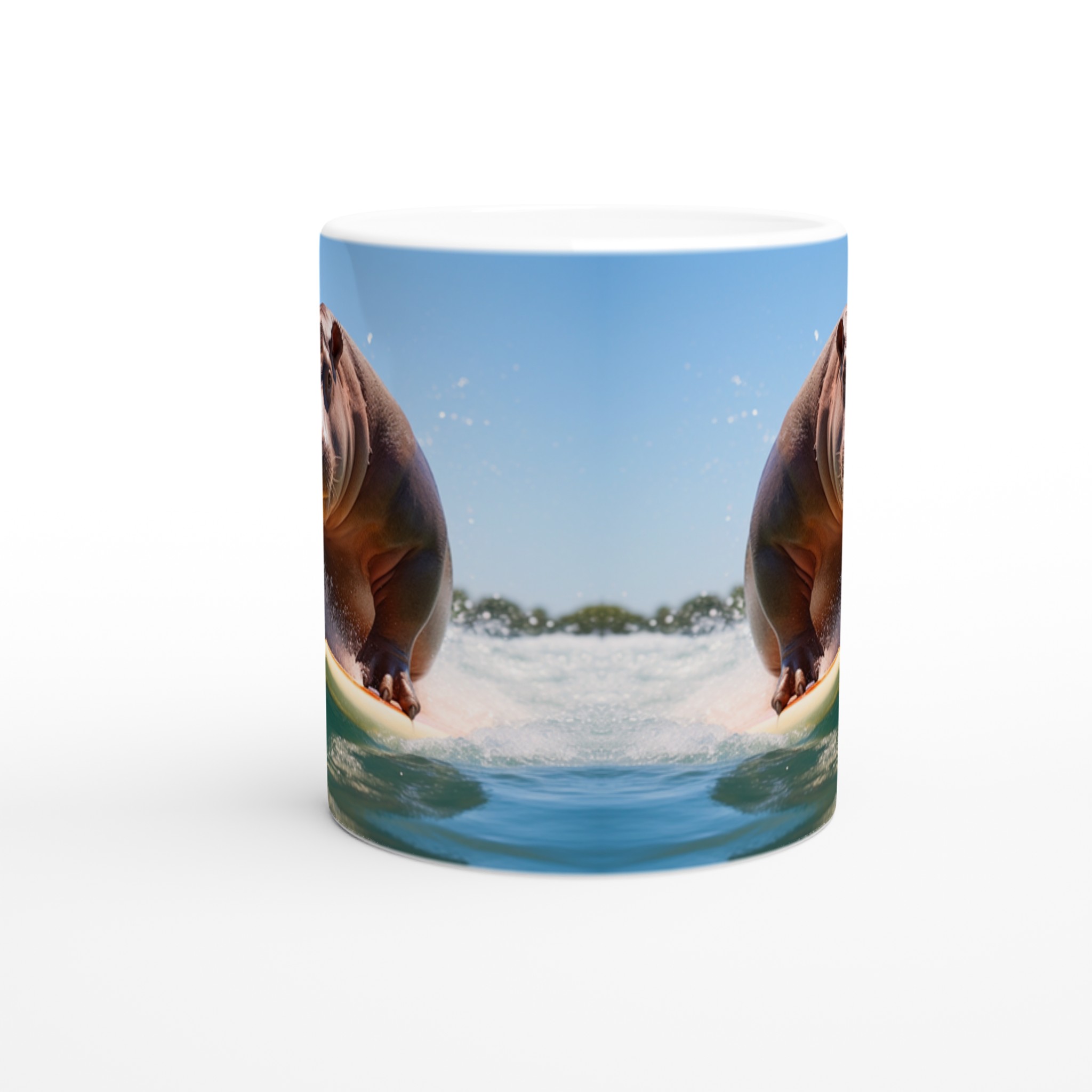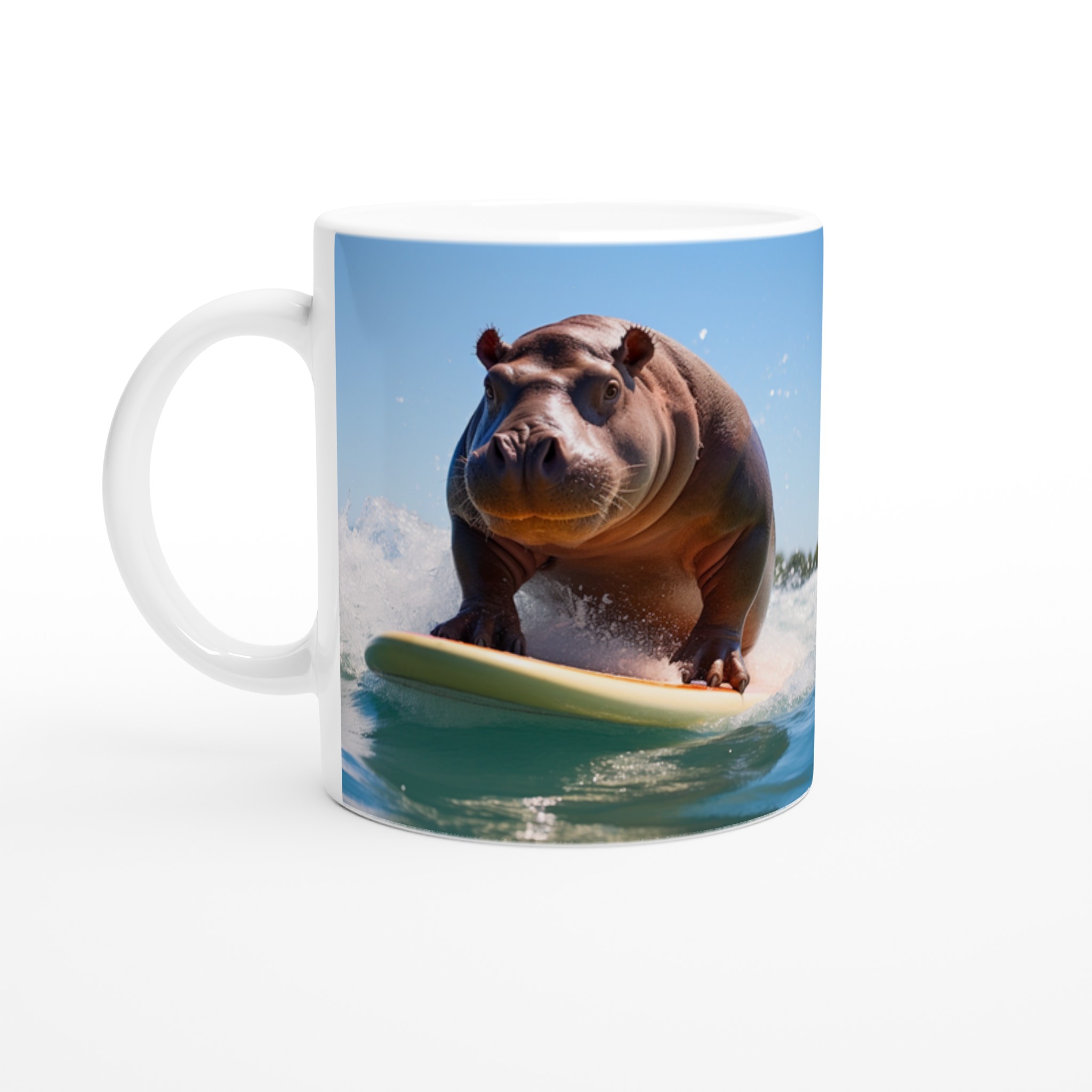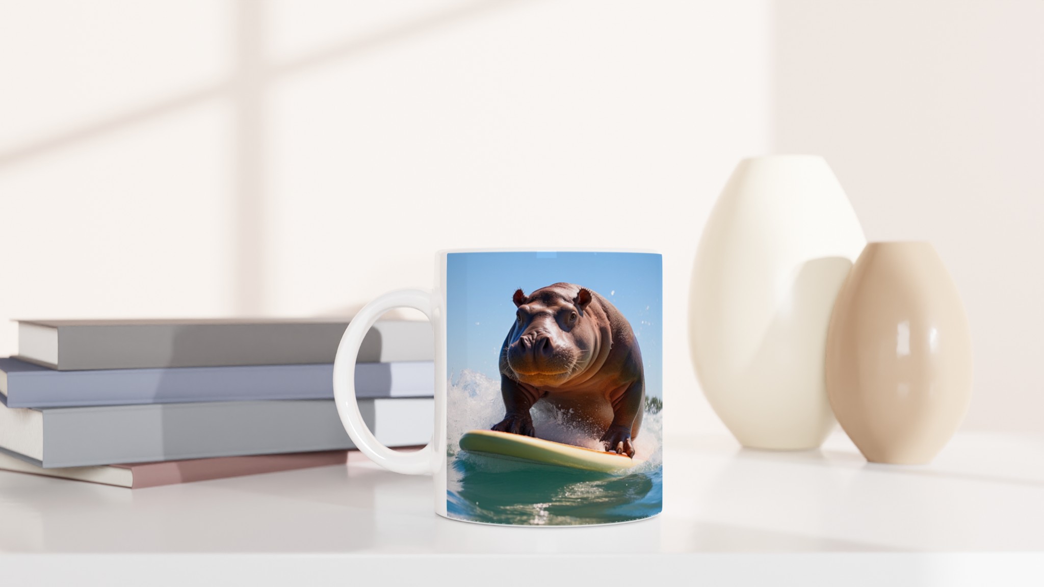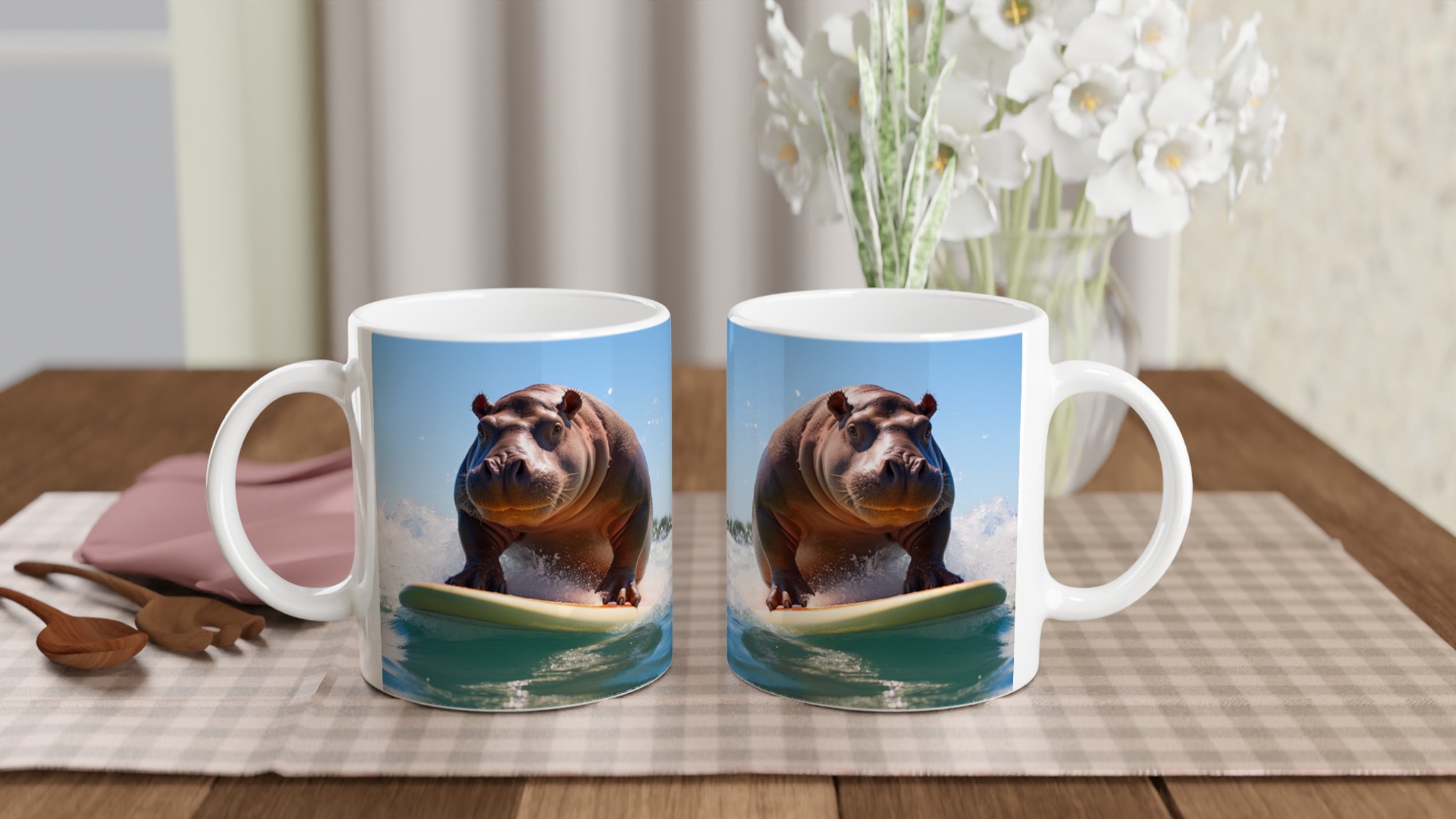 Våga vara annorlunda med denna unika keramiska mugg, prydd med en förtjusande surfande flodhäst som garanterat sprider glädje! Den här stilrena muggen blir snabbt en vardagsfavorit. Perfekt för morgonkaffet, kvällens varma choklad eller när du bara vill njuta av en kopp te. Den blanka vita ytan gör att trycken framhävs med klara och levande färger, som håller sig fina även efter många turer i mikron och diskmaskinen.
