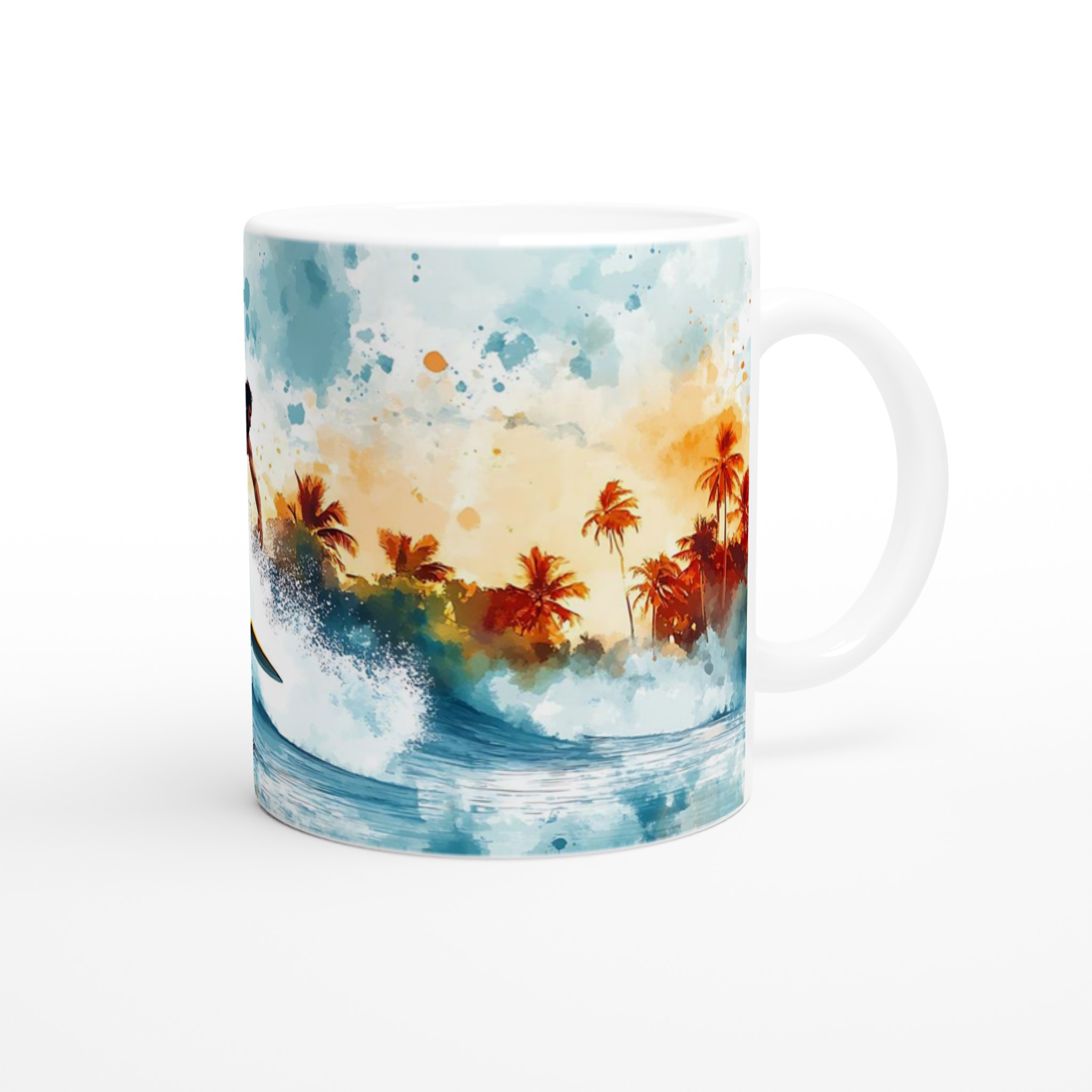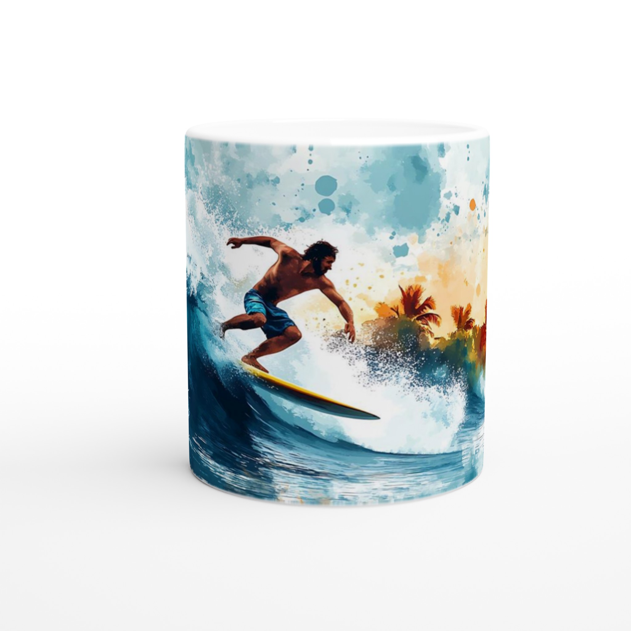 Fånga känslan av sommar och hav med vår unika surfvågsmugg, där varje kaffestund blir en minisemester. Inspirerad av akvarellens fria penseldrag, skildrar denna mugg en dramatisk surfvåg i turkosa och djupblå toner, mötande en gyllene solnedgång över palmkantade stränder. Den blanka ytan ger ett skarpt och levande tryck som verkligen sticker ut, oavsett om det är en personlig design, ett roligt citat eller en present till någon du tycker om.