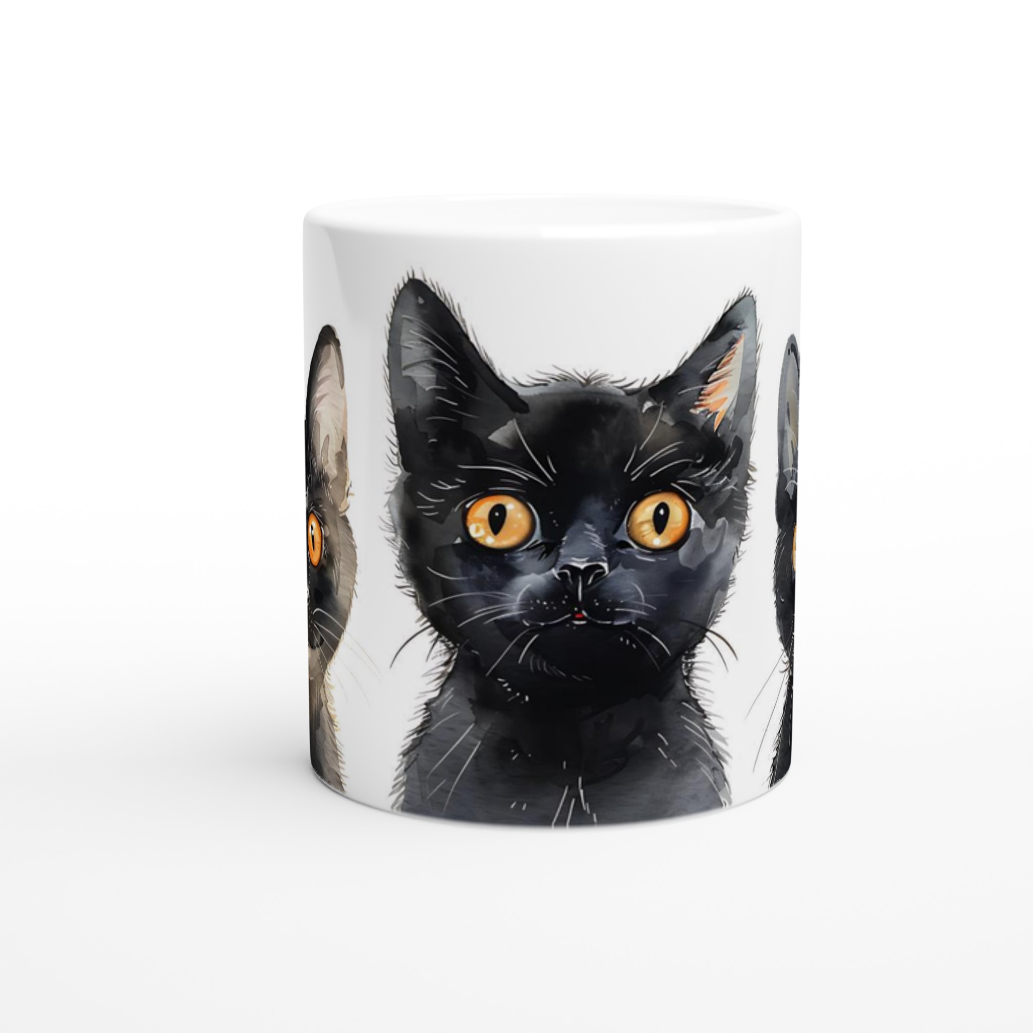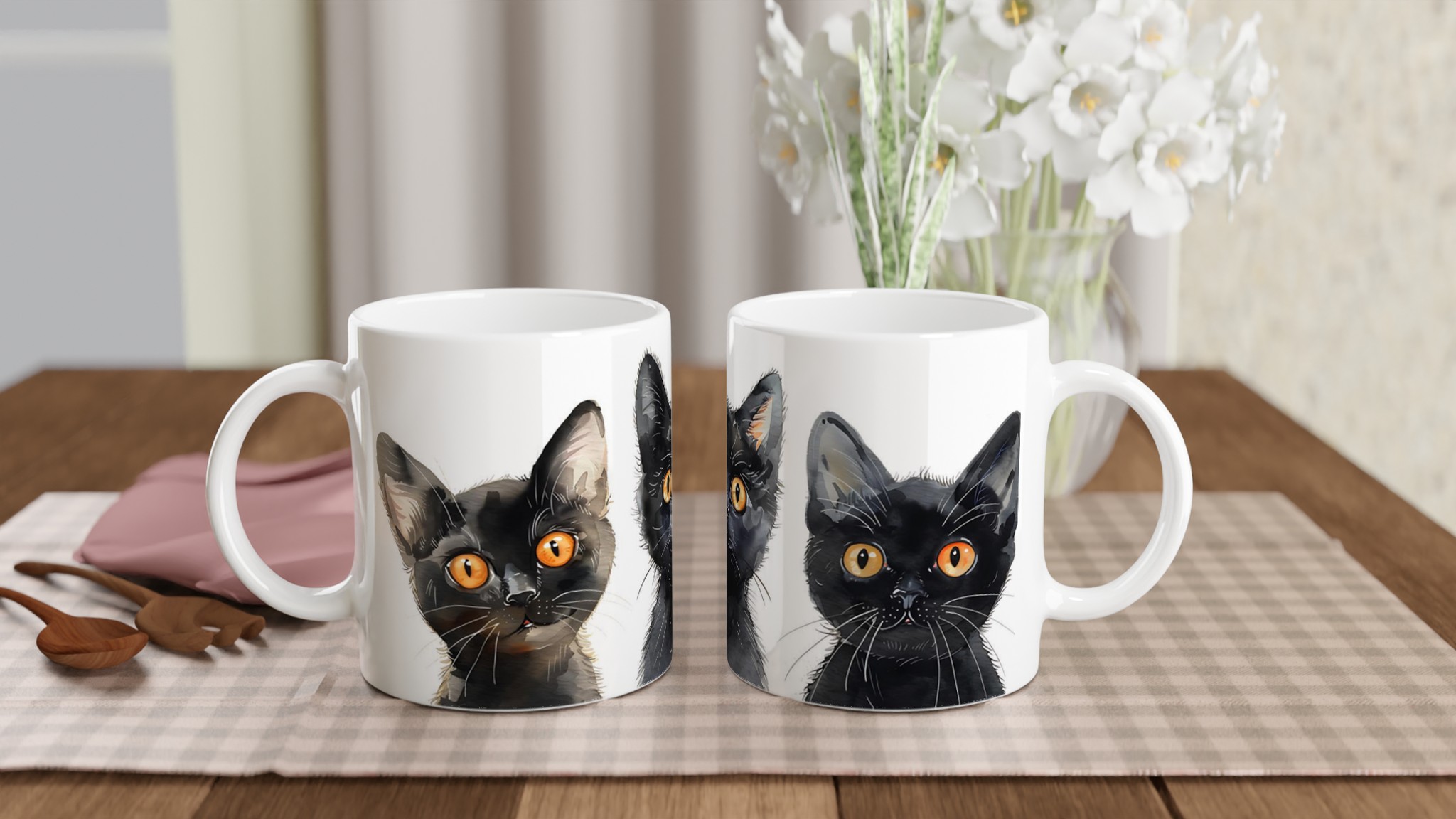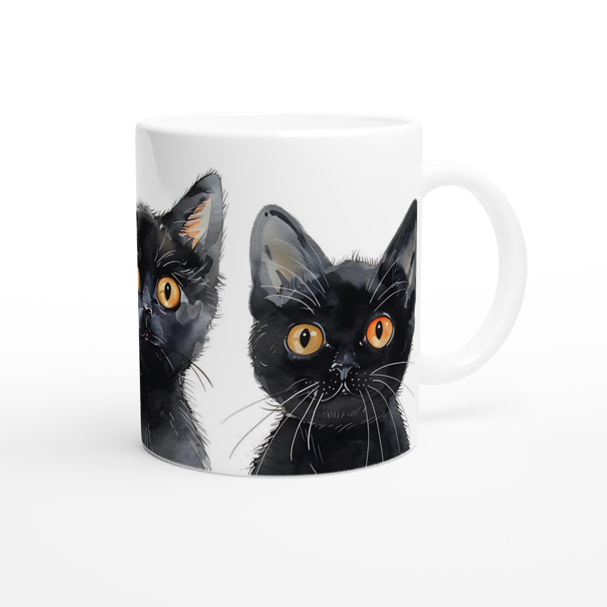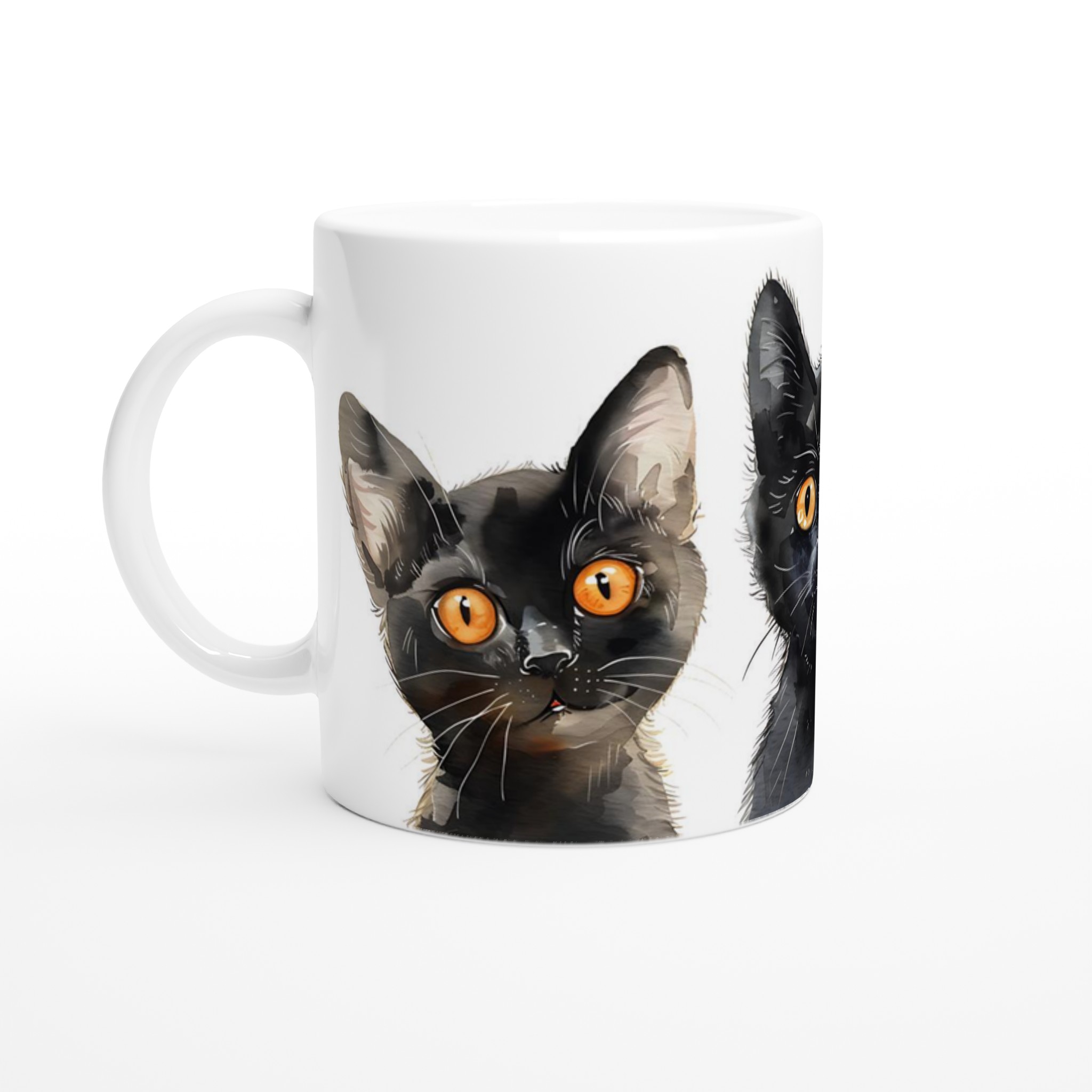 Låt dessa tre charmiga svarta katter med sina intensiva orangea ögon väcka liv i din morgonrutin! Den här stilrena keramiska muggen, prydd med ett lekfullt och konstnärligt kattmotiv, blir snabbt en vardagsfavorit. Perfekt för morgonkaffet, kvällens varma choklad eller när du bara vill njuta av en kopp te. Den blanka vita ytan gör att trycken framhävs med klara och levande färger, som håller sig fina även efter många turer i mikron och diskmaskinen.