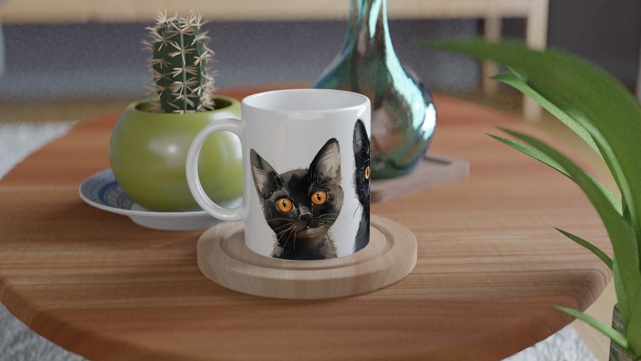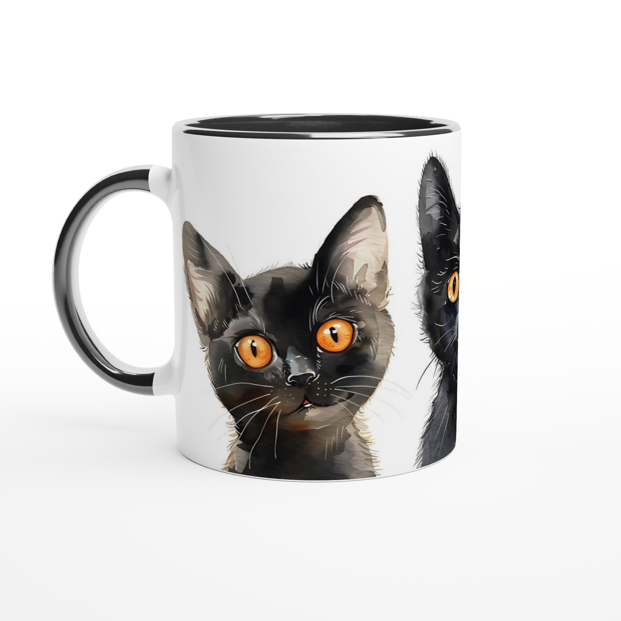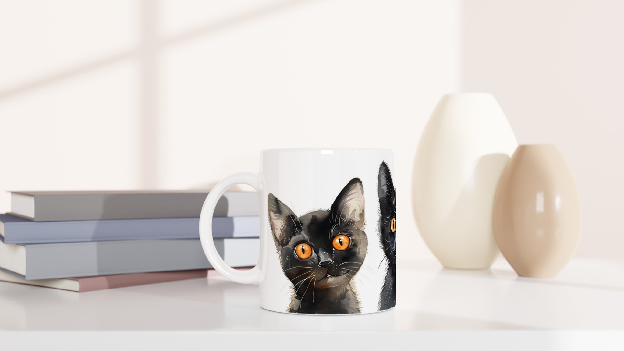Låt dessa tre charmiga svarta katter med sina intensiva orangea ögon väcka liv i din morgonrutin! Den här stilrena keramiska muggen, prydd med ett lekfullt och konstnärligt kattmotiv, blir snabbt en vardagsfavorit. Perfekt för morgonkaffet, kvällens varma choklad eller när du bara vill njuta av en kopp te. Den blanka vita ytan gör att trycken framhävs med klara och levande färger, som håller sig fina även efter många turer i mikron och diskmaskinen.