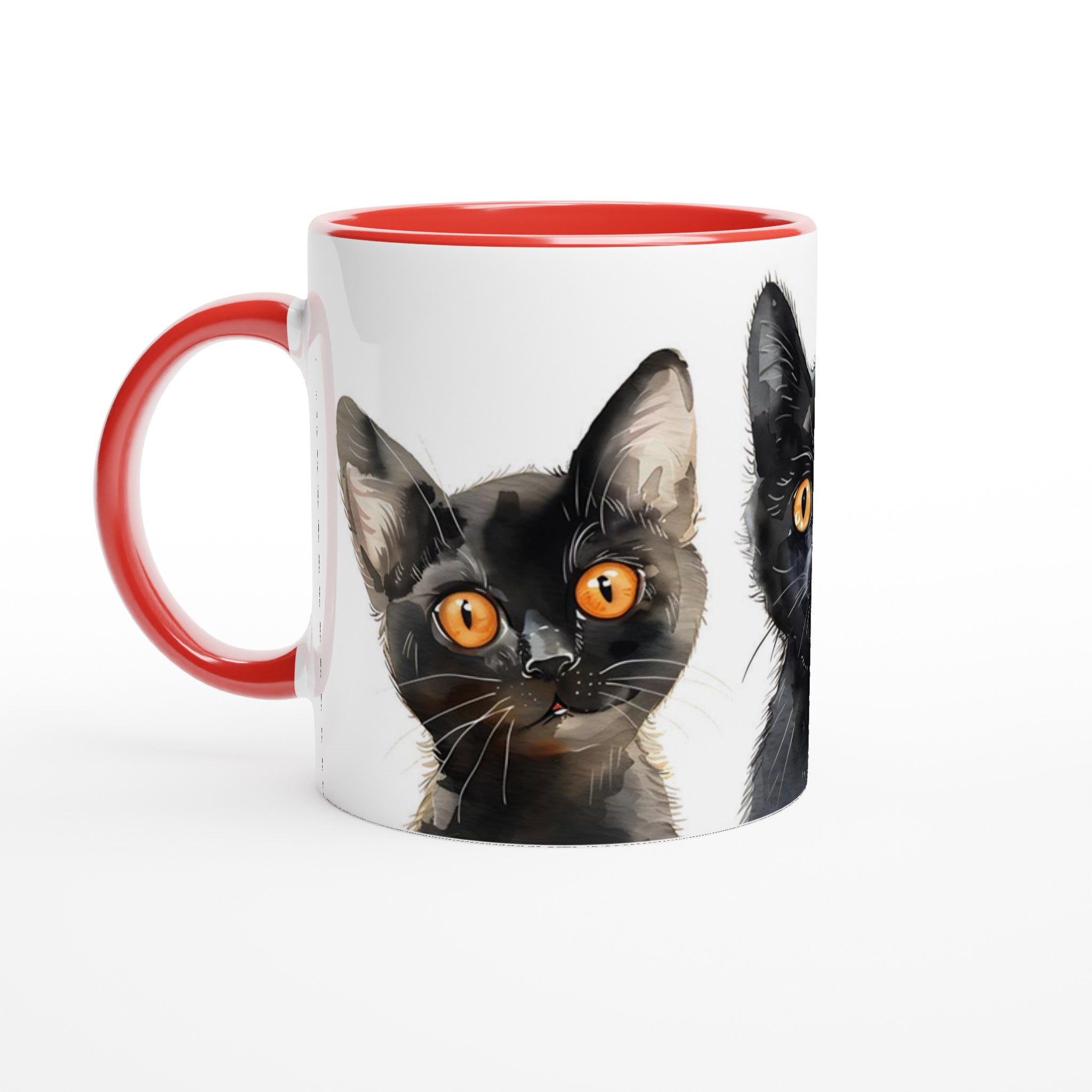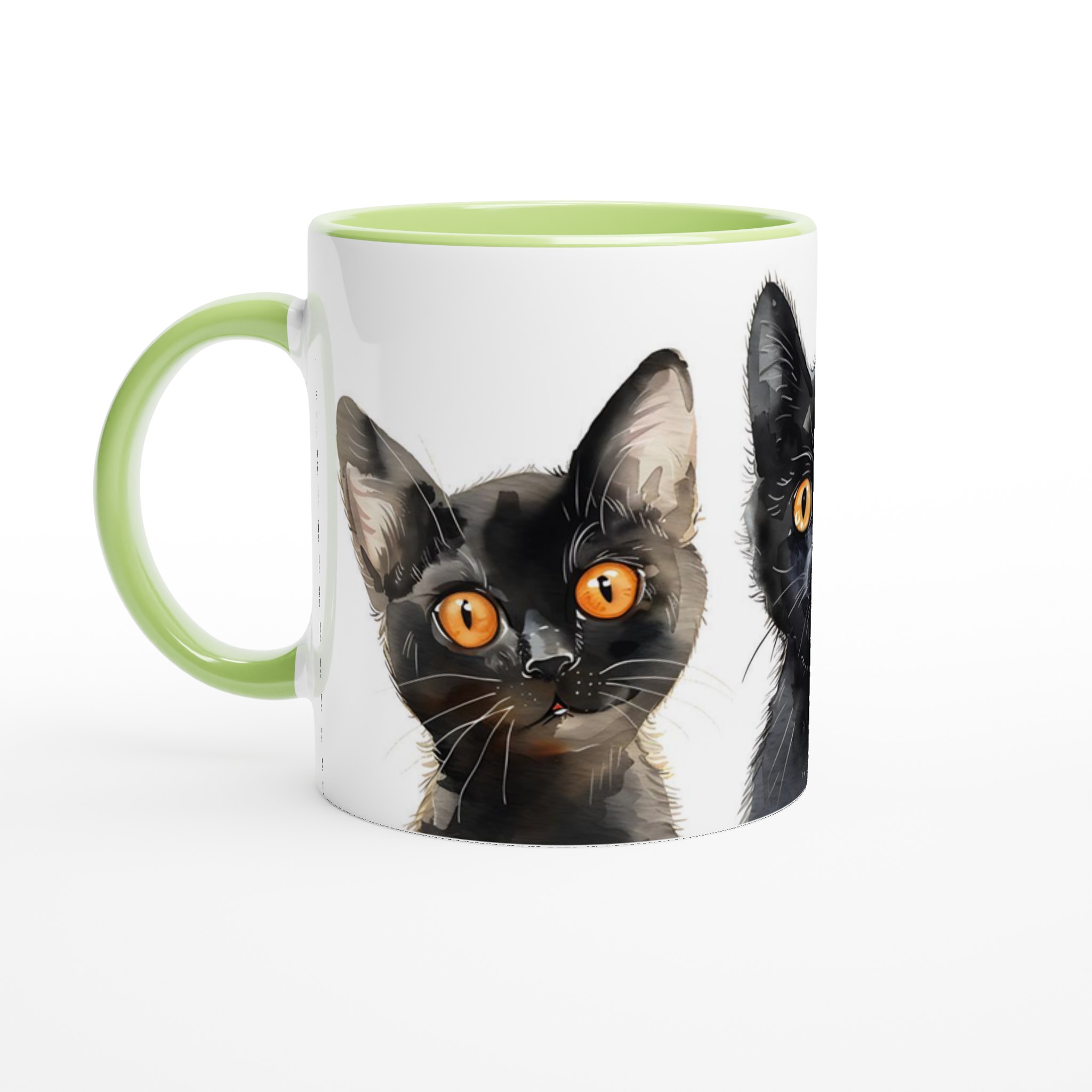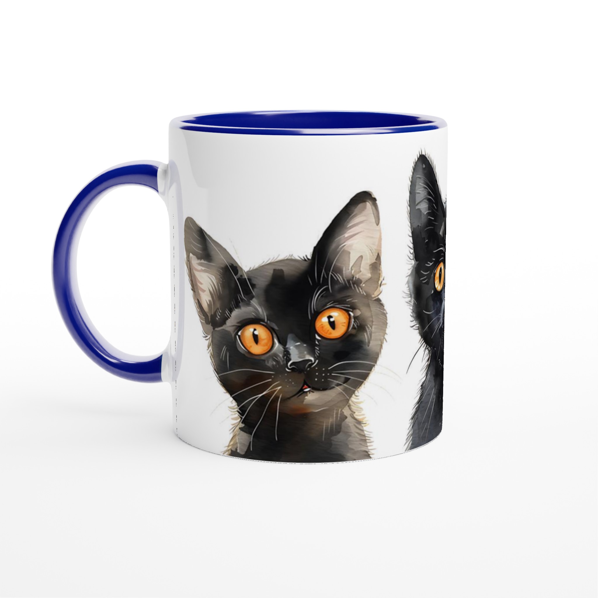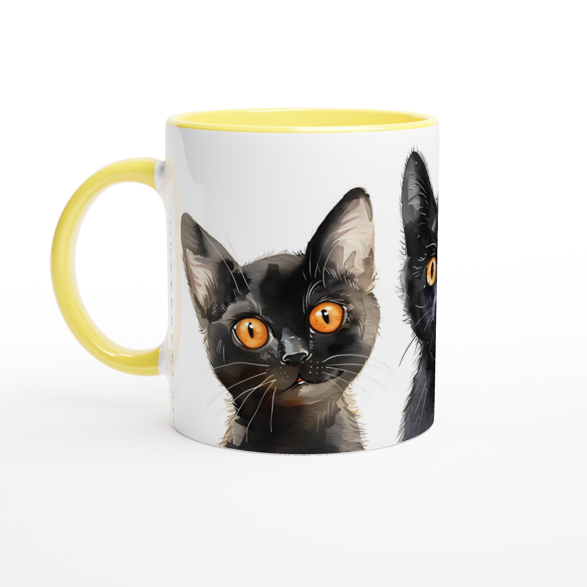 Låt dessa tre charmiga svarta katter med sina intensiva orangea ögon väcka liv i din morgonrutin! Den här stilrena keramiska muggen, prydd med ett lekfullt och konstnärligt kattmotiv, blir snabbt en vardagsfavorit. Perfekt för morgonkaffet, kvällens varma choklad eller när du bara vill njuta av en kopp te. Den blanka vita ytan gör att trycken framhävs med klara och levande färger, som håller sig fina även efter många turer i mikron och diskmaskinen.