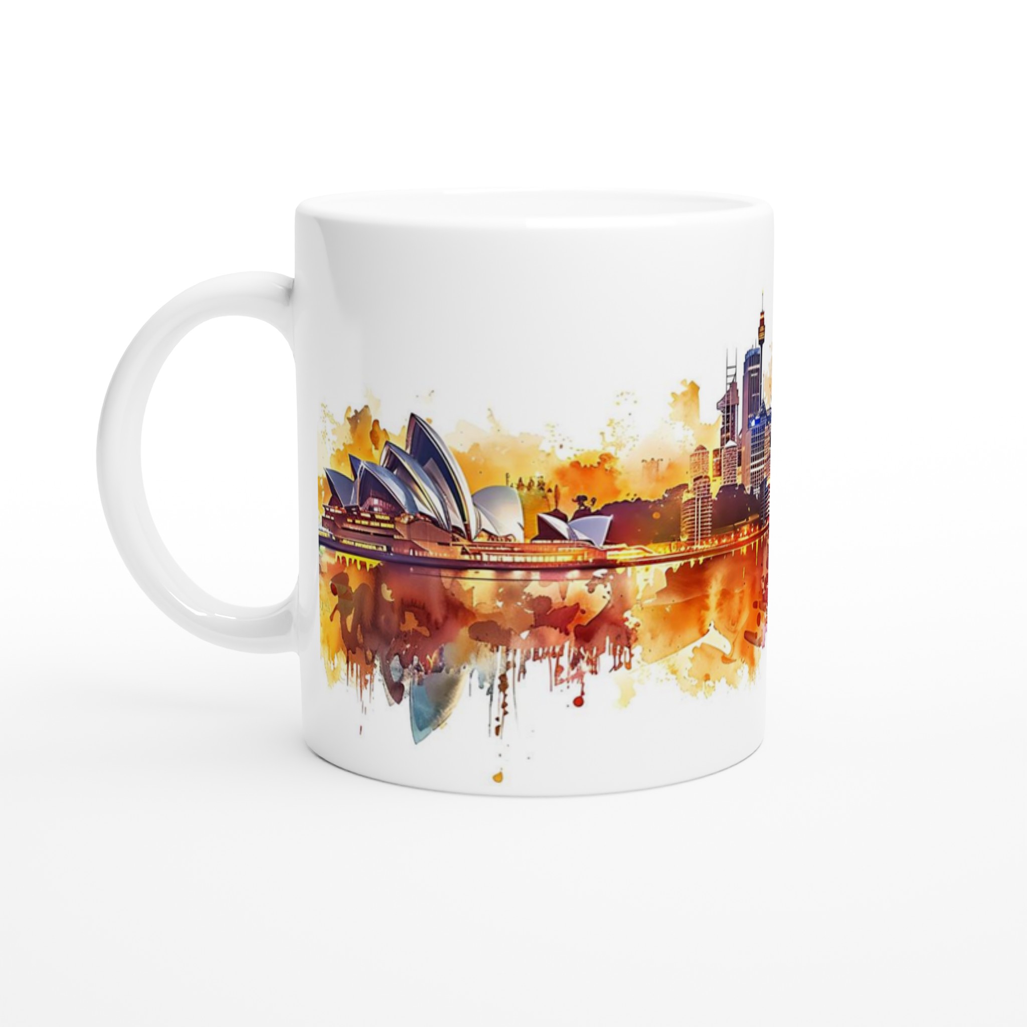 Denna unika mugg fångar den ikoniska Sydney-silhuetten i en levande akvarellstil, med varma solnedgångstoner som möter svala blå nyanser över vattnet. Den blanka vita ytan ger ett skarpt och levande tryck som verkligen sticker ut, oavsett om det är en personlig design, ett roligt citat eller en present till någon du tycker om. Välj bland en palett av sju distinkta färger – Ceramic White, Yellow, Pink, Green, Red, Black, eller Blue – för att matcha din stil eller inredning perfekt. Varje mugg blir en personlig hyllning till stadens magi och din unika smak.