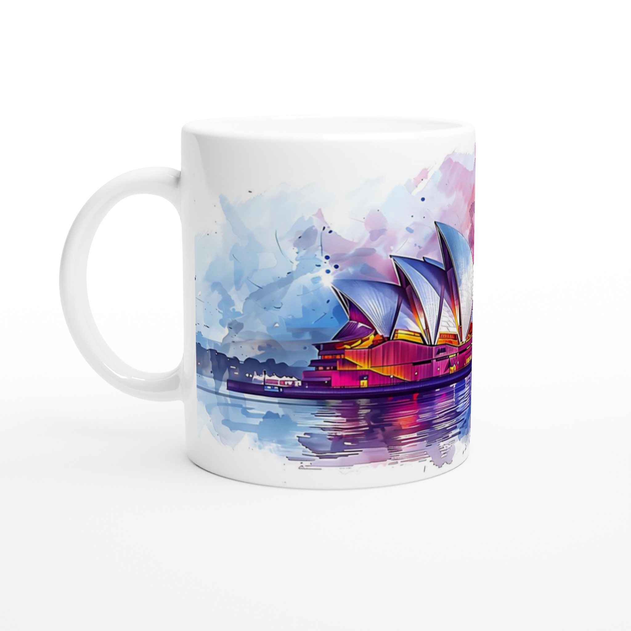 Denna mugg fångar den ikoniska Sydneyoperan i en explosion av akvarellfärger, där pastellblått möter eldiga rött och orange i ett dynamiskt skimmer över vattnet. Den blanka vita ytan ger ett skarpt och levande tryck som verkligen sticker ut, oavsett om det är en personlig design, ett roligt citat eller en present till någon du tycker om.