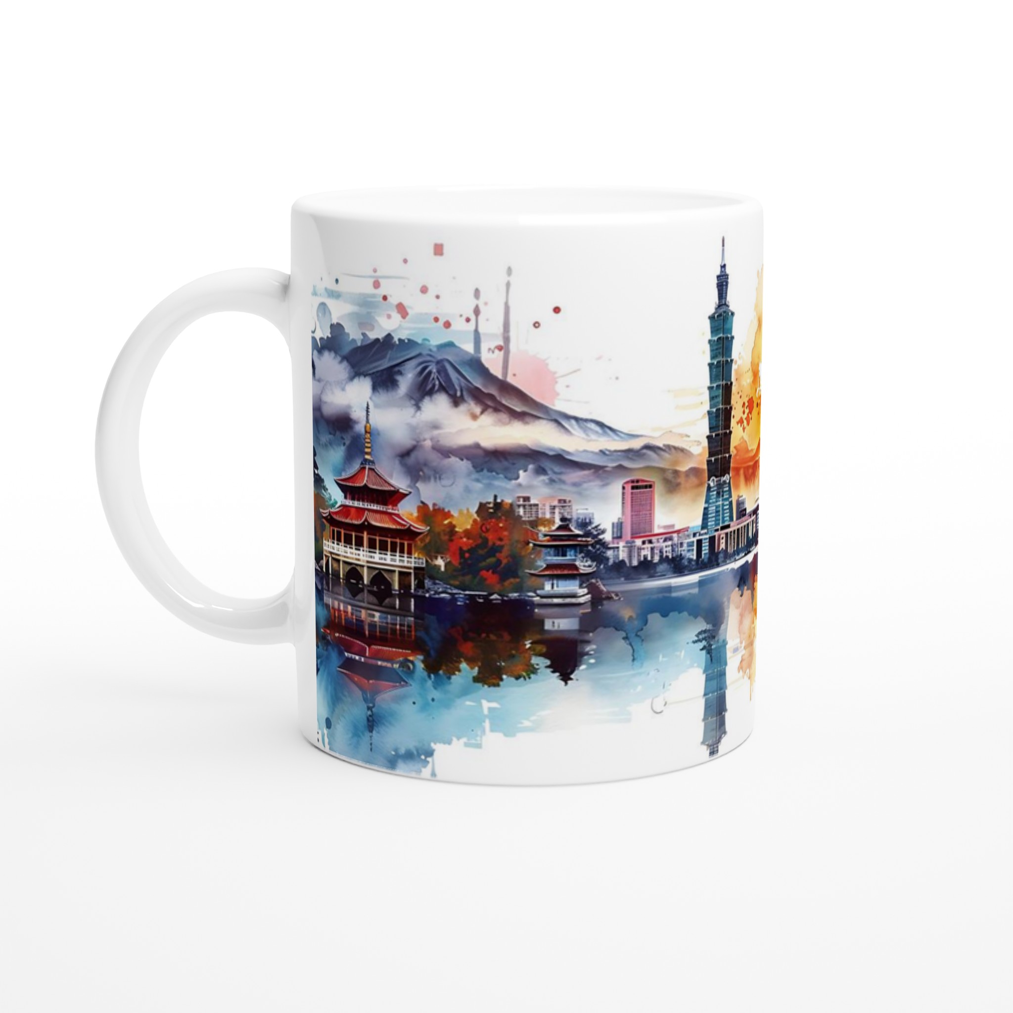 Inspirerad av Taiwans majestätiska landskap och den dynamiska arkitekturen i Taipei, fångar denna unika akvarelldesign stadens pulserande energi och naturens lugn. Den blanka vita ytan ger ett skarpt och levande tryck som verkligen sticker ut, oavsett om det är en personlig design, ett roligt citat eller en present till någon du tycker om.