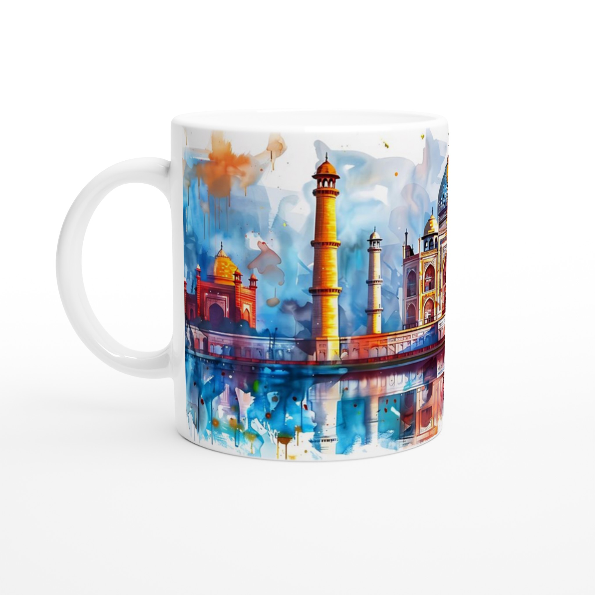 Inspirerad av den majestätiska Taj Mahal vid solnedgången, fångar denna mugg en färgsprakande akvarellkänsla med varma orangea och lugnande blå nyanser. Den blanka vita ytan ger ett skarpt och levande tryck som verkligen sticker ut, oavsett om det är en personlig design, ett roligt citat eller en present till någon du tycker om.
