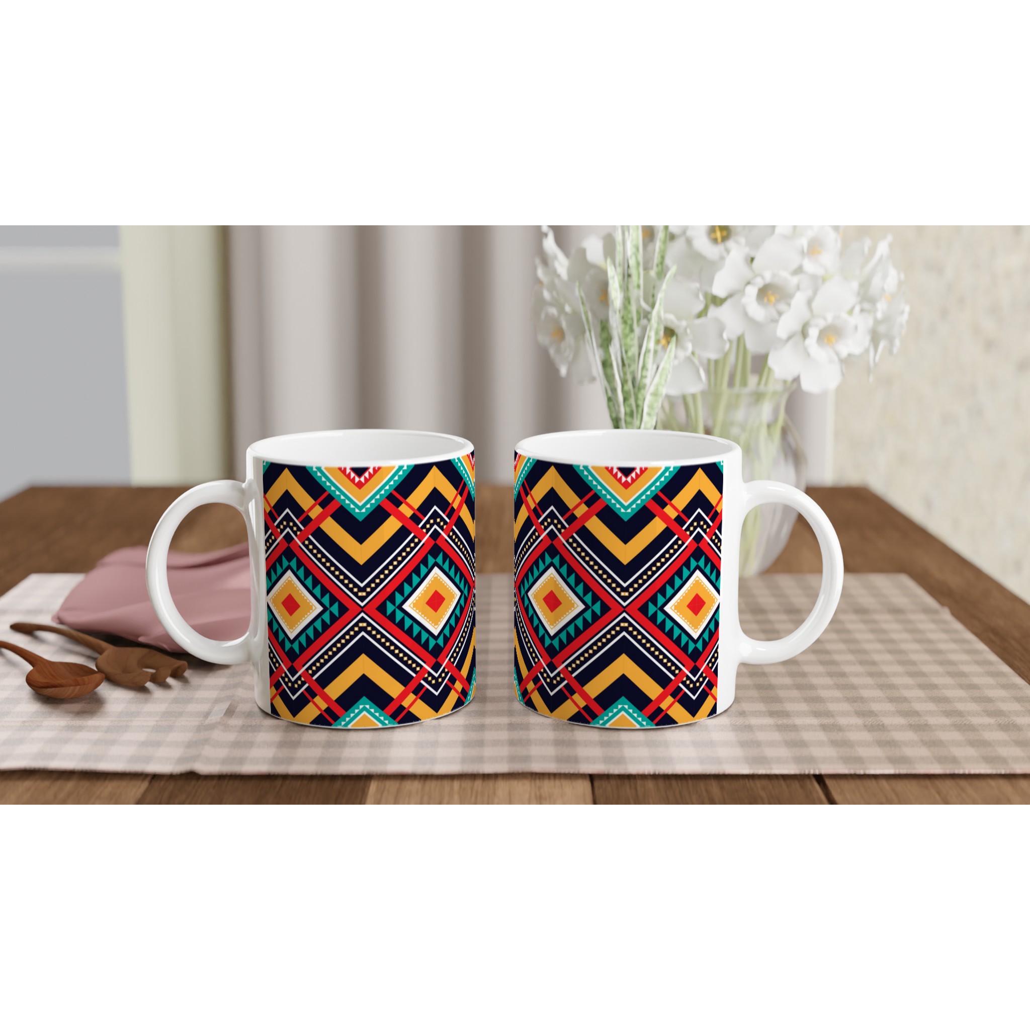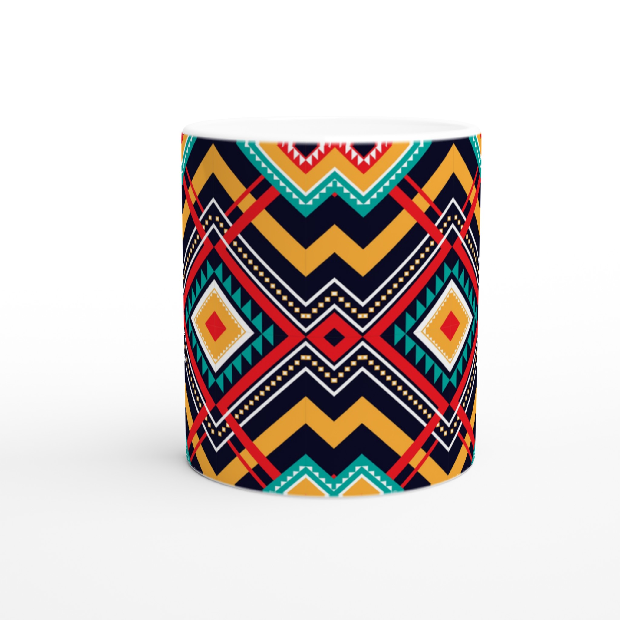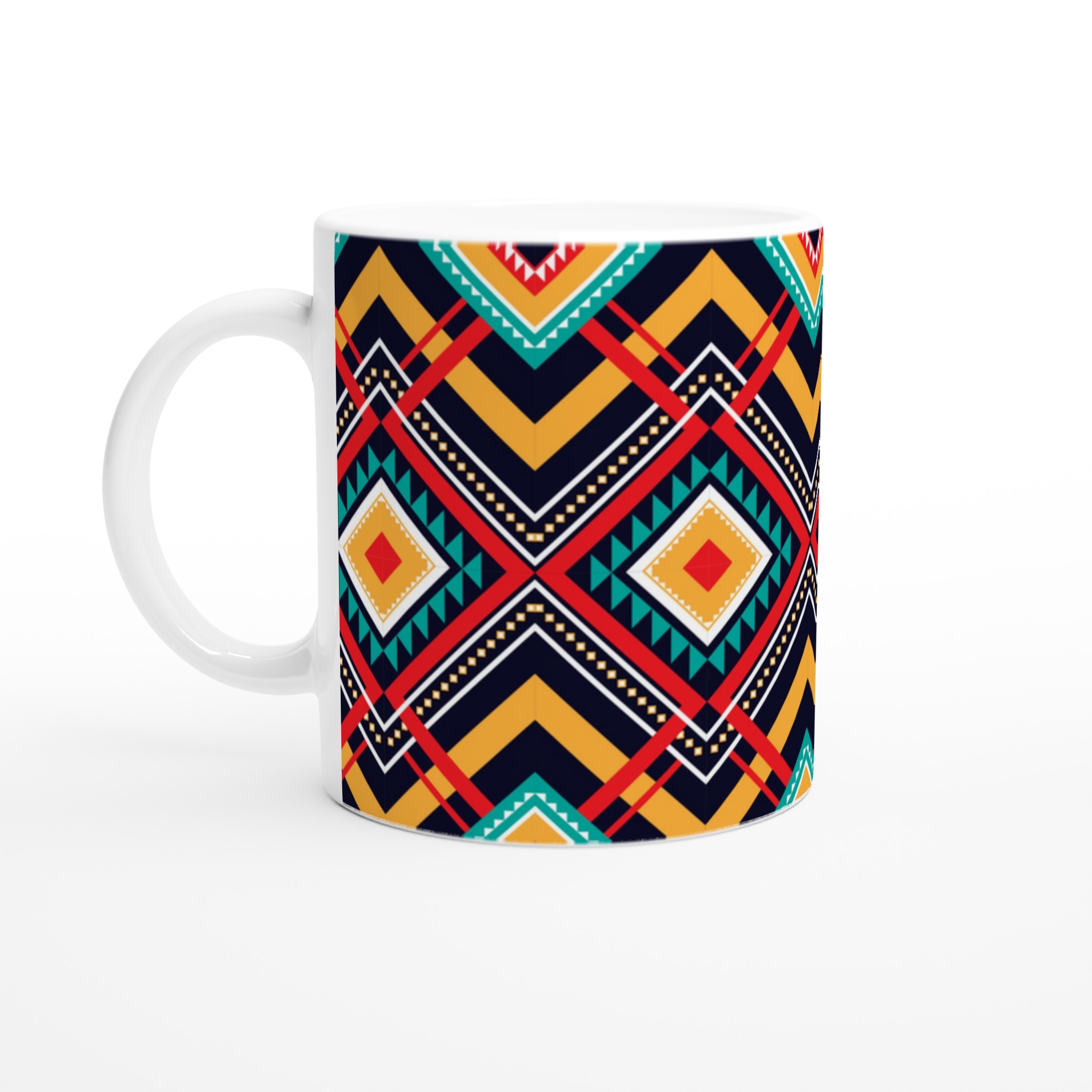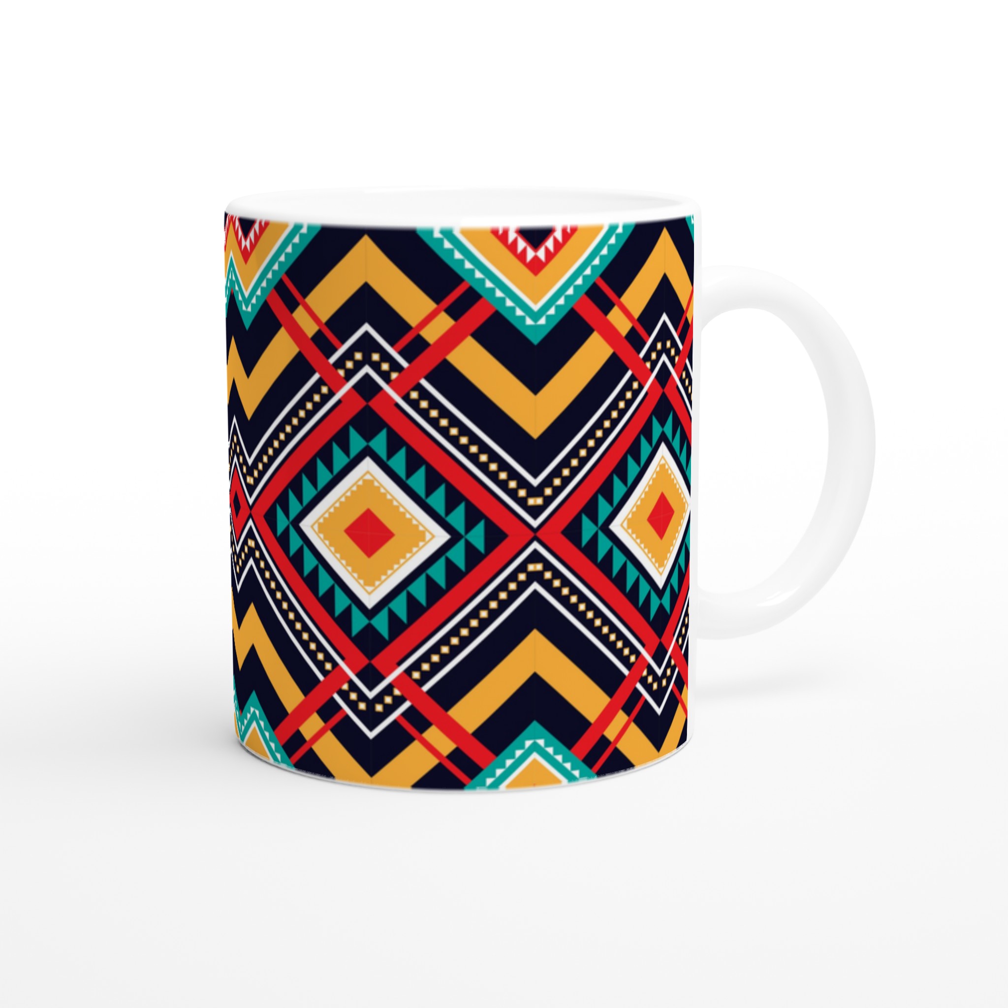 Fånga den livfulla energin med vår Tribal Chic Keramiska Mugg, som pryds av ett intrikat geometriskt mönster i djärva nyanser av rött, turkos, gult och vitt mot en elegant marinblå bakgrund. Denna mugg är mer än bara en dryckesbehållare; den är ett konstverk som lyfter varje fika med sin unika och etniskt inspirerade design.