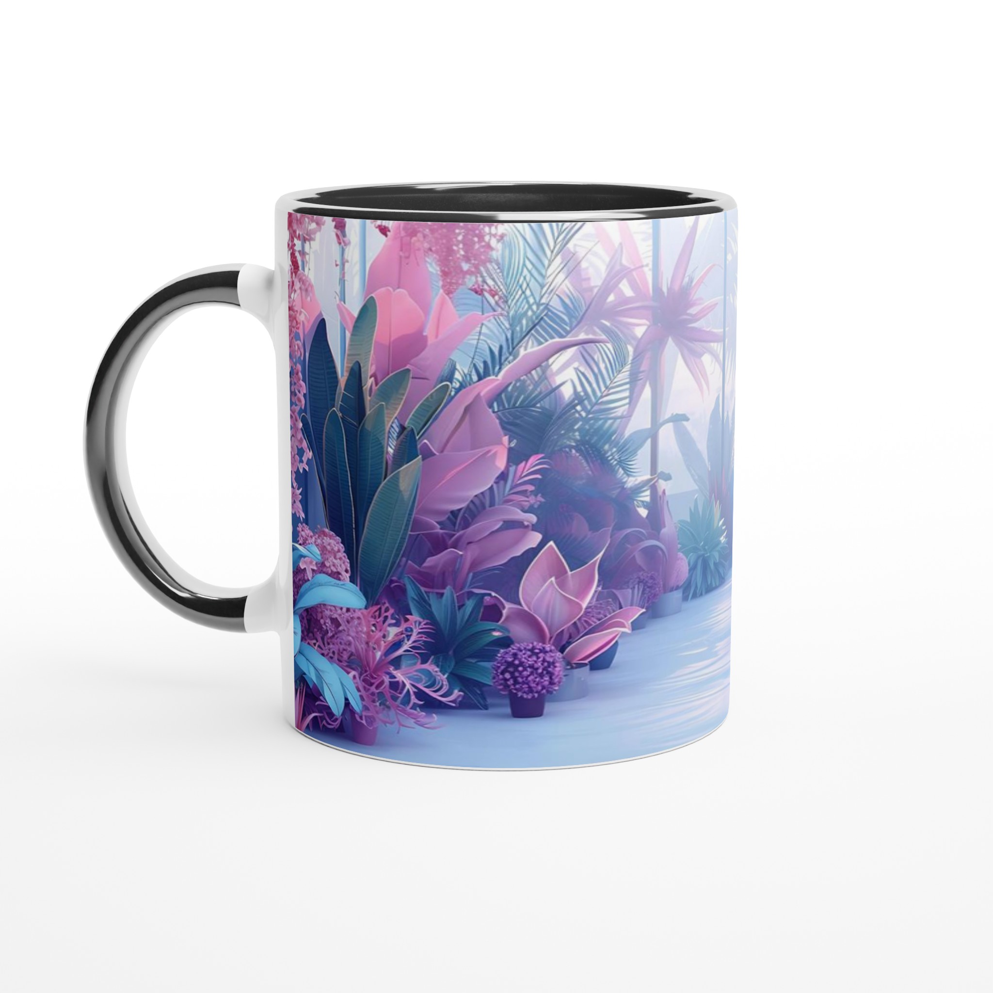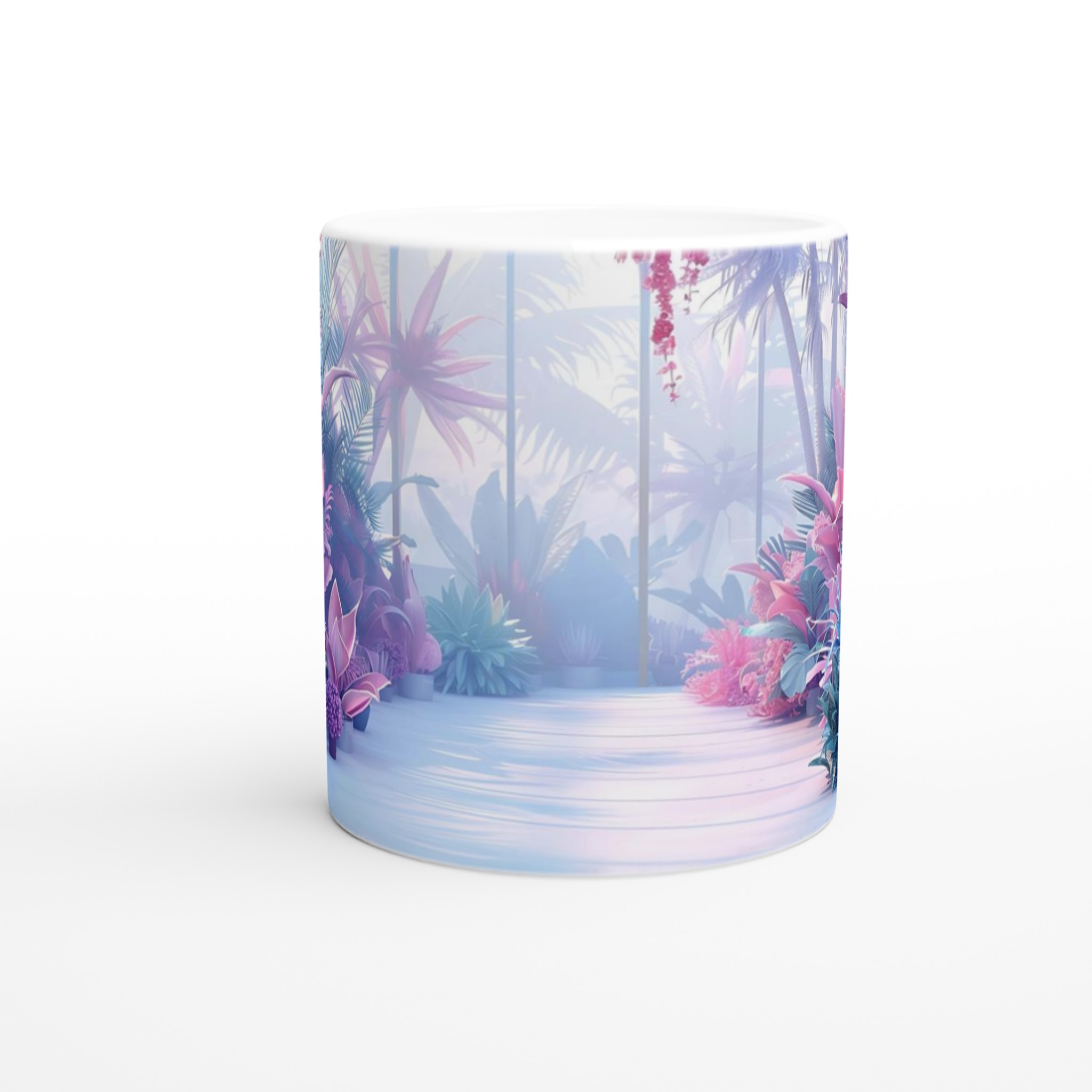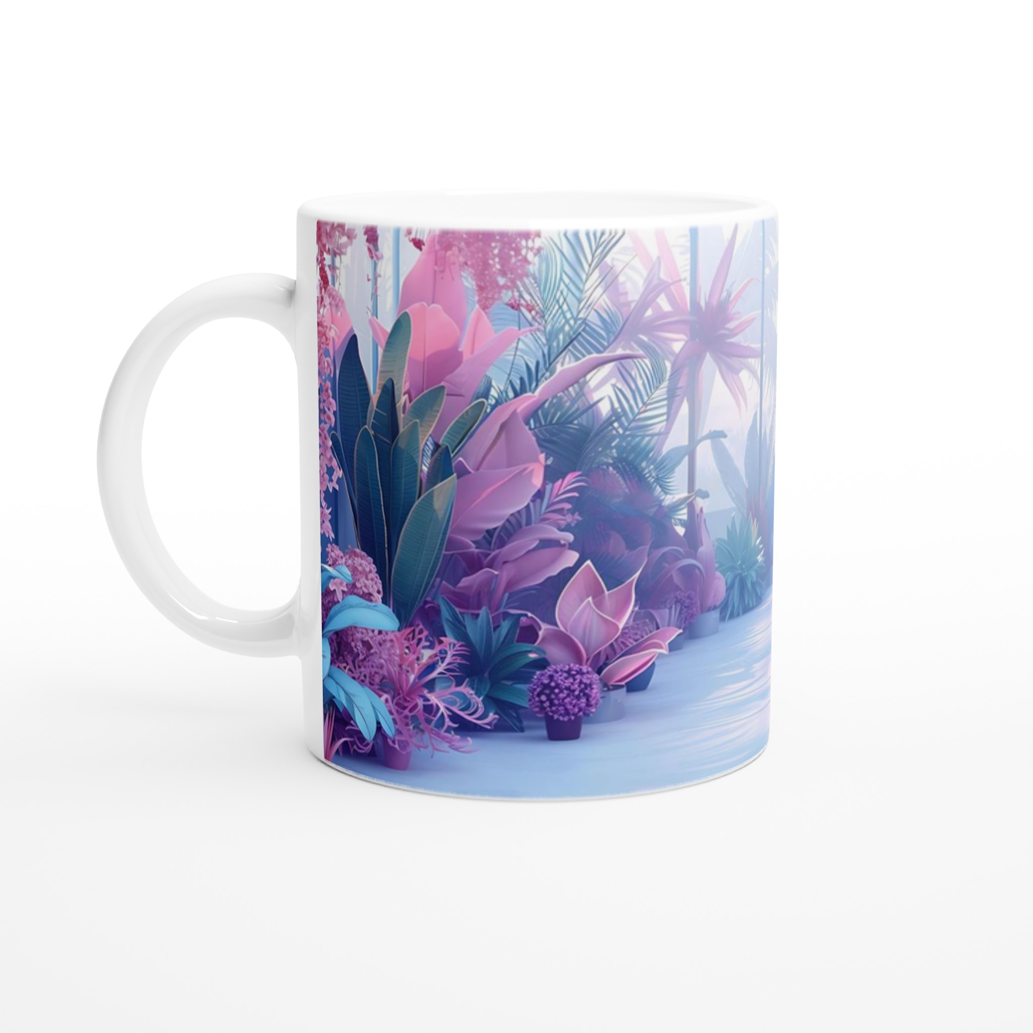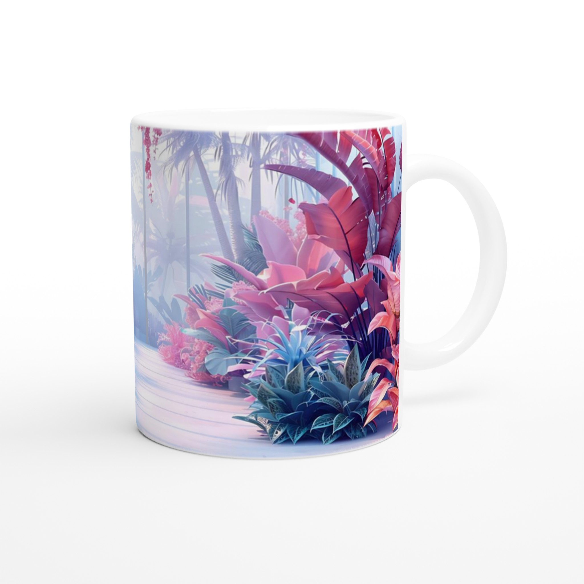 Föreställ dig att du sippar ditt morgonkaffe omgiven av en drömlik, tropisk trädgård i pastelltoner. Denna stilrena keramiska mugg förvandlar varje dryckesstund till en liten flykt från vardagen. Inspirerad av bilden med dess lila, rosa och blå blomsterprakt, ger denna mugg en lugnande och estetiskt tilltalande känsla till din rutin. Den blanka vita ytan låter trycken framträda med klara och levande färger, som håller sig fina även efter många turer i mikron och diskmaskinen.