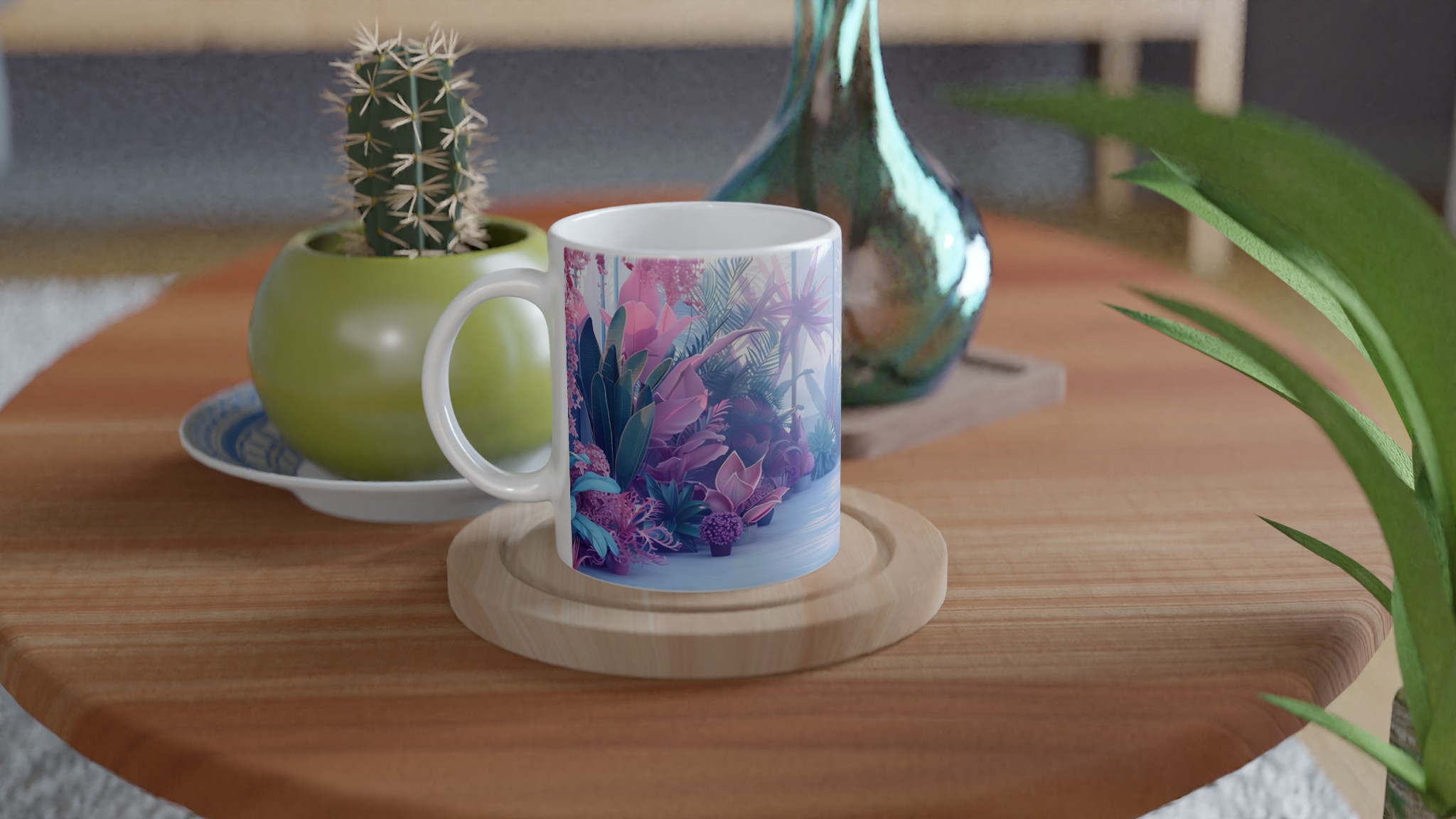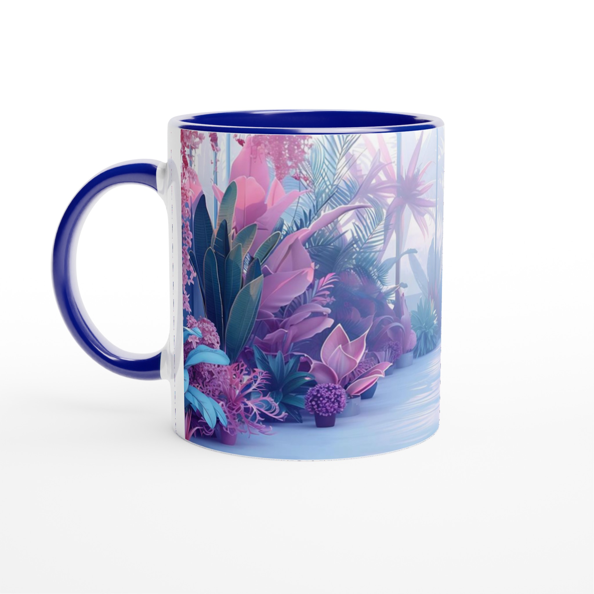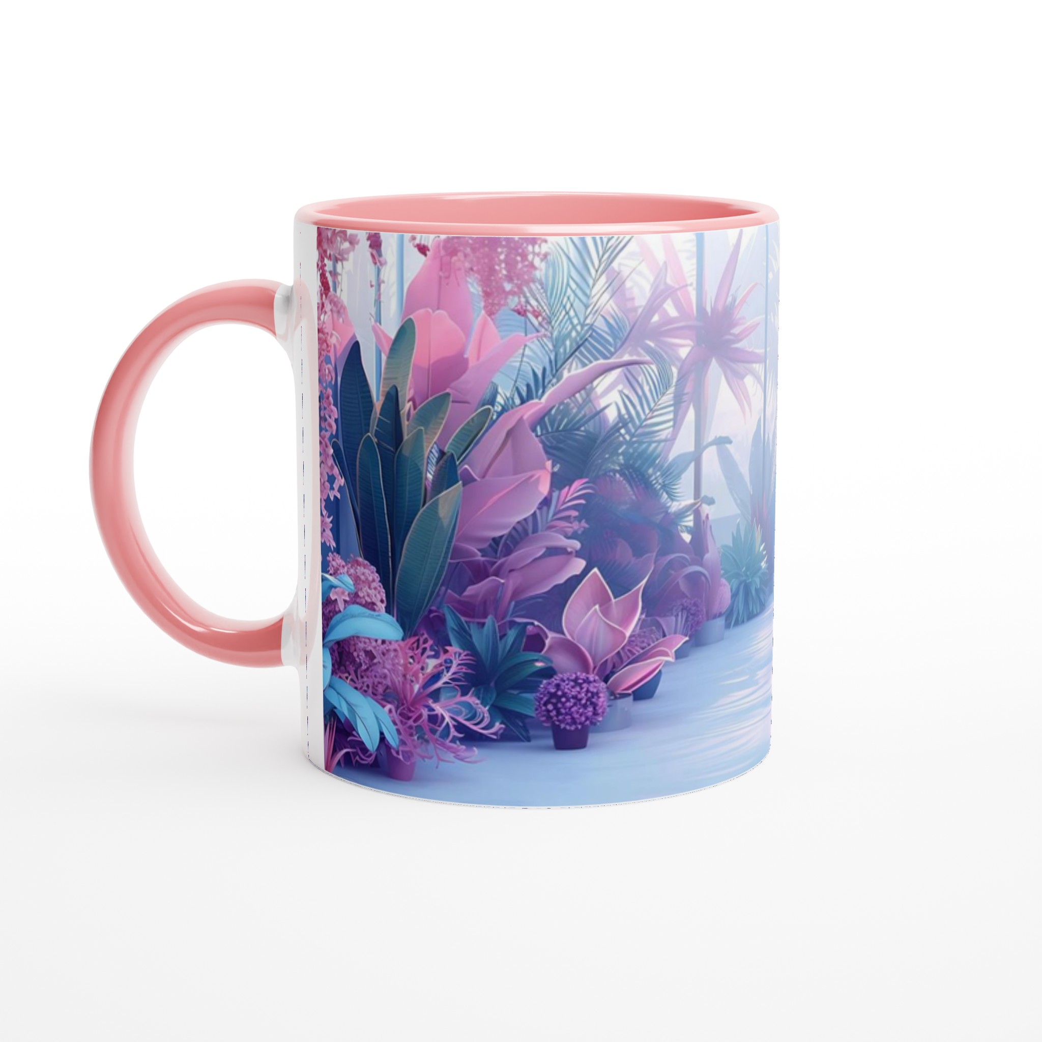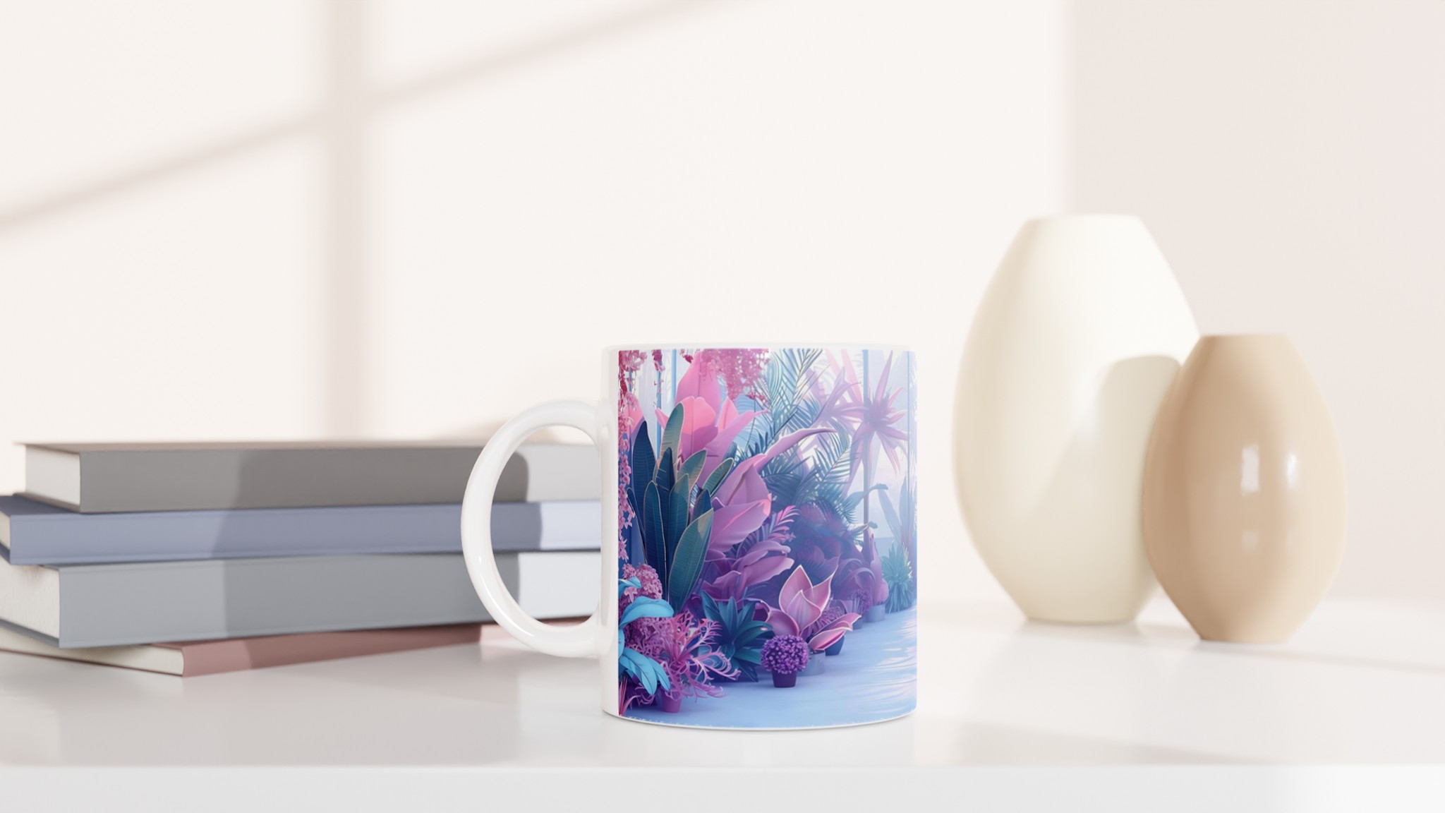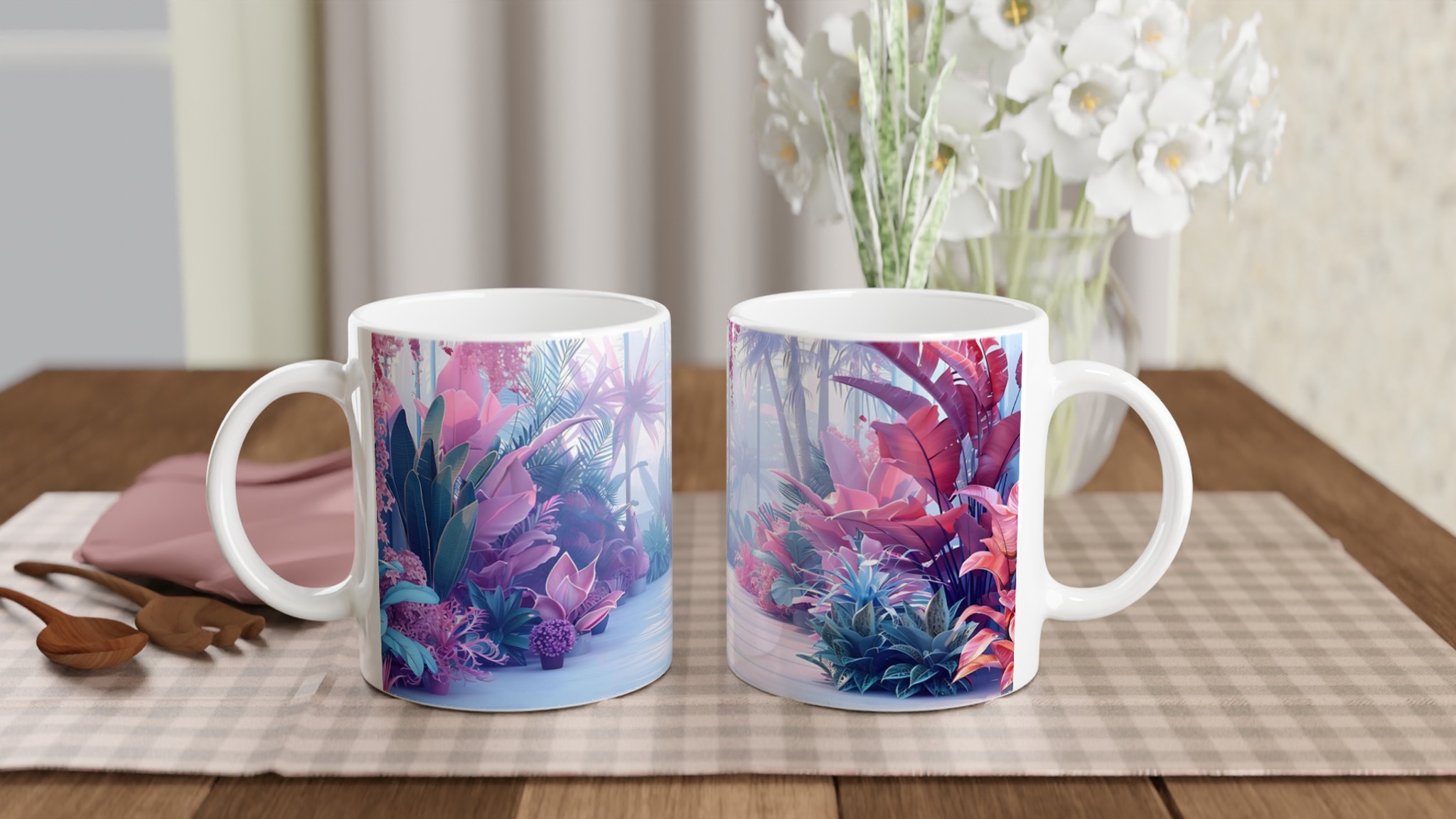 Föreställ dig att du sippar ditt morgonkaffe omgiven av en drömlik, tropisk trädgård i pastelltoner. Denna stilrena keramiska mugg förvandlar varje dryckesstund till en liten flykt från vardagen. Inspirerad av bilden med dess lila, rosa och blå blomsterprakt, ger denna mugg en lugnande och estetiskt tilltalande känsla till din rutin. Den blanka vita ytan låter trycken framträda med klara och levande färger, som håller sig fina även efter många turer i mikron och diskmaskinen.