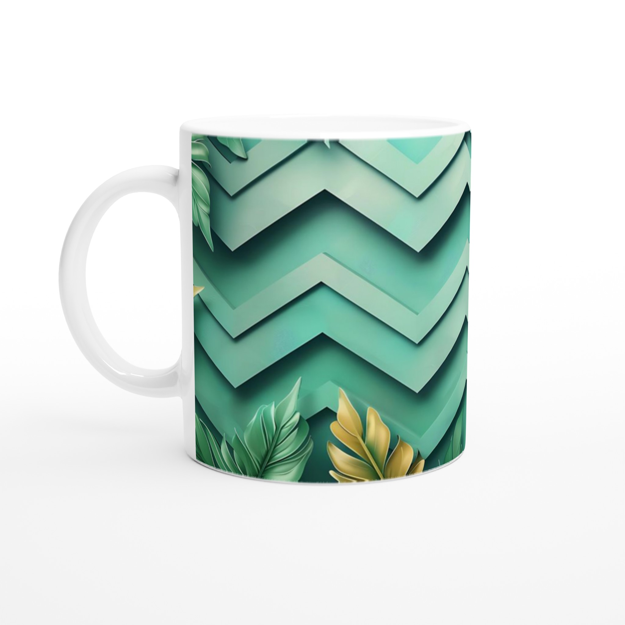 Lyft varje kaffestund med vår premium keramikmugg – stilren, hållbar och skapad för att låta ditt motiv glänsa. Inspirerad av tropiska paradis och geometrisk elegans, ger denna mugg en känsla av lugn och stil till din dryckesupplevelse. Den livfulla illustrationen av gyllene och gröna löv mot en turkos chevronbakgrund gör varje klunk till en liten semester.