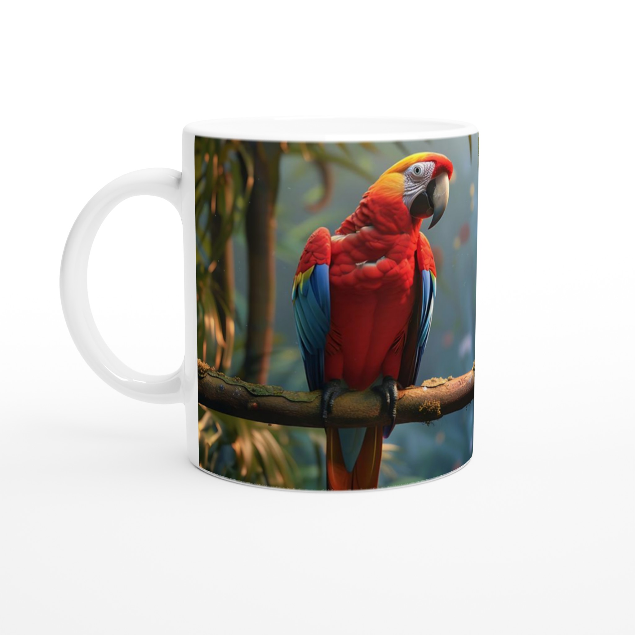 Förvandla varje klunk till en exotisk flykt med vår premium keramikmugg, designad för att fånga djungelns livfulla skönhet och låta ditt motiv glänsa. Inspirerad av den majestätiska papegojan bland tropiska blommor, blir denna mugg ett konstverk i din hand. Den blanka vita ytan ger ett skarpt och levande tryck som verkligen sticker ut, oavsett om det är en personlig design, ett roligt citat eller en present till någon du tycker om.