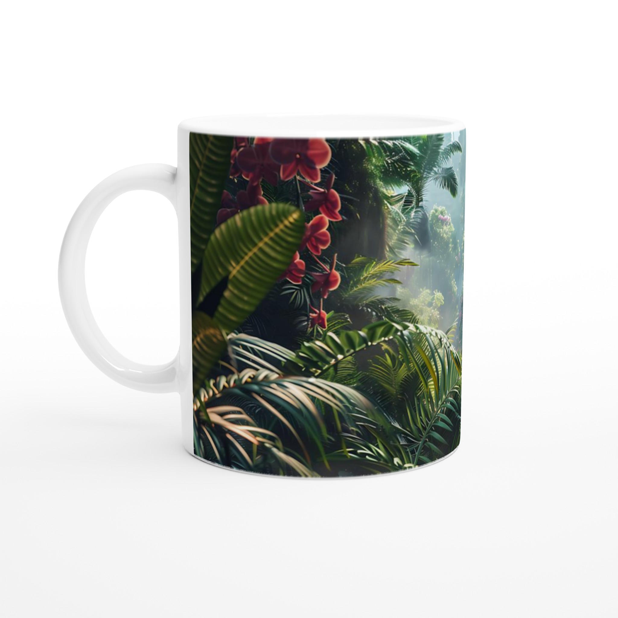Inspirerad av den frodiga mystiken i en tropisk djungel, fångar denna mugg essensen av äventyr och avkoppling. Den blanka vita ytan ger ett skarpt och levande tryck som verkligen sticker ut, oavsett om det är en personlig design, ett roligt citat eller en present till någon du tycker om.