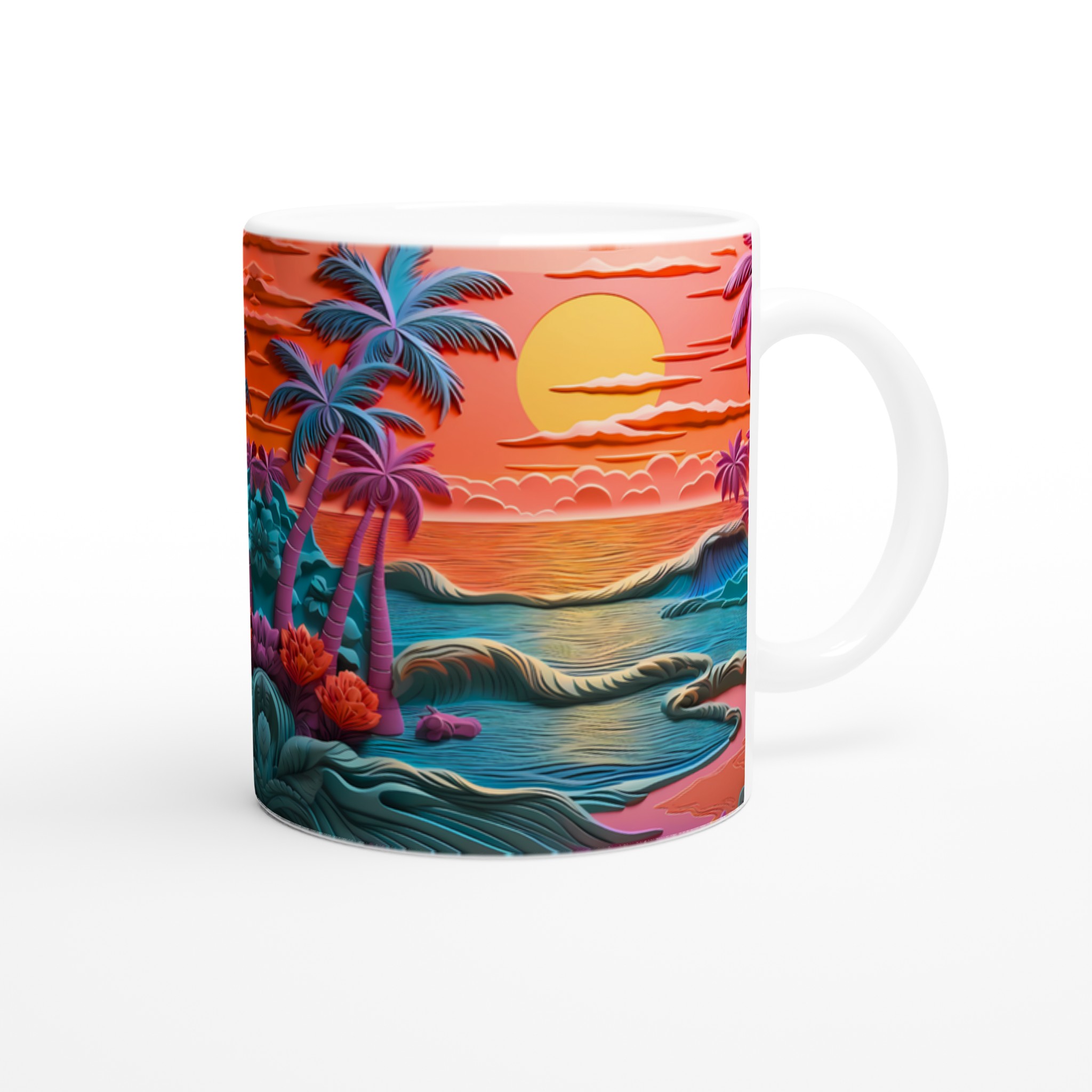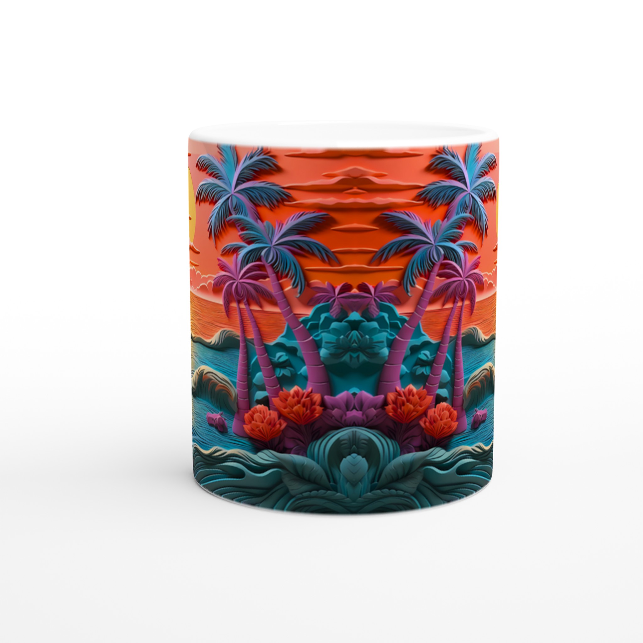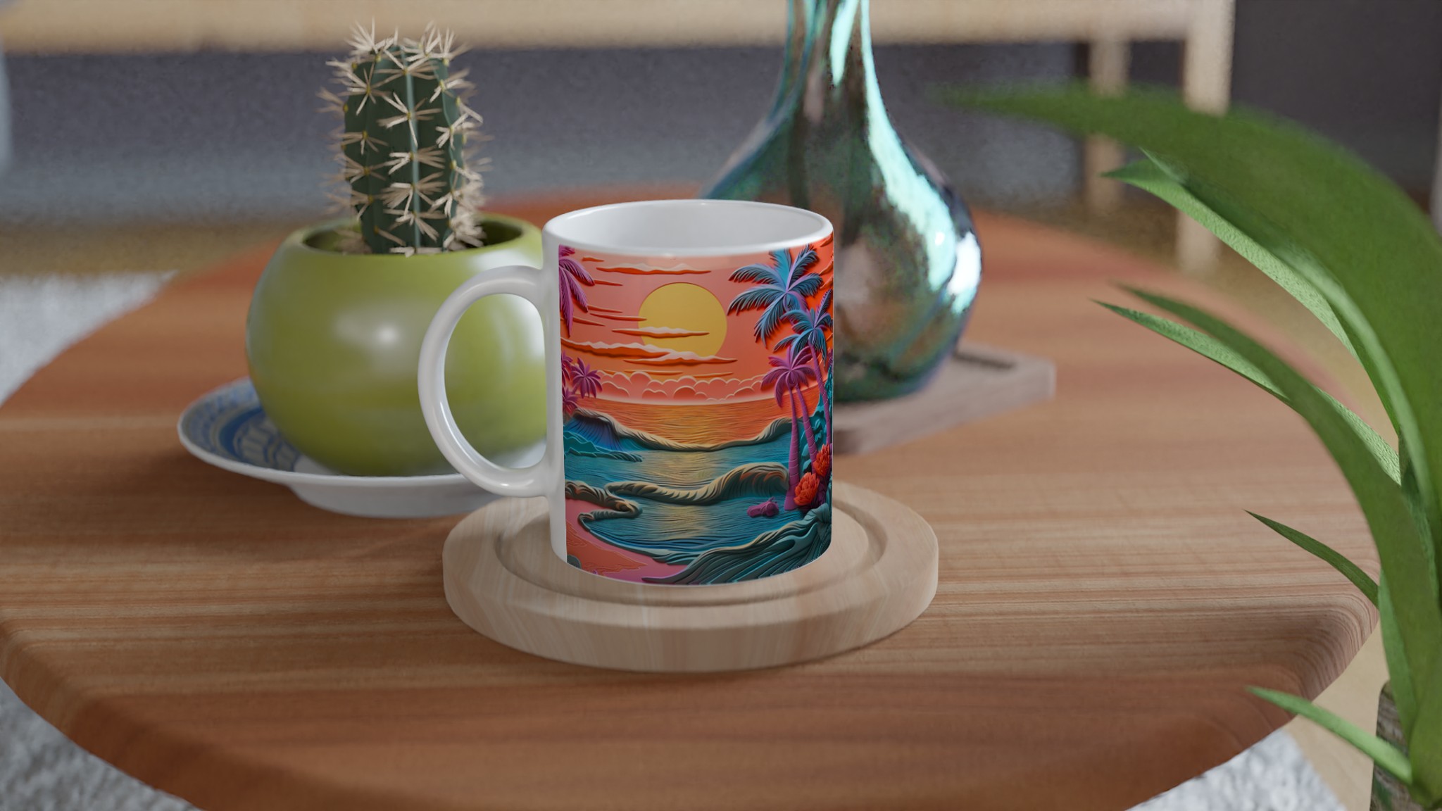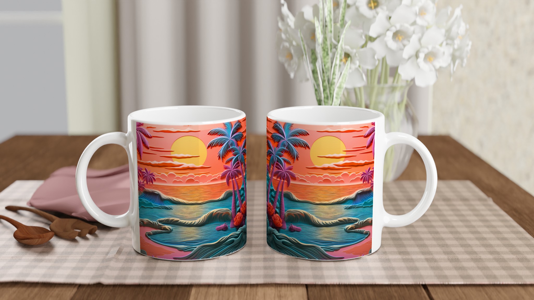 Fånga känslan av en magisk solnedgång vid en tropisk strand varje gång du tar en klunk! Den här stilrena keramiska muggen, prydd med livfulla palmträd och glödande himmel i en unik, mjuk design, blir snabbt en vardagsfavorit. Perfekt för morgonkaffet, kvällens varma choklad eller när du bara vill njuta av en kopp te. Den blanka ytan framhäver trycken med klara och levande färger, som håller sig fina även efter många turer i mikron och diskmaskinen.