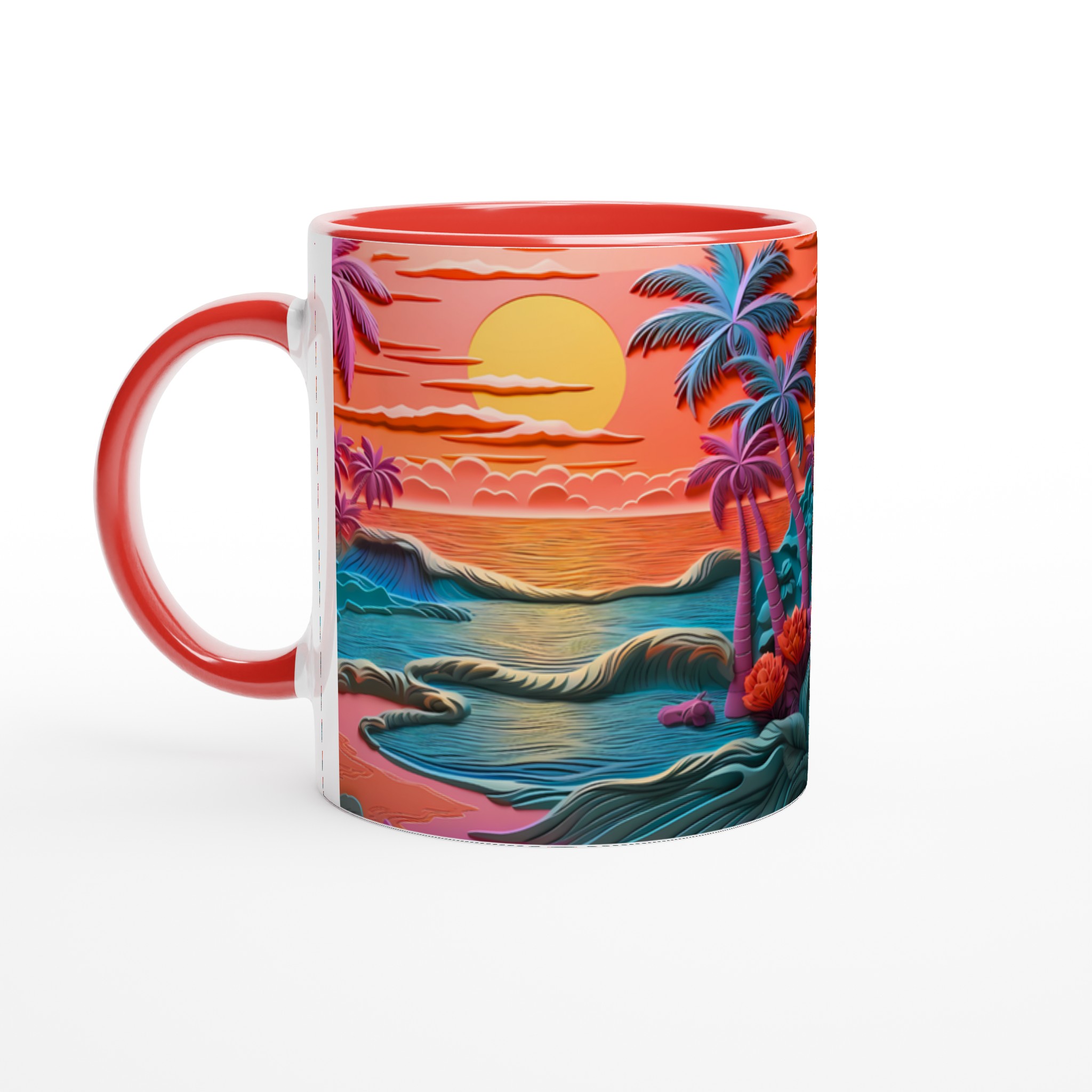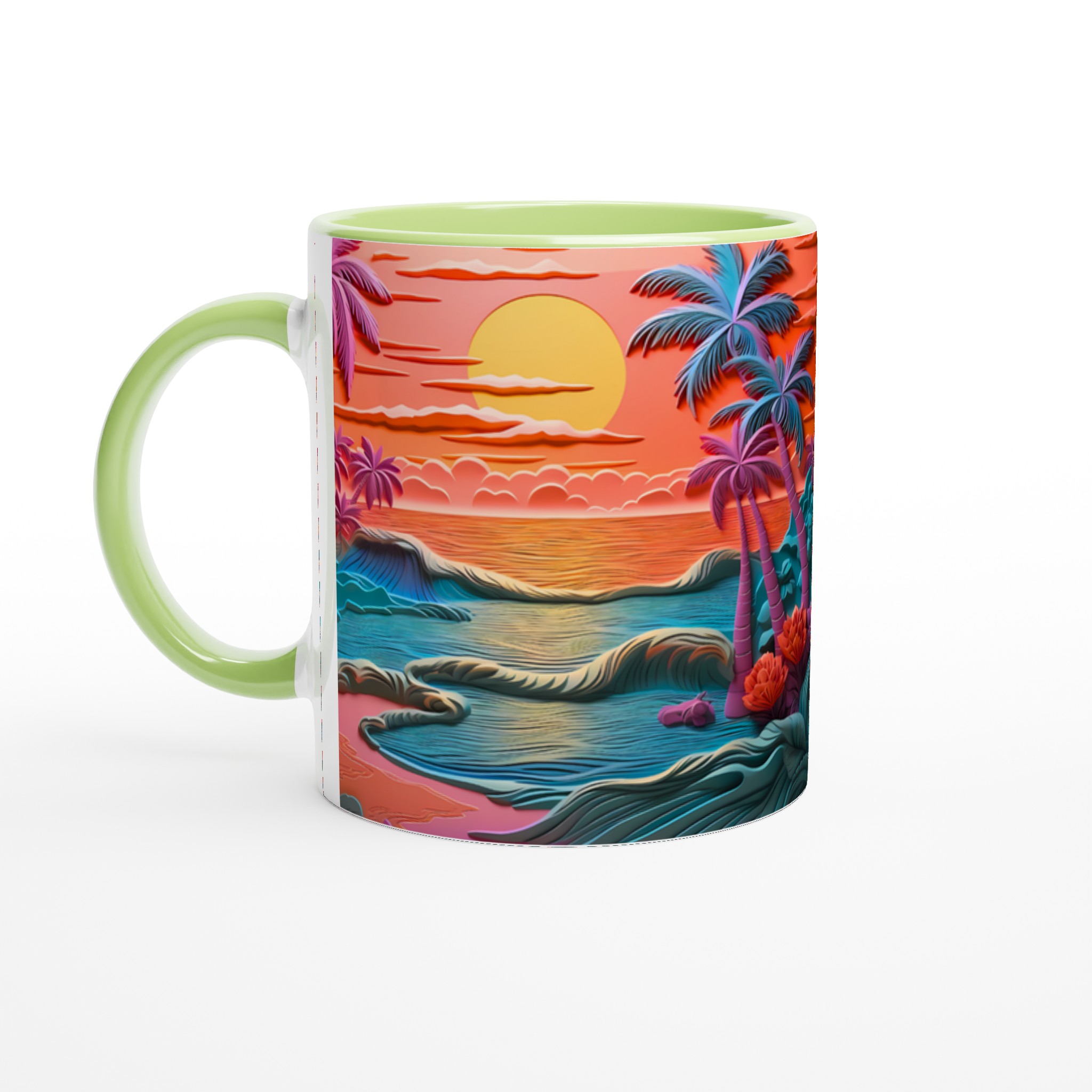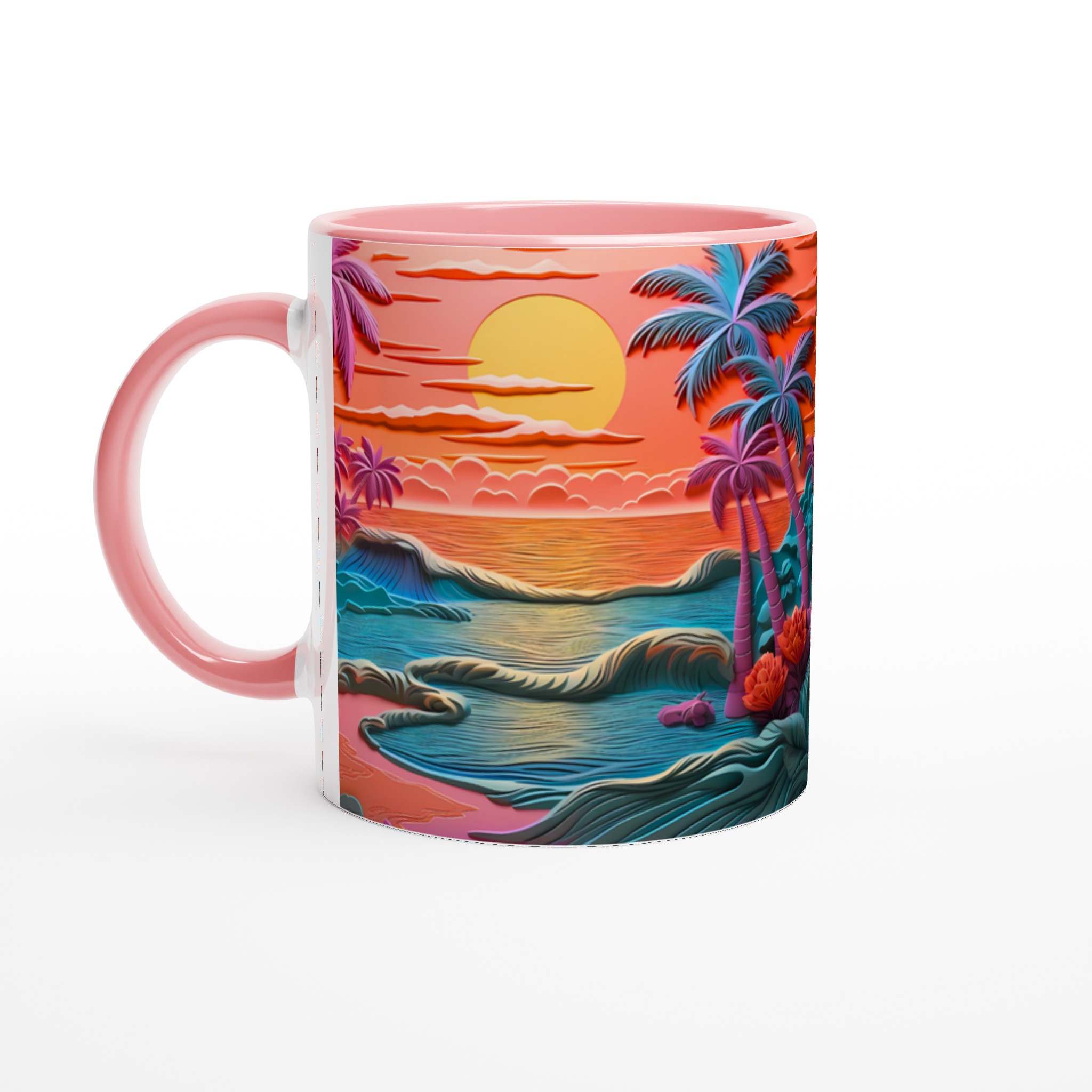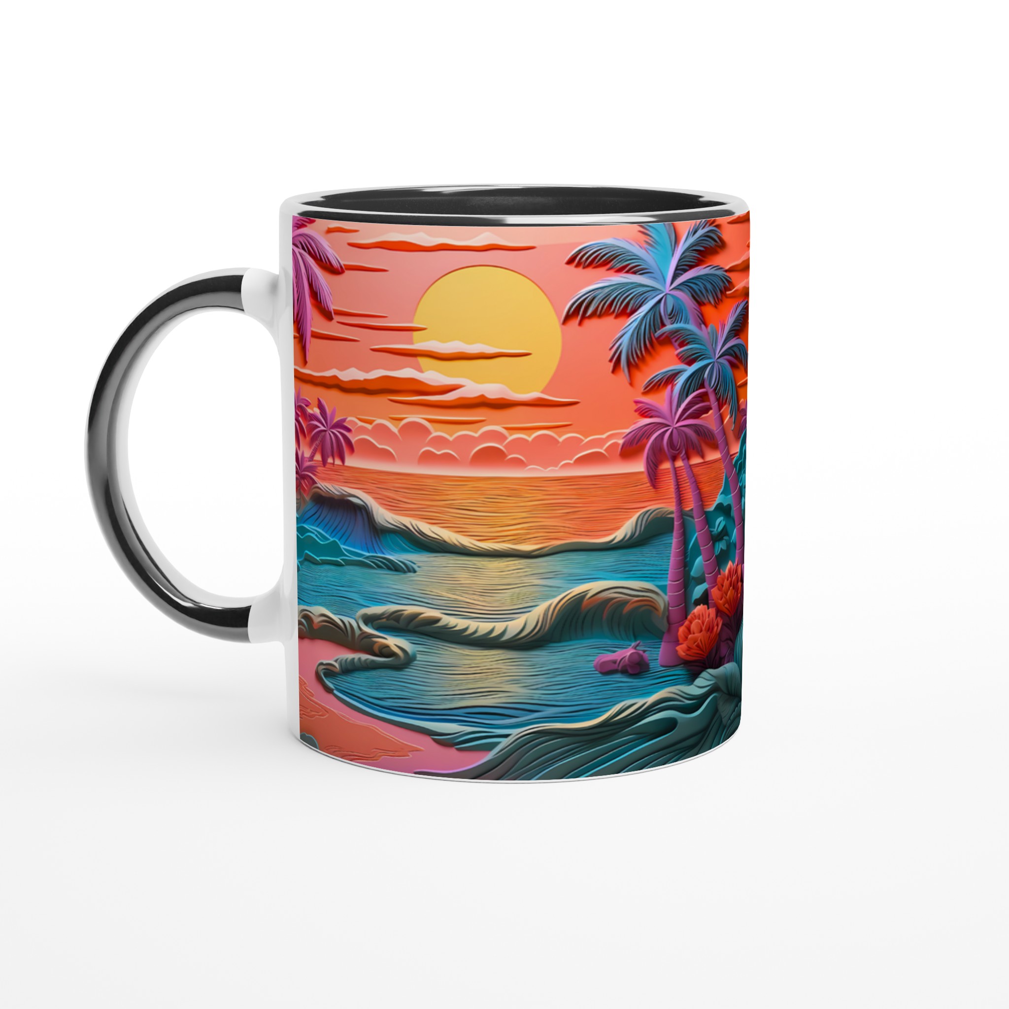 Fånga känslan av en magisk solnedgång vid en tropisk strand varje gång du tar en klunk! Den här stilrena keramiska muggen, prydd med livfulla palmträd och glödande himmel i en unik, mjuk design, blir snabbt en vardagsfavorit. Perfekt för morgonkaffet, kvällens varma choklad eller när du bara vill njuta av en kopp te. Den blanka ytan framhäver trycken med klara och levande färger, som håller sig fina även efter många turer i mikron och diskmaskinen.