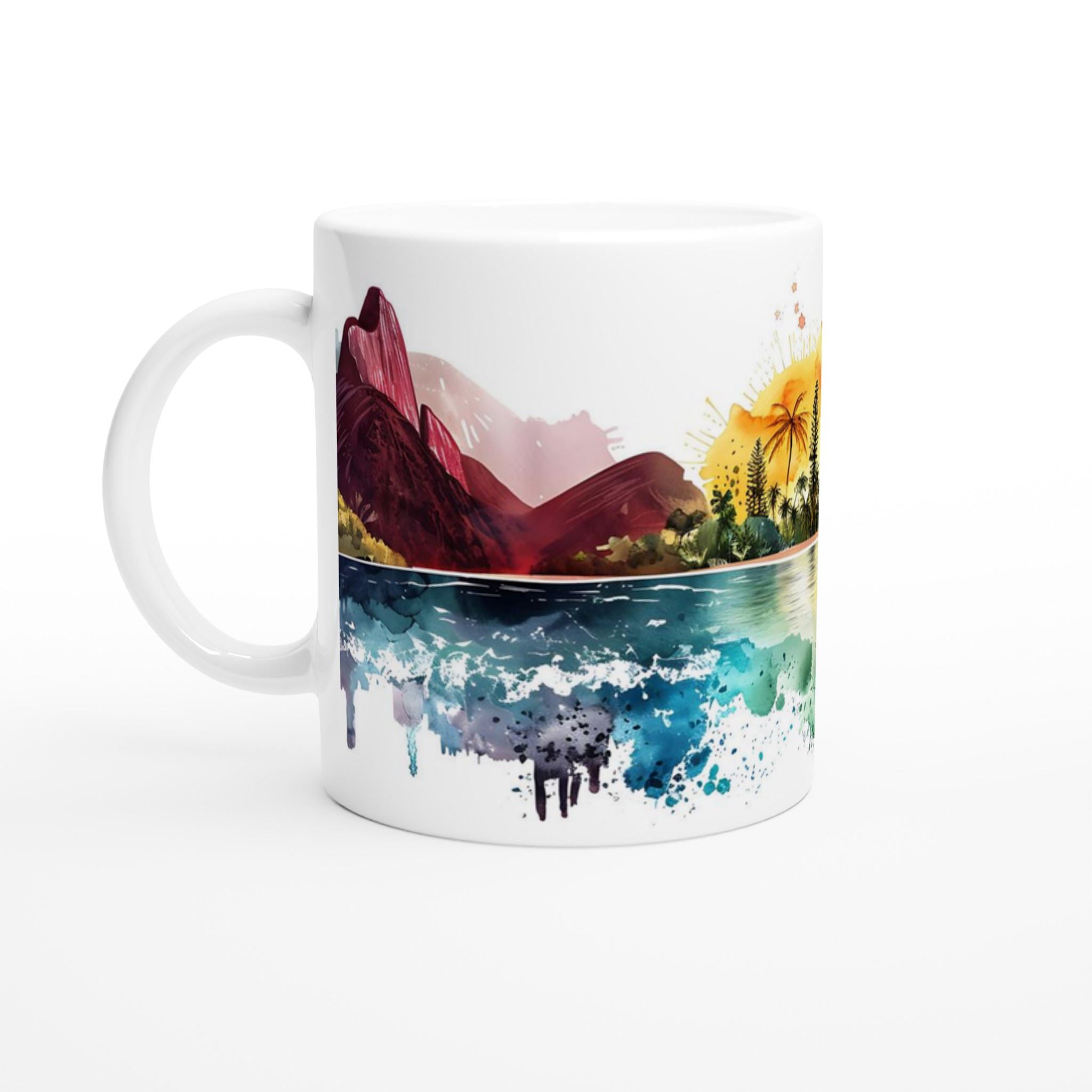 Fånga essensen av en tropisk drömvärld med vår exklusiva akvarellmugg. Denna unika design kombinerar dramatiska bergslandskap med frodiga palmträd under en glödande solnedgång, allt speglat i ett turkosblått hav. De konstnärliga akvarellstänkarna ger varje mugg en levande och dynamisk känsla som för tankarna till avlägsna paradis och lugnande vågskvalp. Det är mer än bara en mugg; det är en daglig påminnelse om skönhet och avkoppling, perfekt för konstälskaren eller den som drömmer om tropiska äventyr.