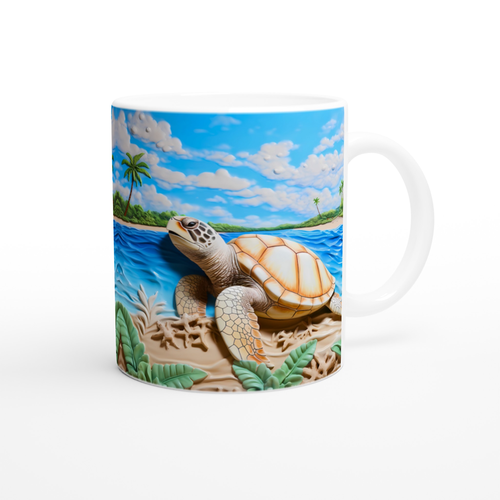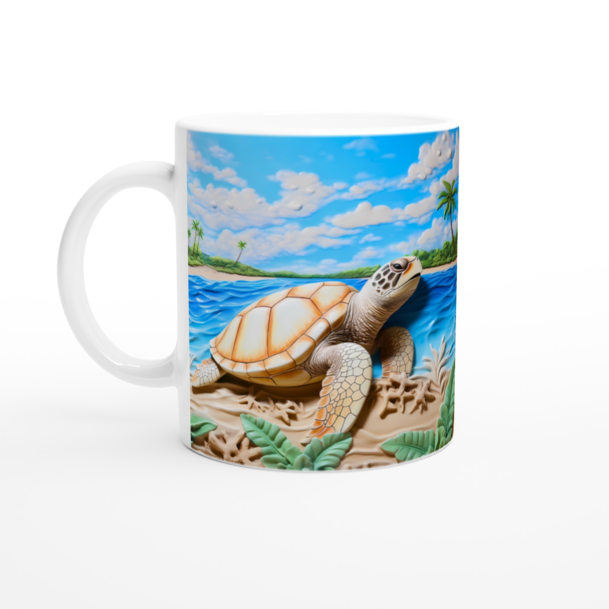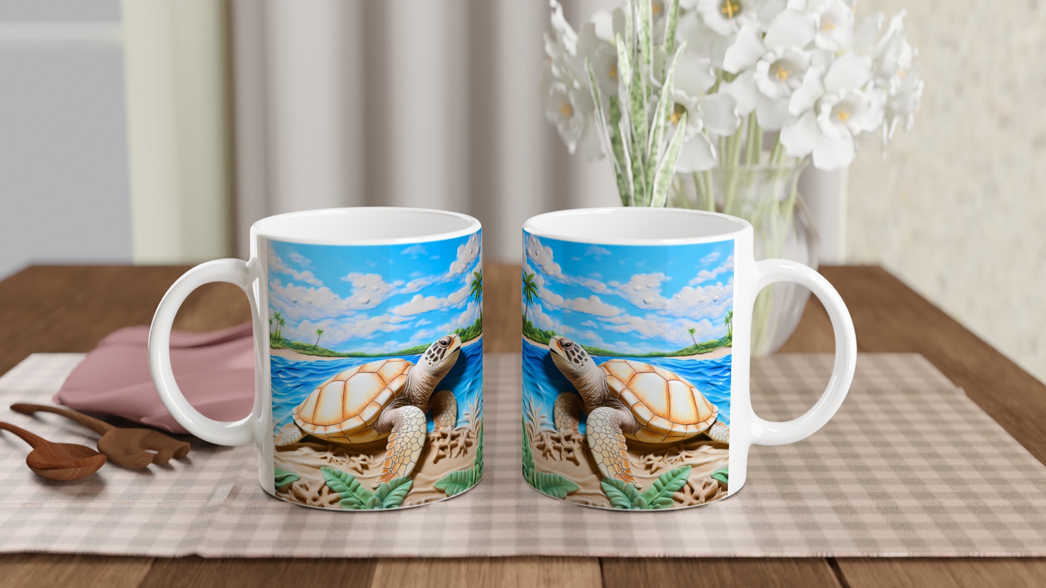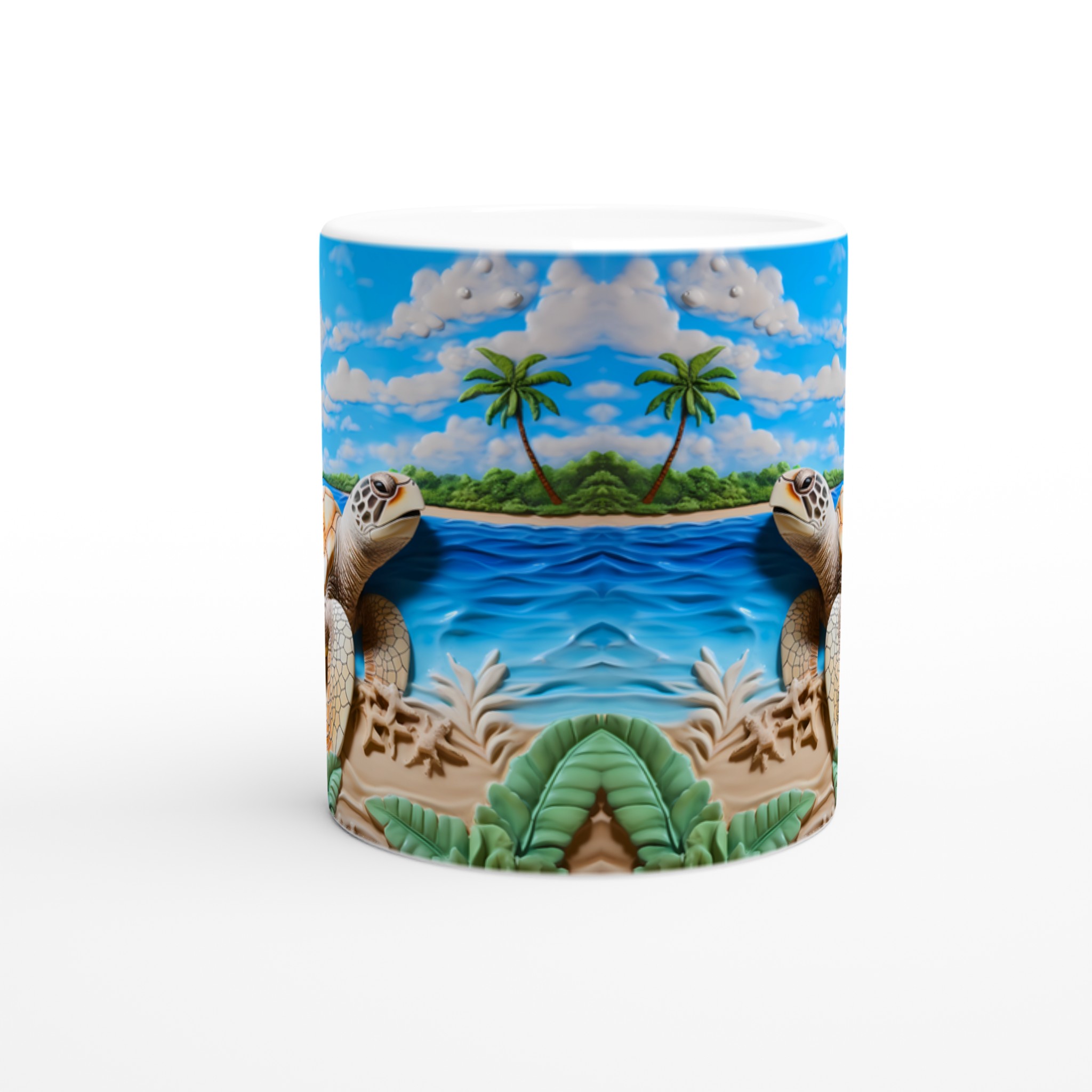 Föreställ dig en lugn tropisk strand med havssköldpaddor och vajande palmer varje gång du tar en klunk från denna unika keramiska mugg. Dess design, inspirerad av soliga stränder och det turkosa havet, för tankarna till avkoppling och äventyr. Denna stilrena mugg blir snabbt en vardagsfavorit, perfekt för morgonkaffet, kvällens varma choklad eller när du bara vill njuta av en kopp te. Den blanka vita ytan gör att trycken framhävs med klara och levande färger, som håller sig fina även efter många turer i mikron och diskmaskinen.