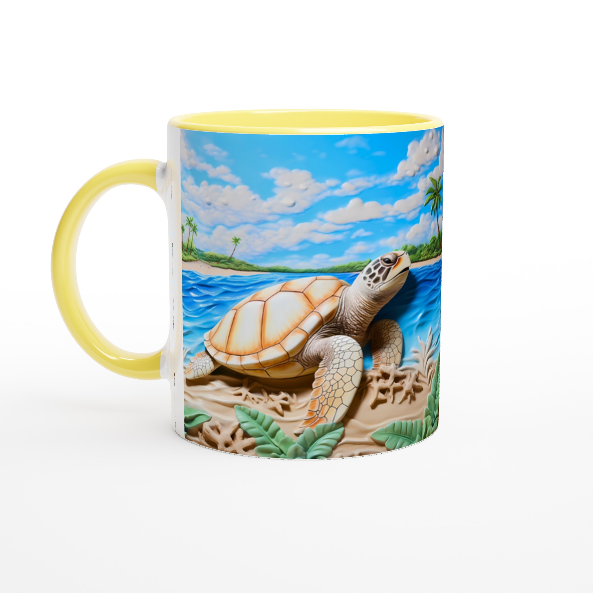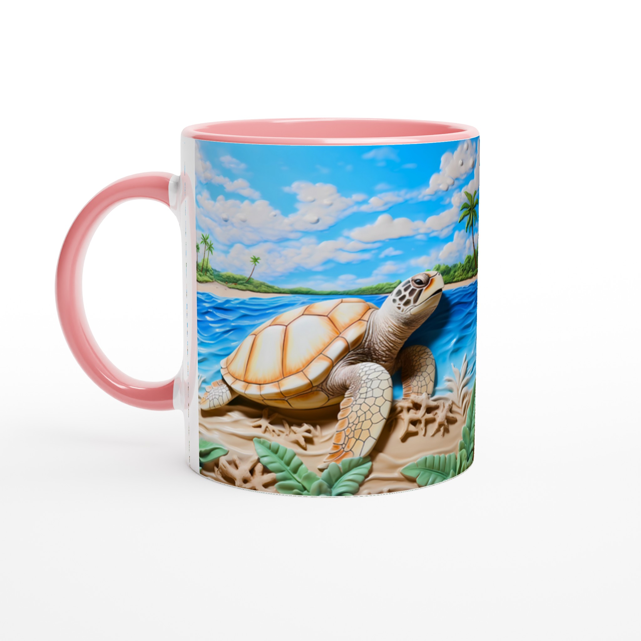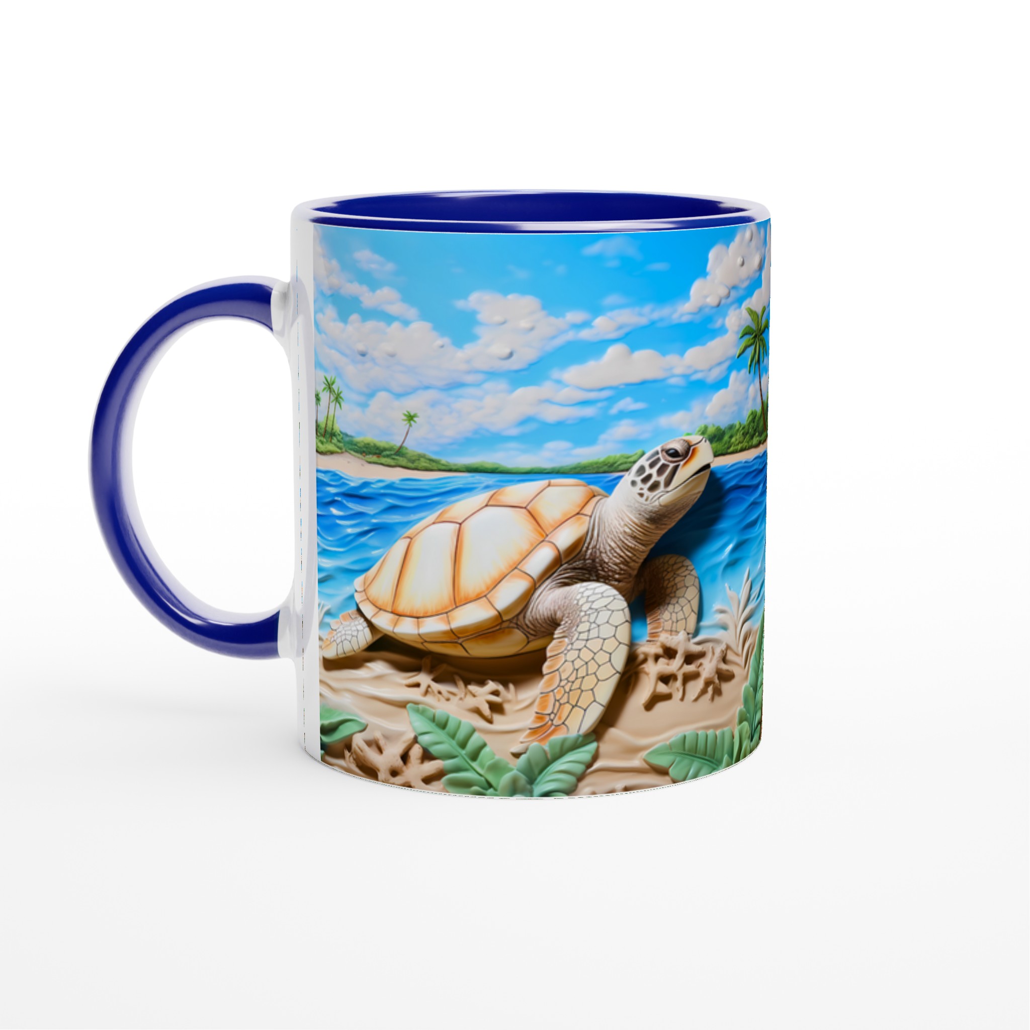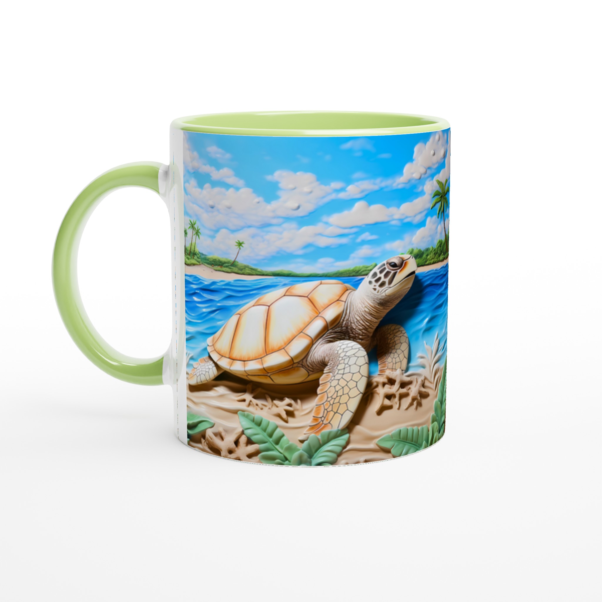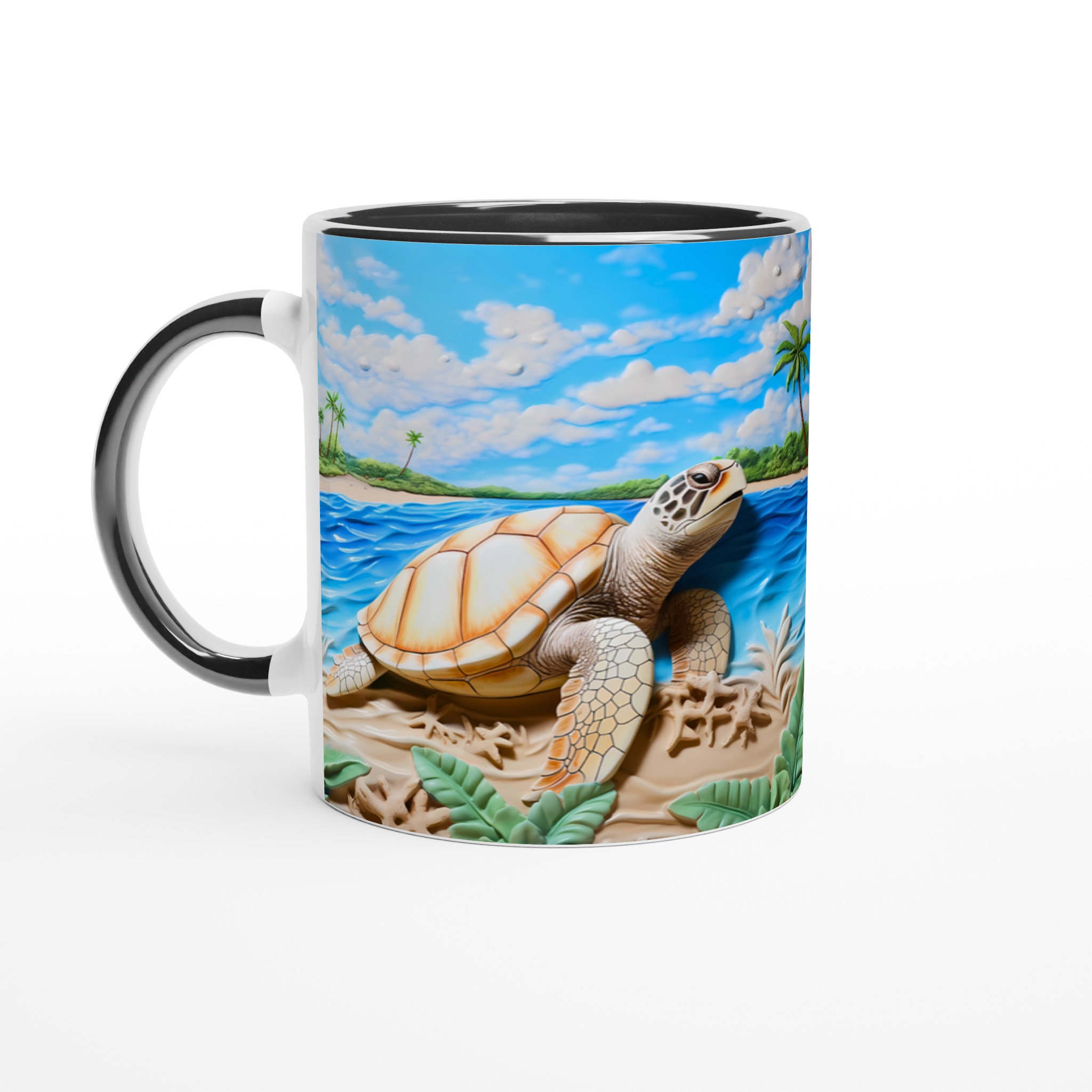 Föreställ dig en lugn tropisk strand med havssköldpaddor och vajande palmer varje gång du tar en klunk från denna unika keramiska mugg. Dess design, inspirerad av soliga stränder och det turkosa havet, för tankarna till avkoppling och äventyr. Denna stilrena mugg blir snabbt en vardagsfavorit, perfekt för morgonkaffet, kvällens varma choklad eller när du bara vill njuta av en kopp te. Den blanka vita ytan gör att trycken framhävs med klara och levande färger, som håller sig fina även efter många turer i mikron och diskmaskinen.