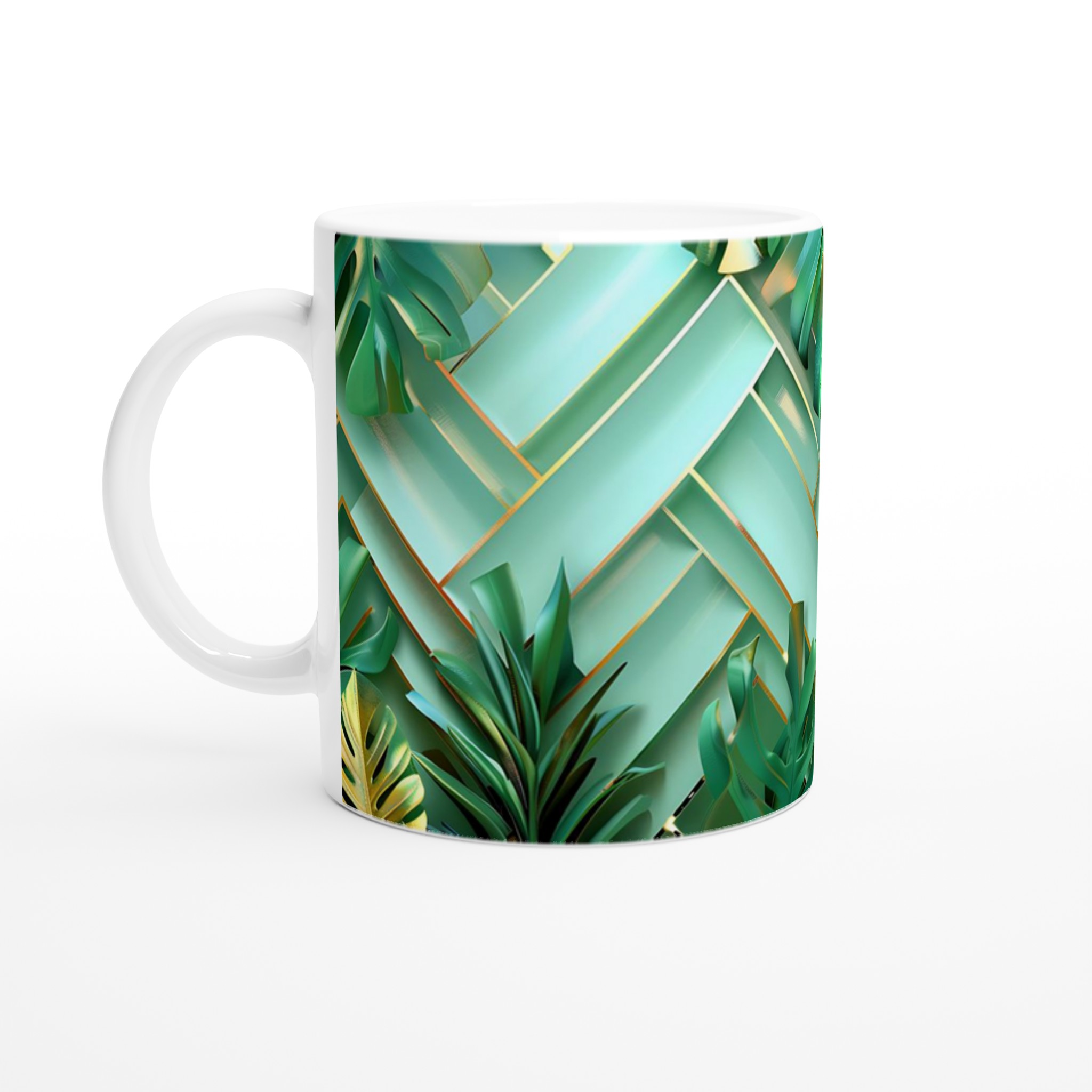 Inspirerad av tropisk elegans med frodiga gröna toner och lyxiga guldaccenter, ger denna mugg en känsla av lugn och sofistikation till din dag. Den blanka vita ytan ger ett skarpt och levande tryck som verkligen sticker ut, oavsett om det är en personlig design, ett roligt citat eller en present till någon du tycker om.