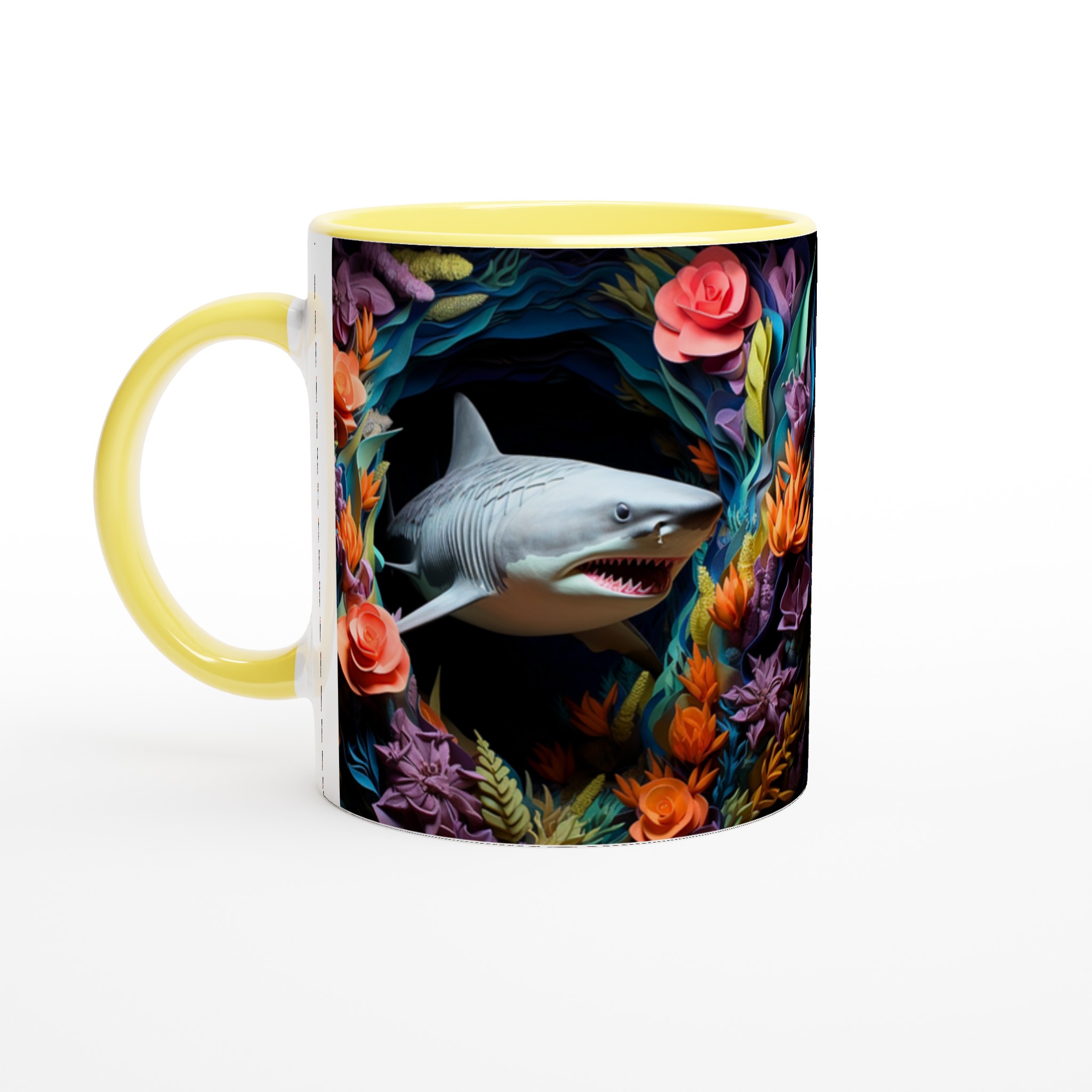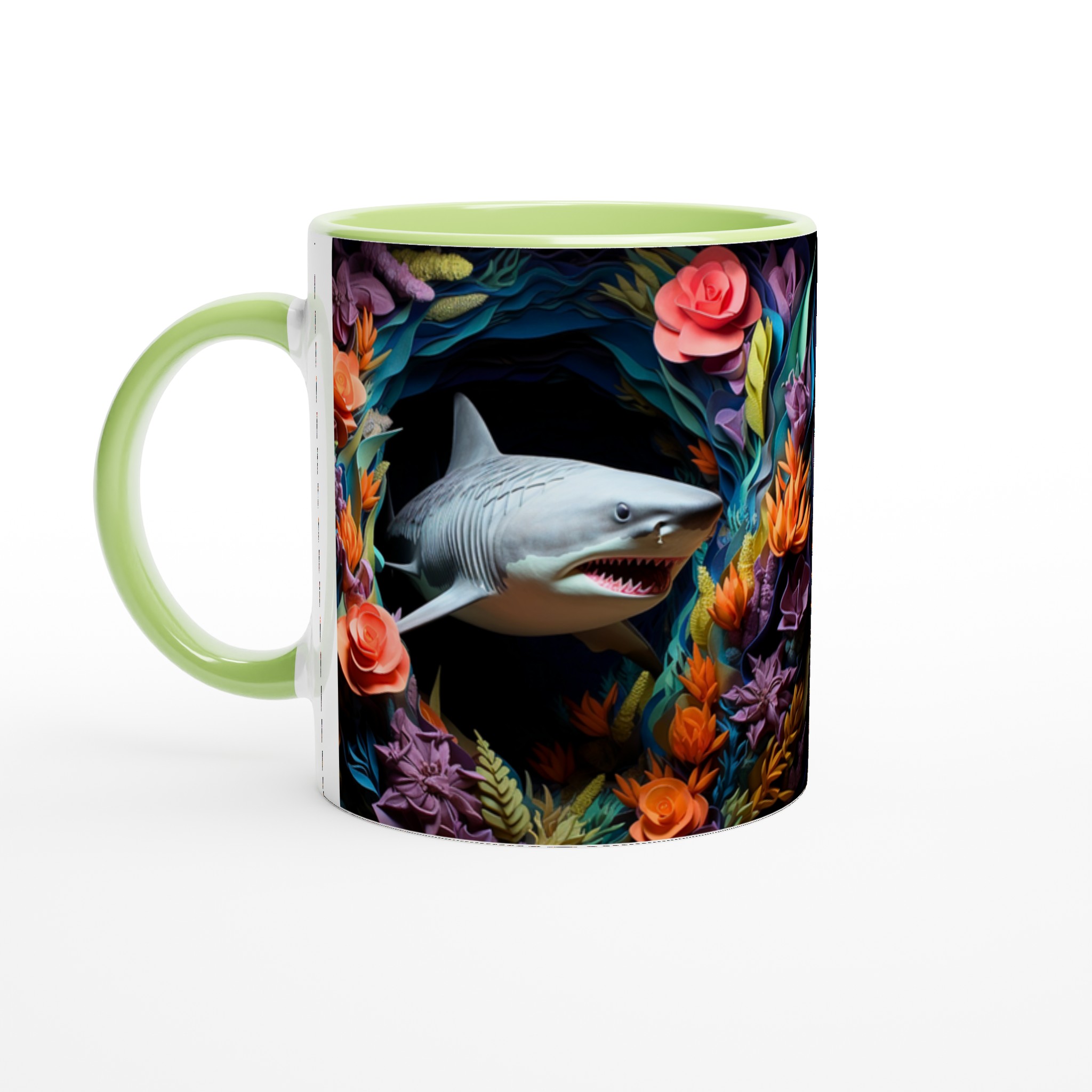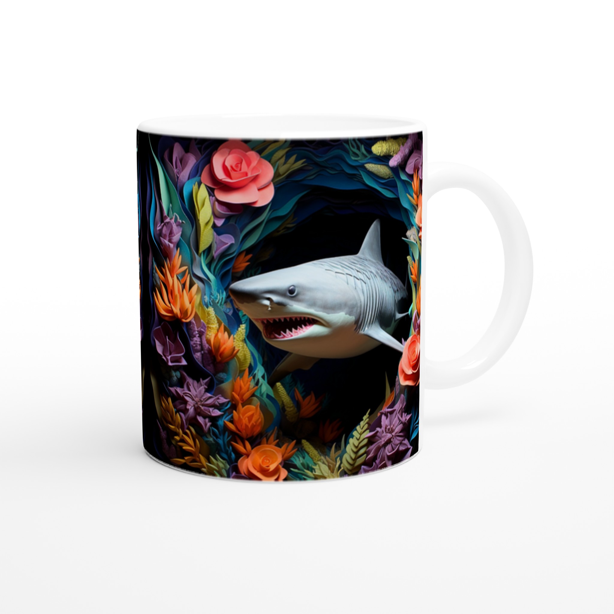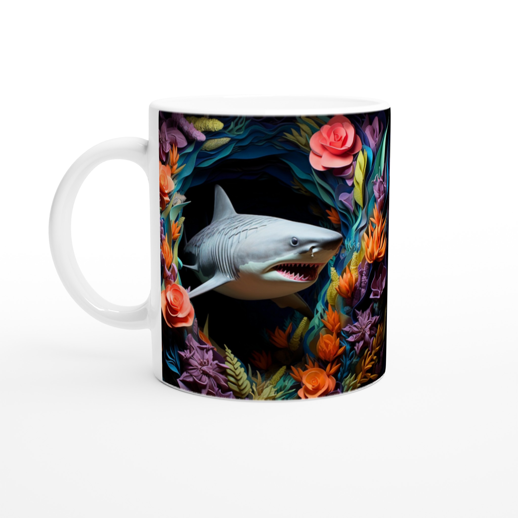 Föreställ dig att du tar din första klunk morgonkaffe, omgiven av en explosion av tropiska färger och den djärva närvaron av en lekfull haj. Den här stilrena keramiska muggen blir snabbt en vardagsfavorit, perfekt för att liva upp din morgonrutin, din kvälls varma choklad, eller när du bara vill njuta av en kopp te med en touch av det exotiska. Den blanka ytan framhäver trycken med klara och levande färger, som håller sig fina även efter många turer i mikron och diskmaskinen, vilket gör varje sipp till en mini-semester.