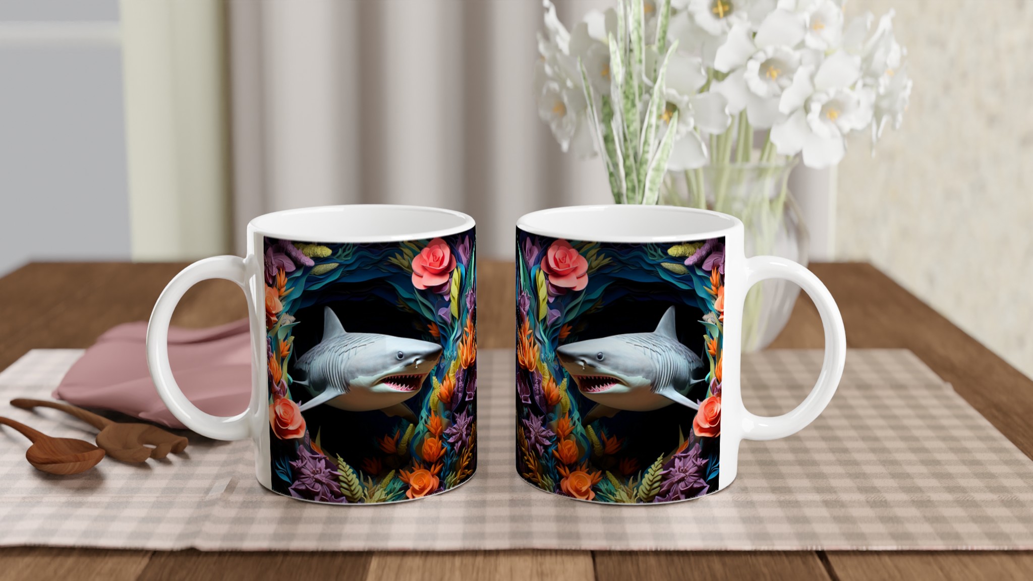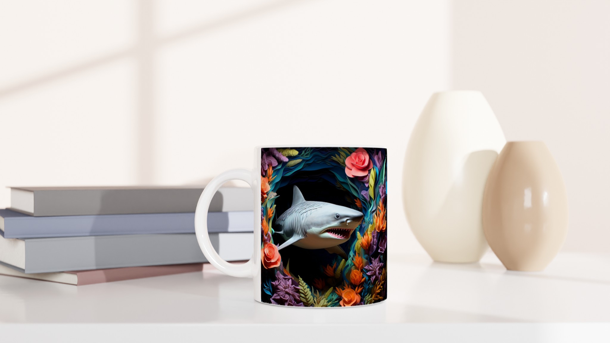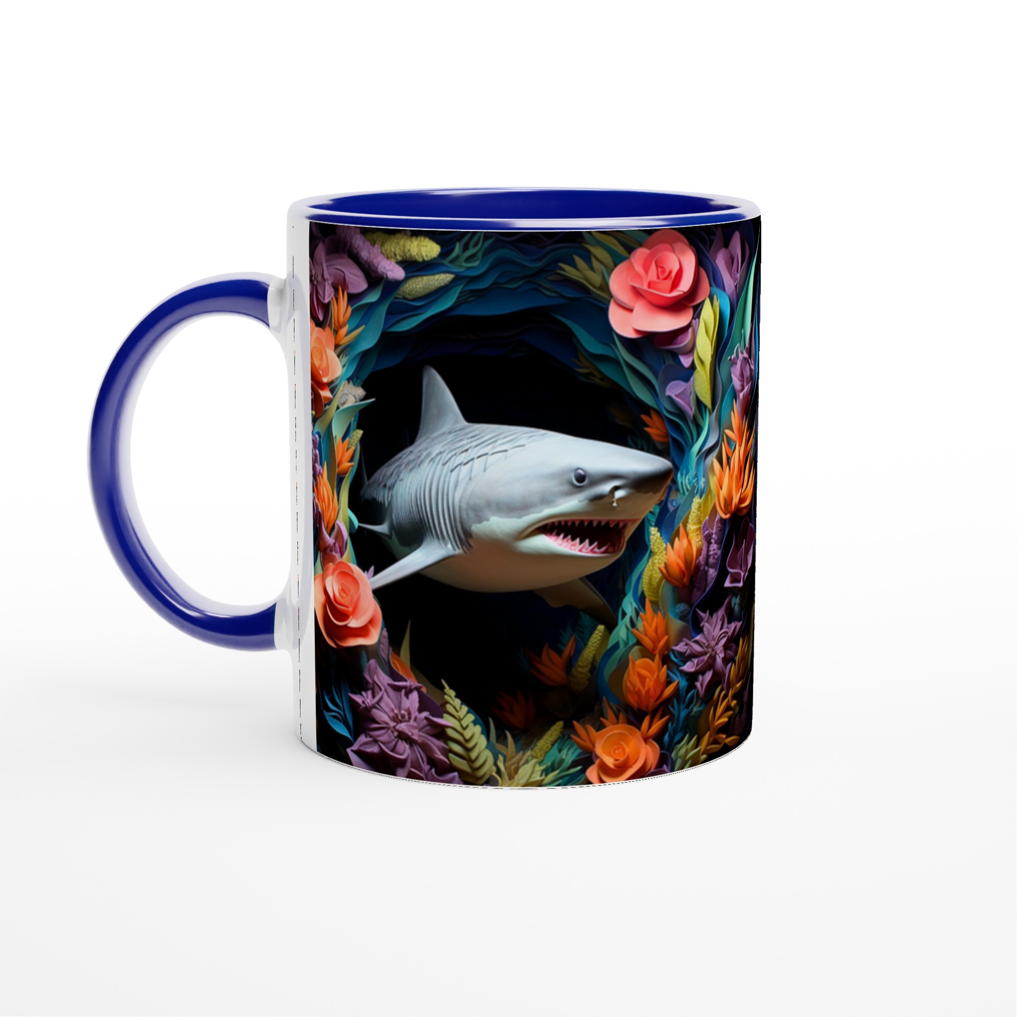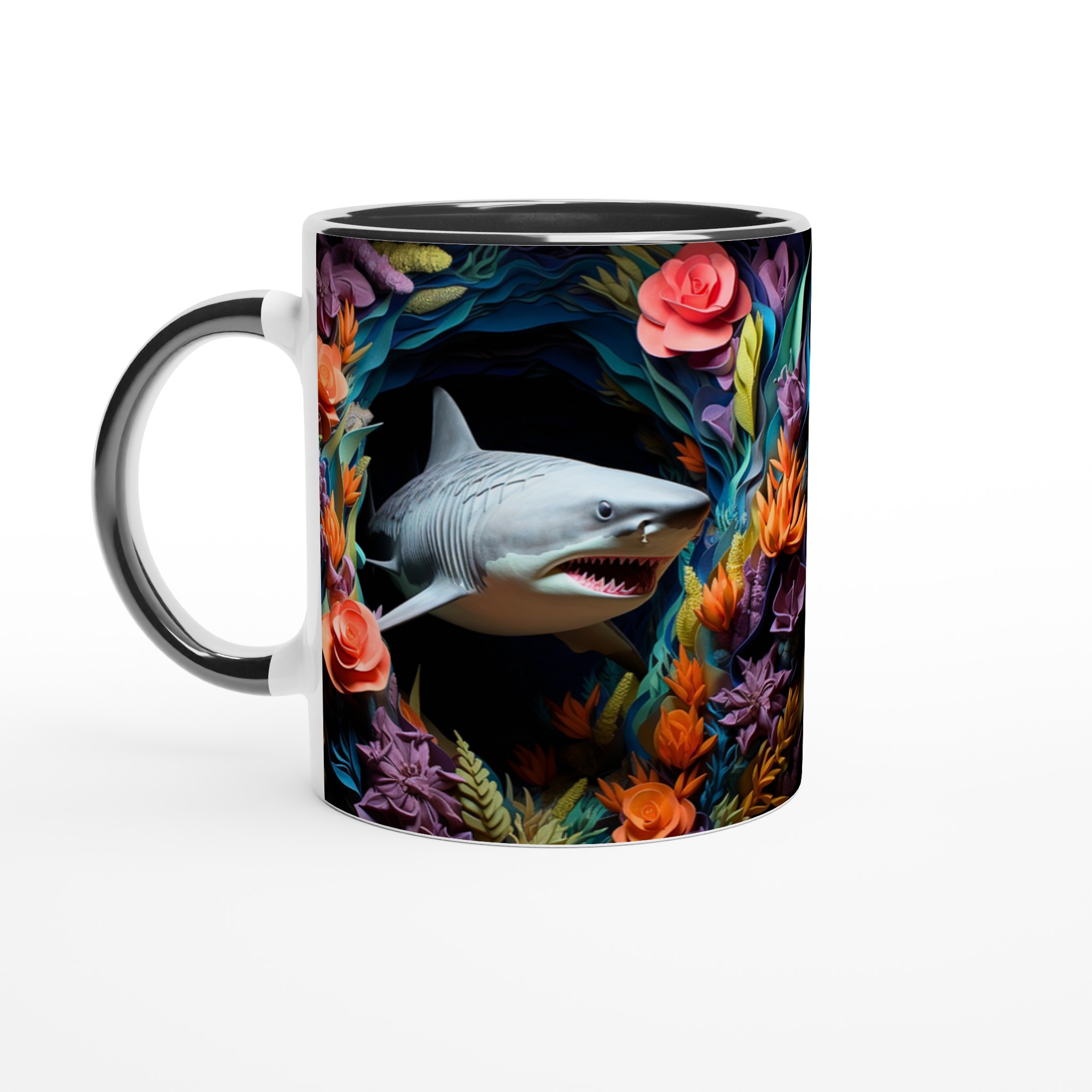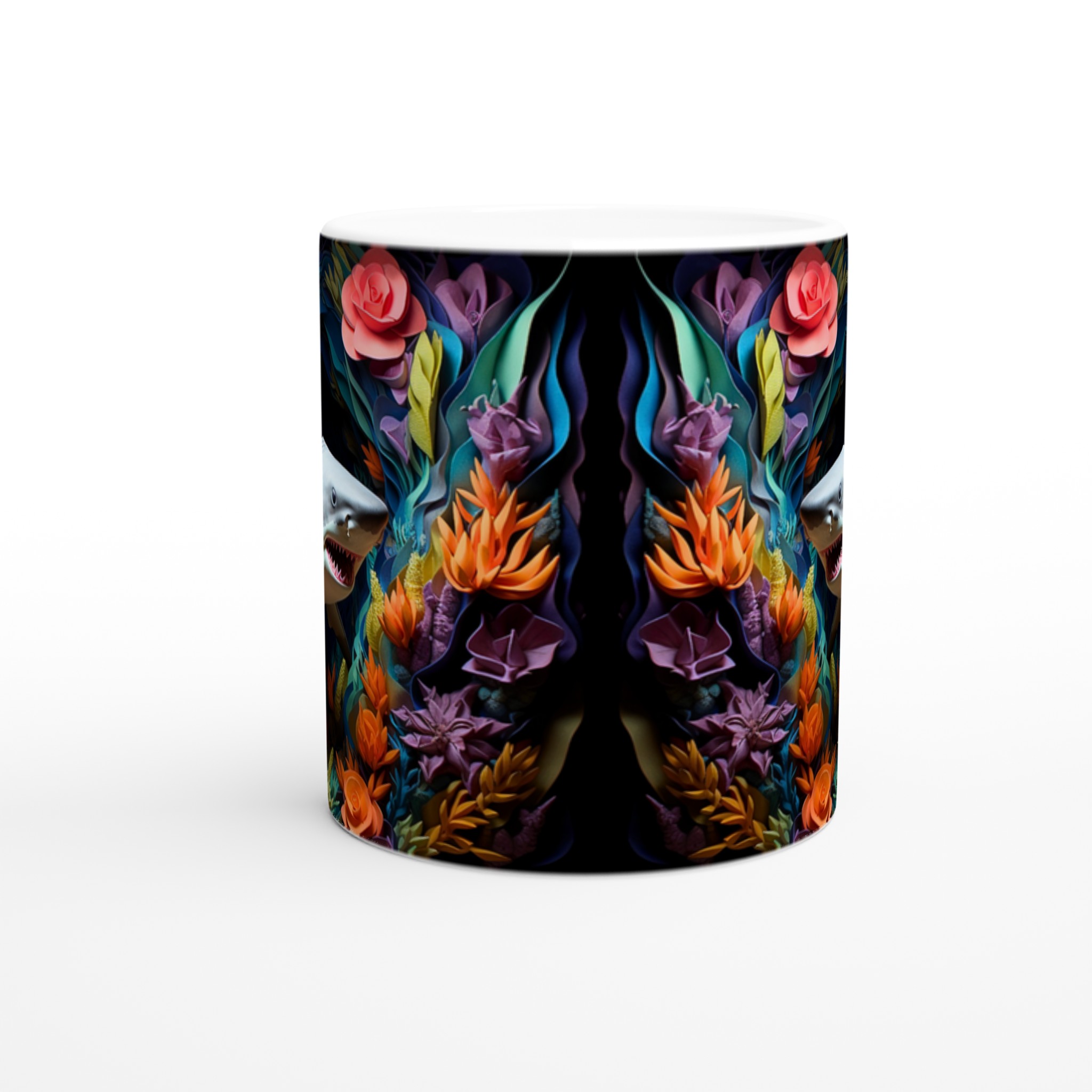 Föreställ dig att du tar din första klunk morgonkaffe, omgiven av en explosion av tropiska färger och den djärva närvaron av en lekfull haj. Den här stilrena keramiska muggen blir snabbt en vardagsfavorit, perfekt för att liva upp din morgonrutin, din kvälls varma choklad, eller när du bara vill njuta av en kopp te med en touch av det exotiska. Den blanka ytan framhäver trycken med klara och levande färger, som håller sig fina även efter många turer i mikron och diskmaskinen, vilket gör varje sipp till en mini-semester.