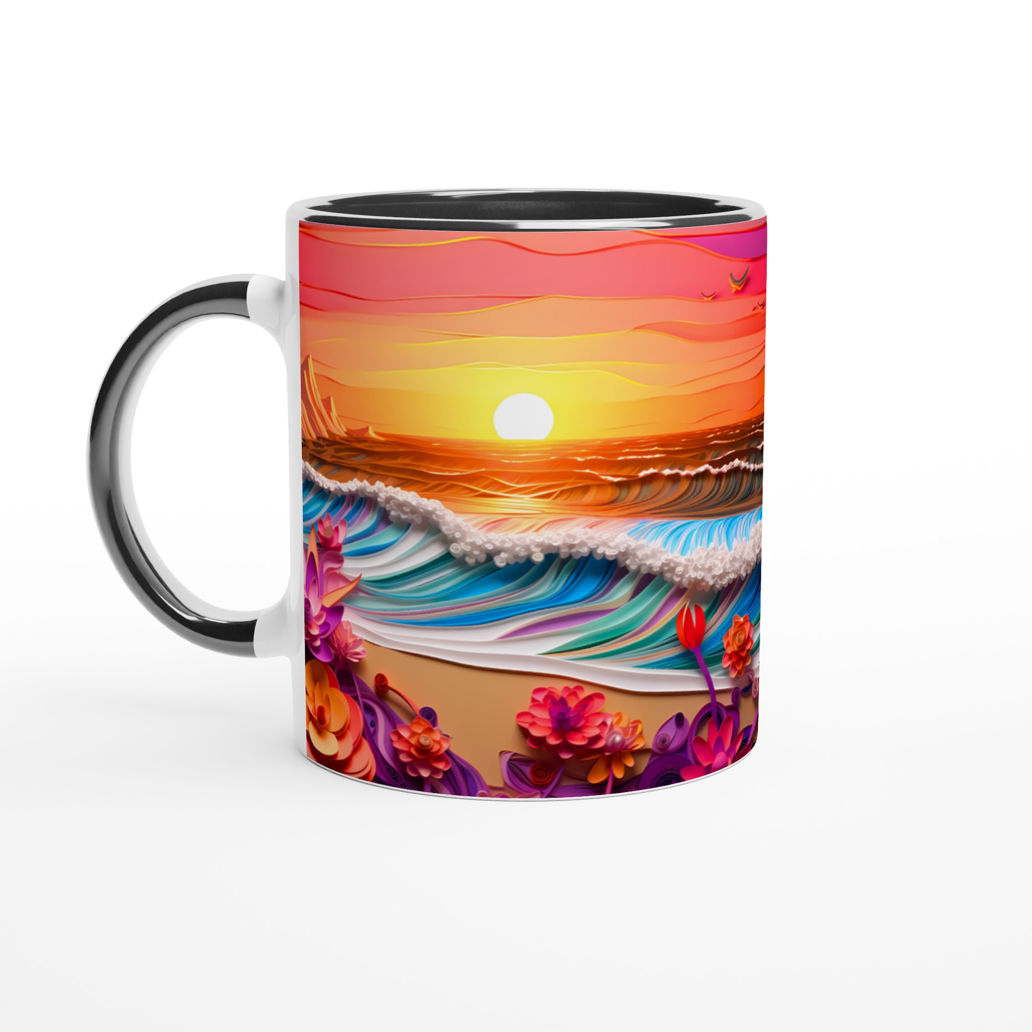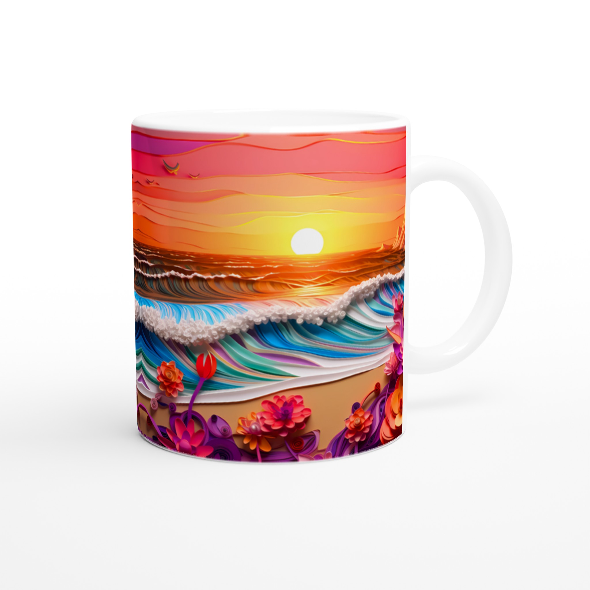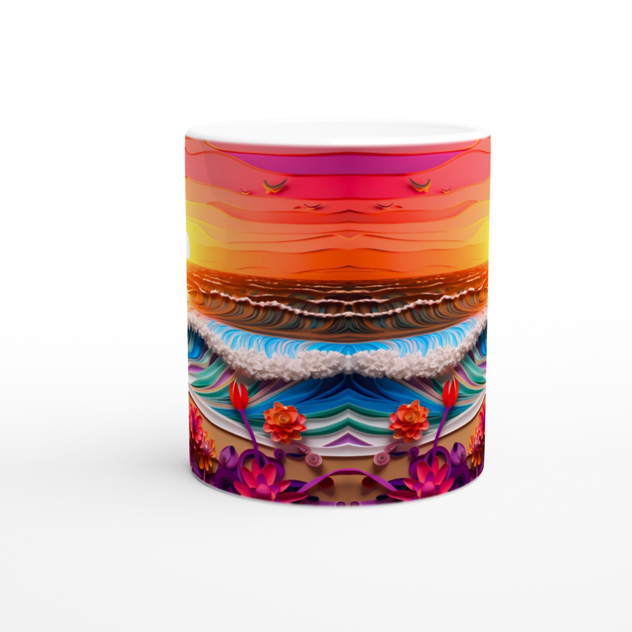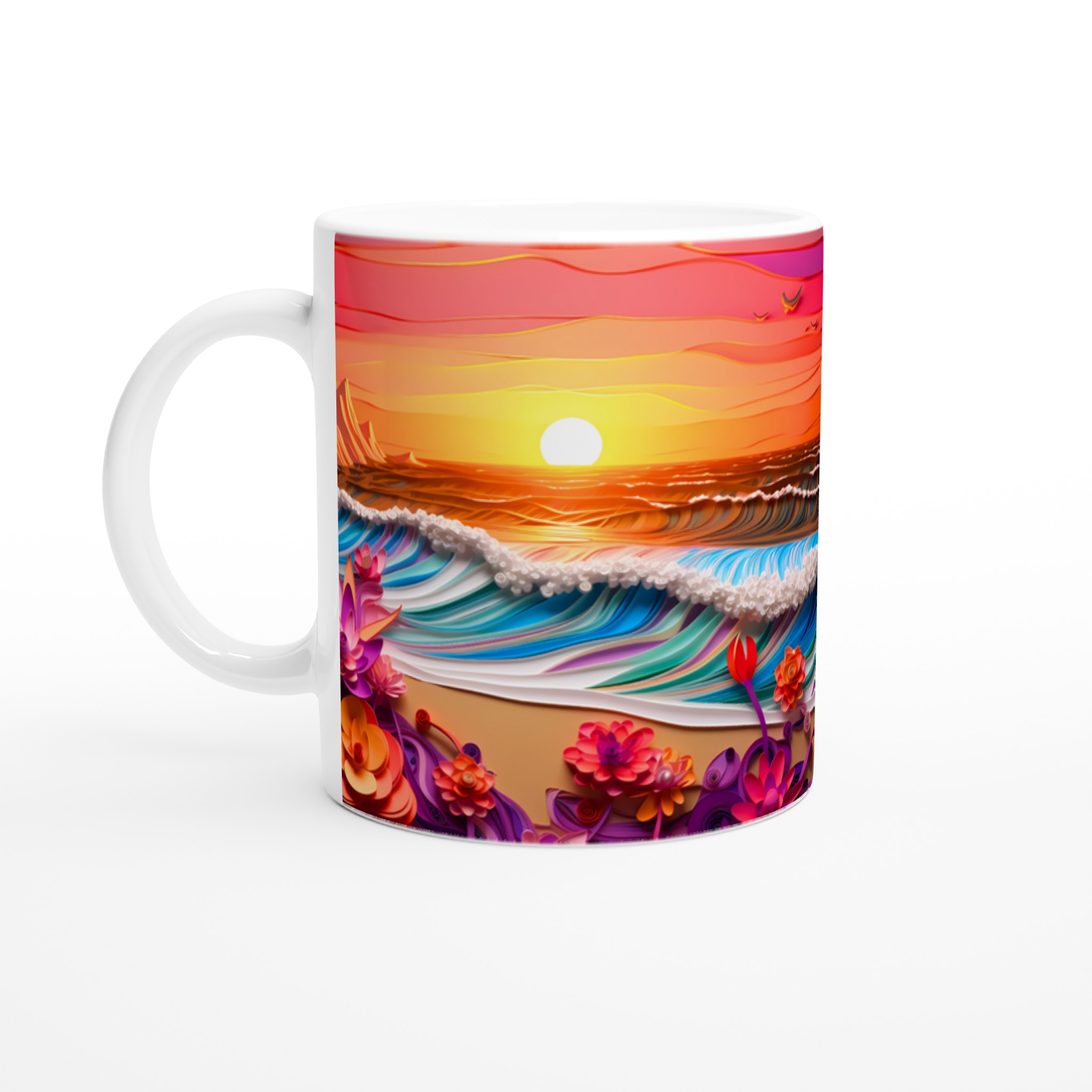 Låt varje klunk transportera dig till en sagolik solnedgång vid havet med vår unika keramiska mugg. Denna mugg är prydd med en levande och detaljerad illustration i quilling-stil, föreställande vågor som möter en strand under en glödande orange himmel, och exotiska blommor i lila, rosa och orange nyanser. Den fångar den lugna men ändå livfulla skönheten i en tropisk kväll, vilket gör den till den perfekta följeslagaren för ditt morgonkaffe, kvällens varma choklad eller när du bara vill njuta av en kopp te.