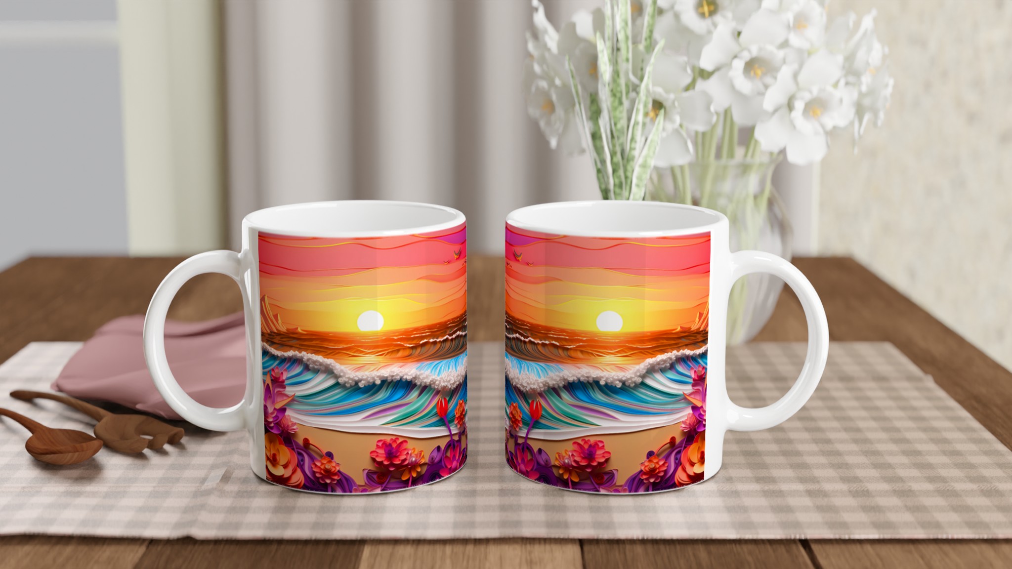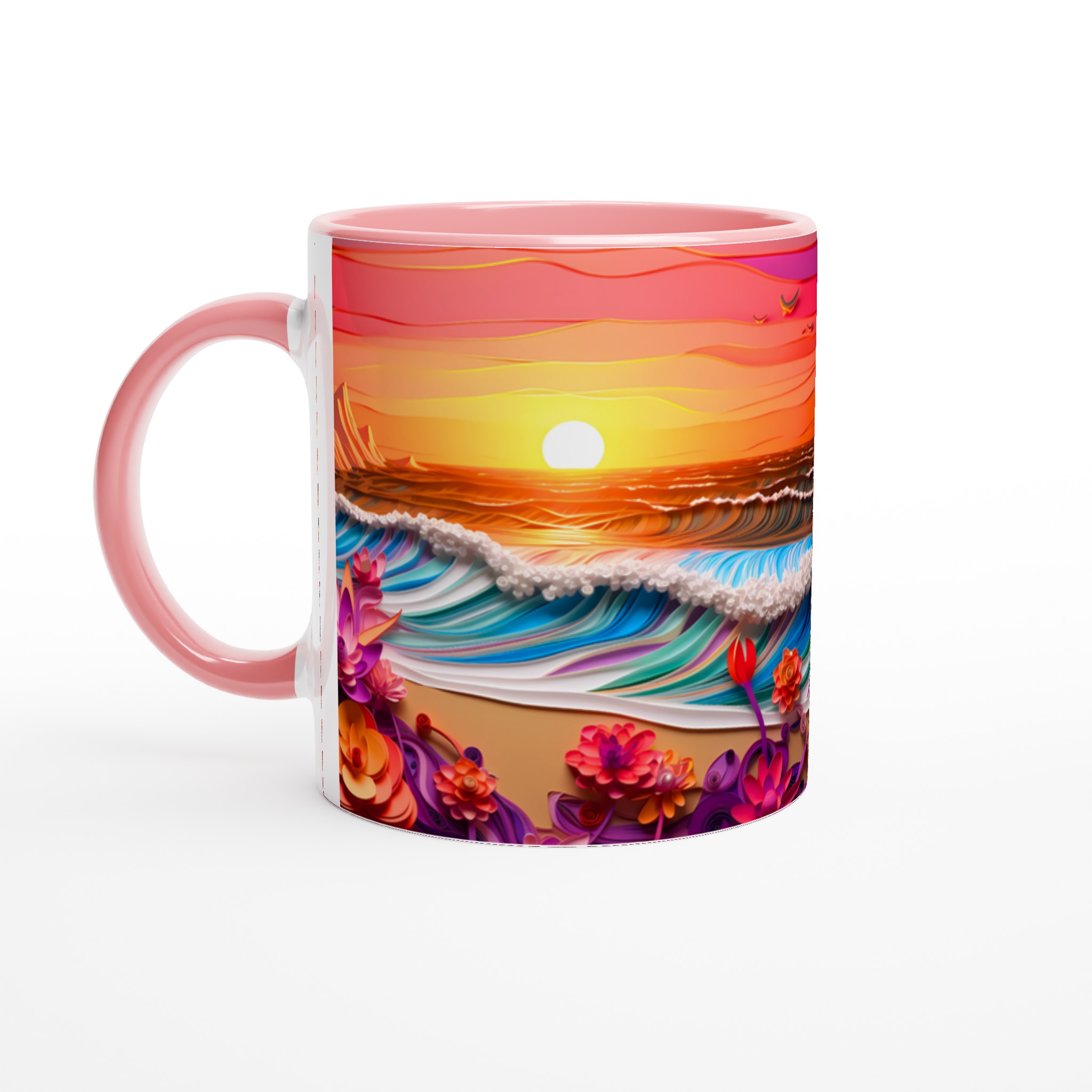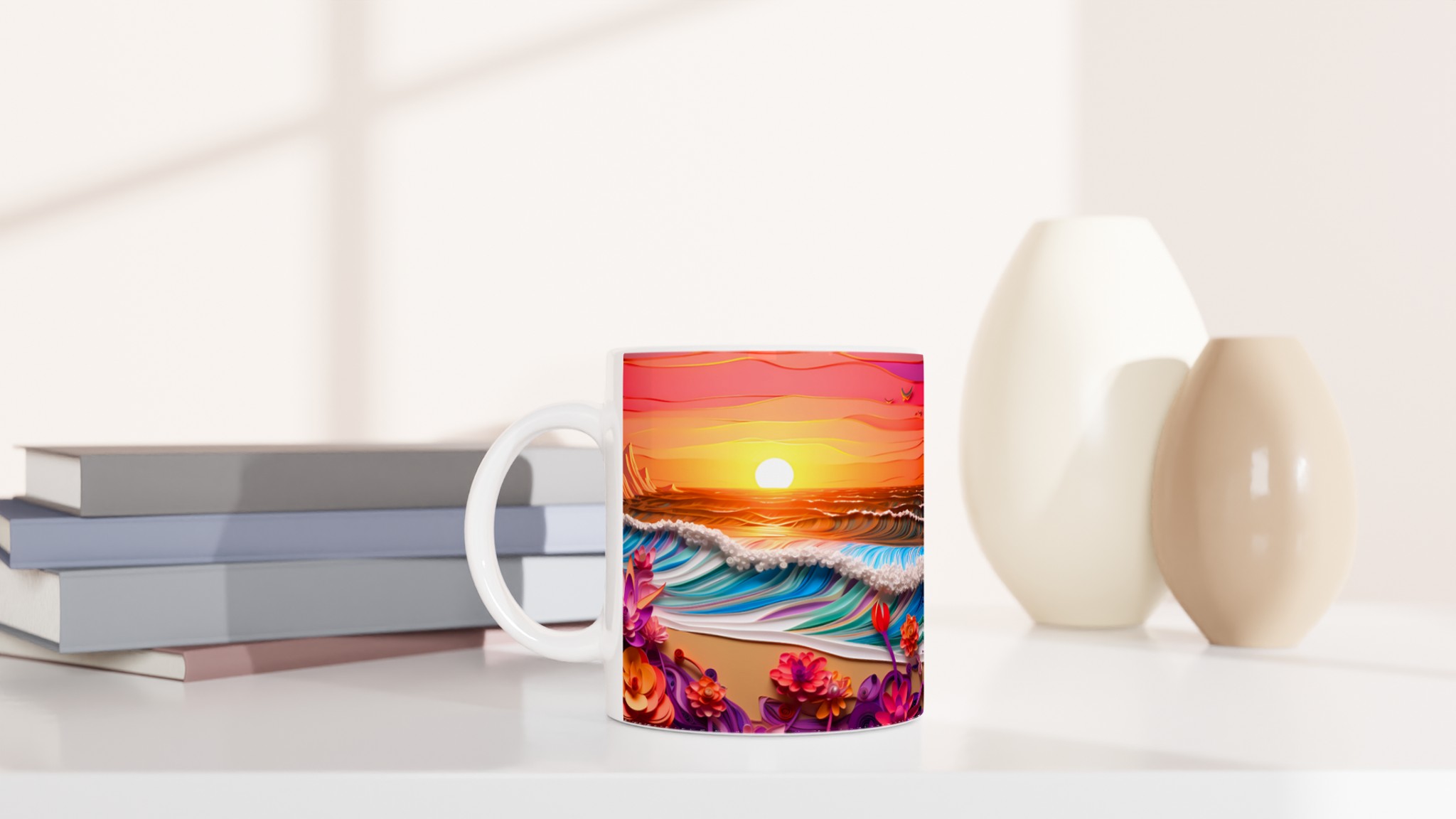 Låt varje klunk transportera dig till en sagolik solnedgång vid havet med vår unika keramiska mugg. Denna mugg är prydd med en levande och detaljerad illustration i quilling-stil, föreställande vågor som möter en strand under en glödande orange himmel, och exotiska blommor i lila, rosa och orange nyanser. Den fångar den lugna men ändå livfulla skönheten i en tropisk kväll, vilket gör den till den perfekta följeslagaren för ditt morgonkaffe, kvällens varma choklad eller när du bara vill njuta av en kopp te.