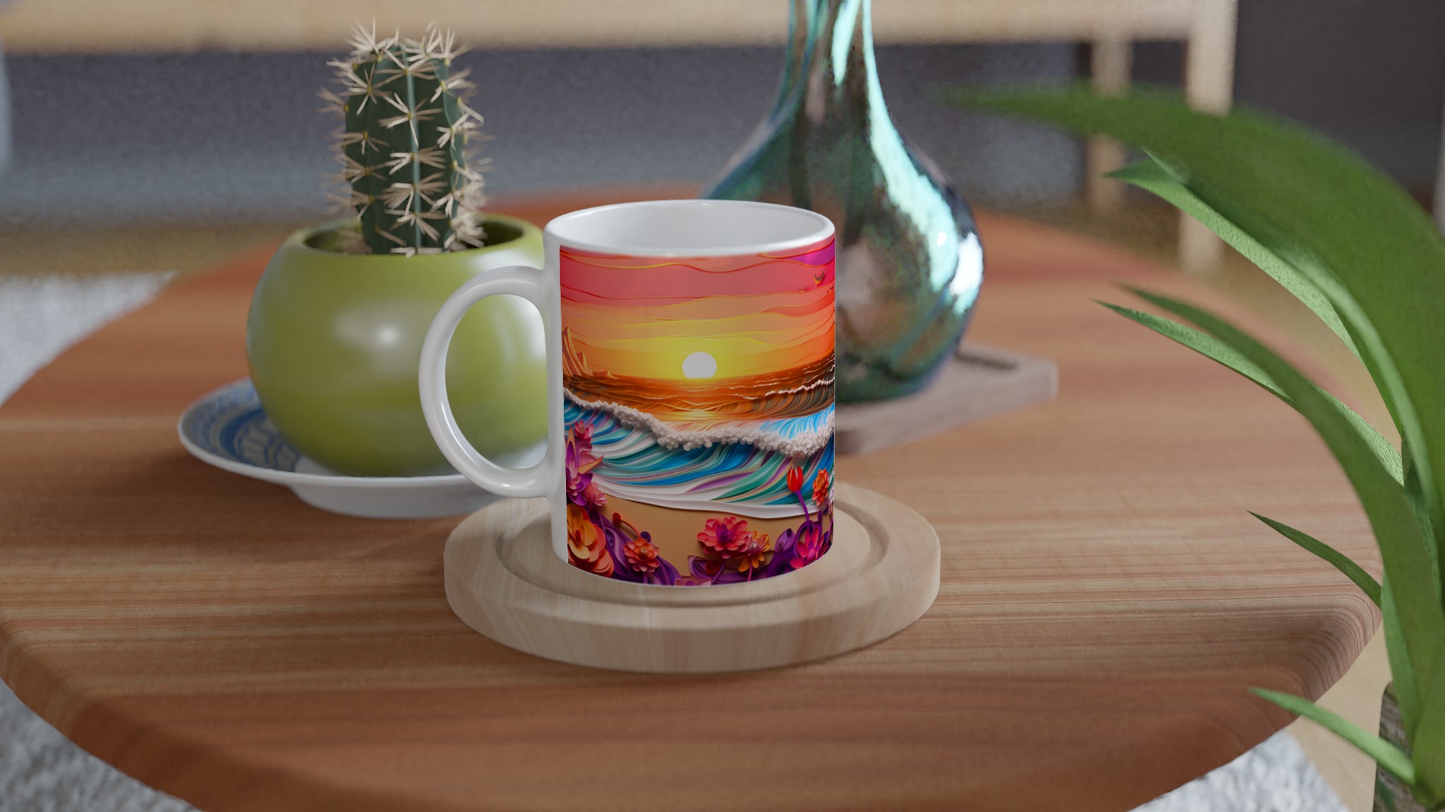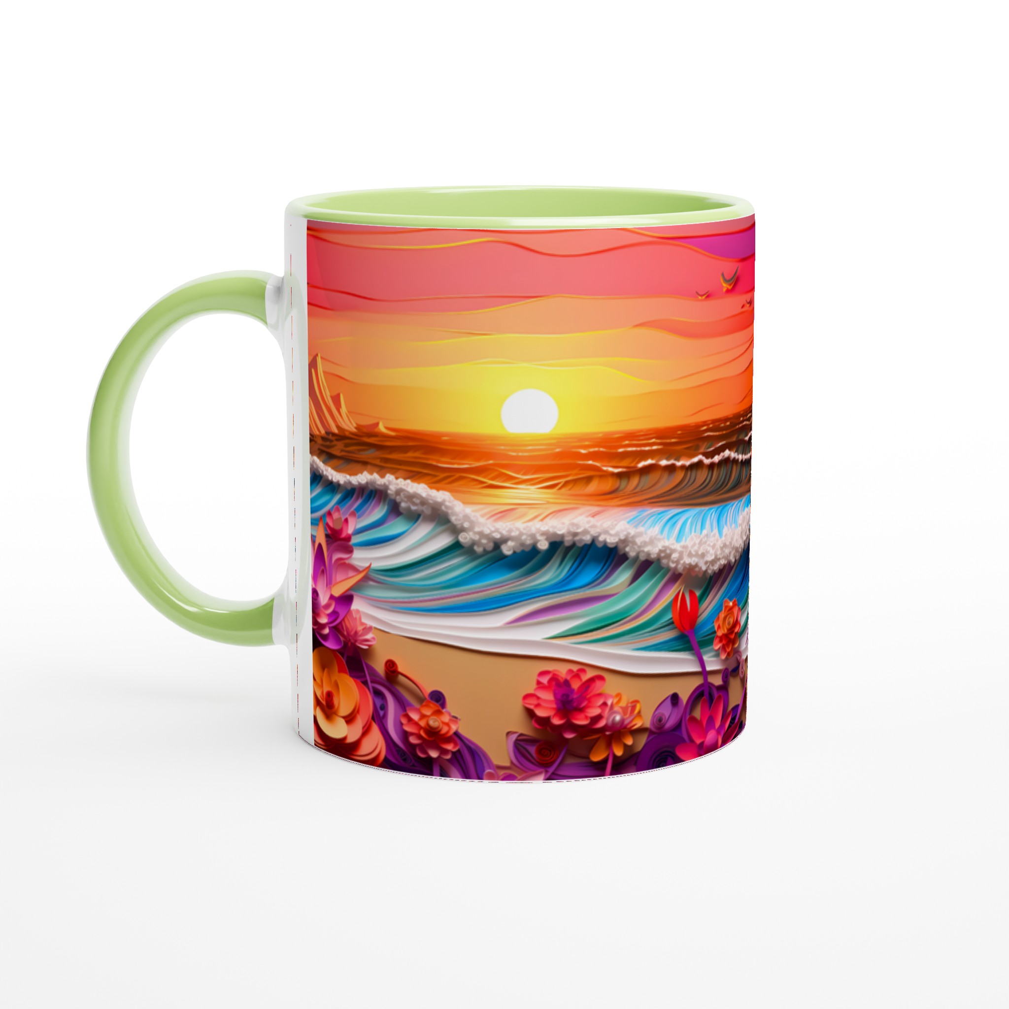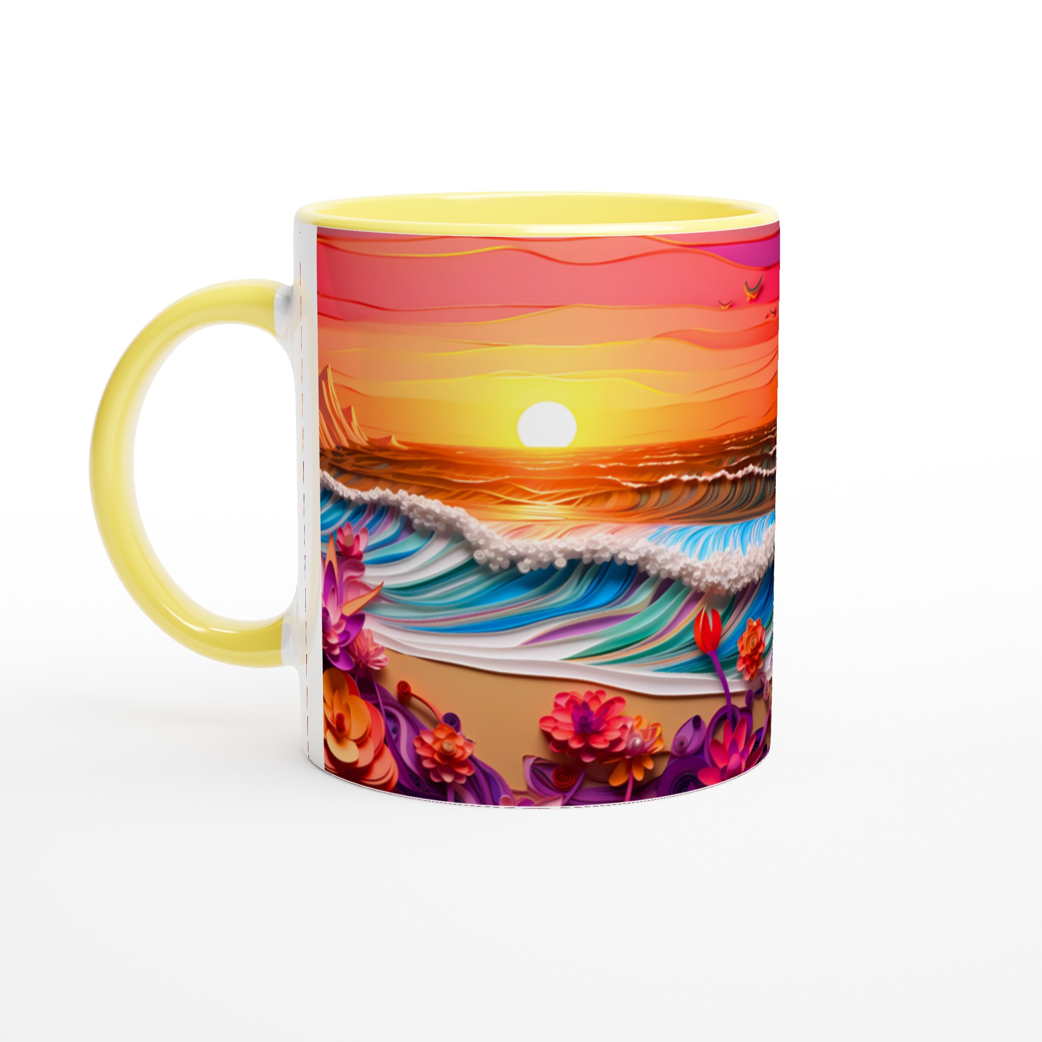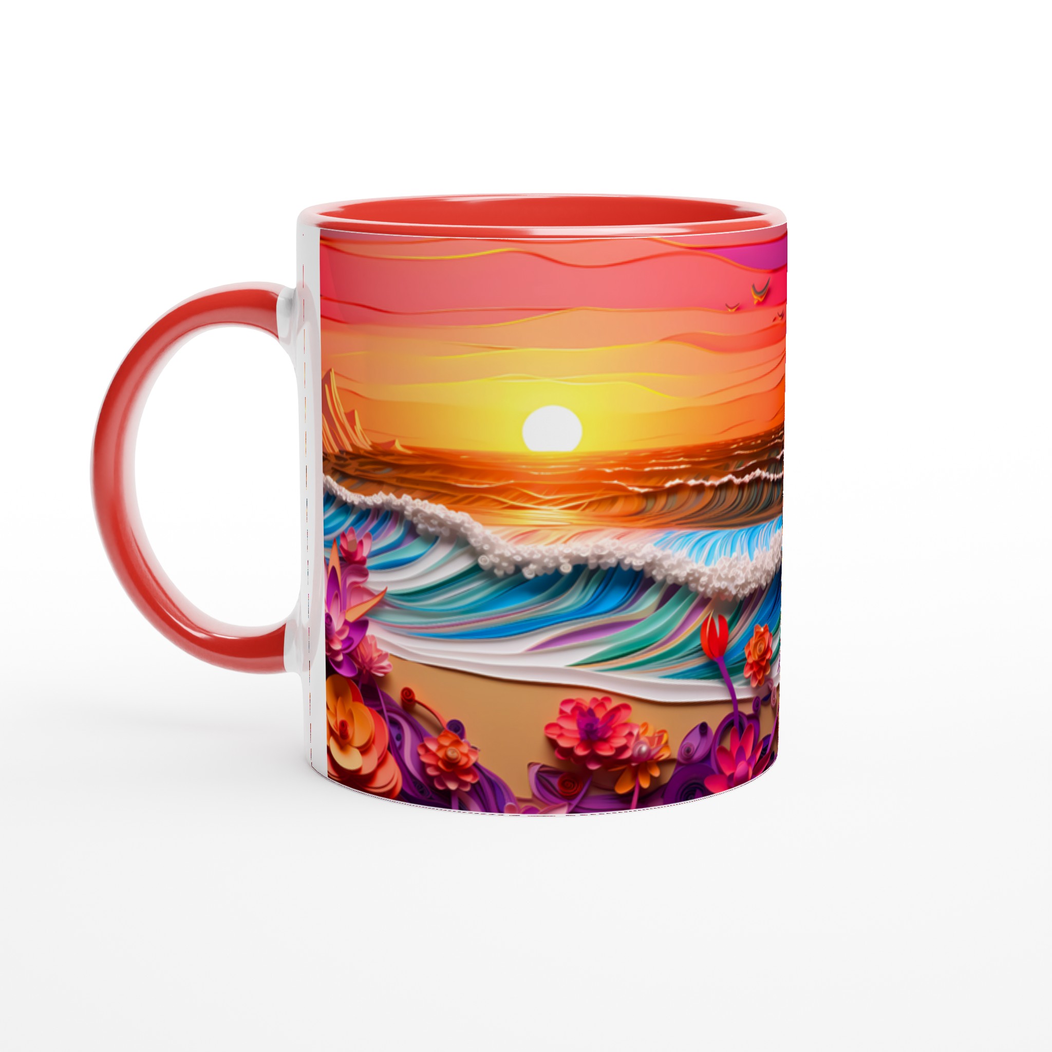 Låt varje klunk transportera dig till en sagolik solnedgång vid havet med vår unika keramiska mugg. Denna mugg är prydd med en levande och detaljerad illustration i quilling-stil, föreställande vågor som möter en strand under en glödande orange himmel, och exotiska blommor i lila, rosa och orange nyanser. Den fångar den lugna men ändå livfulla skönheten i en tropisk kväll, vilket gör den till den perfekta följeslagaren för ditt morgonkaffe, kvällens varma choklad eller när du bara vill njuta av en kopp te.