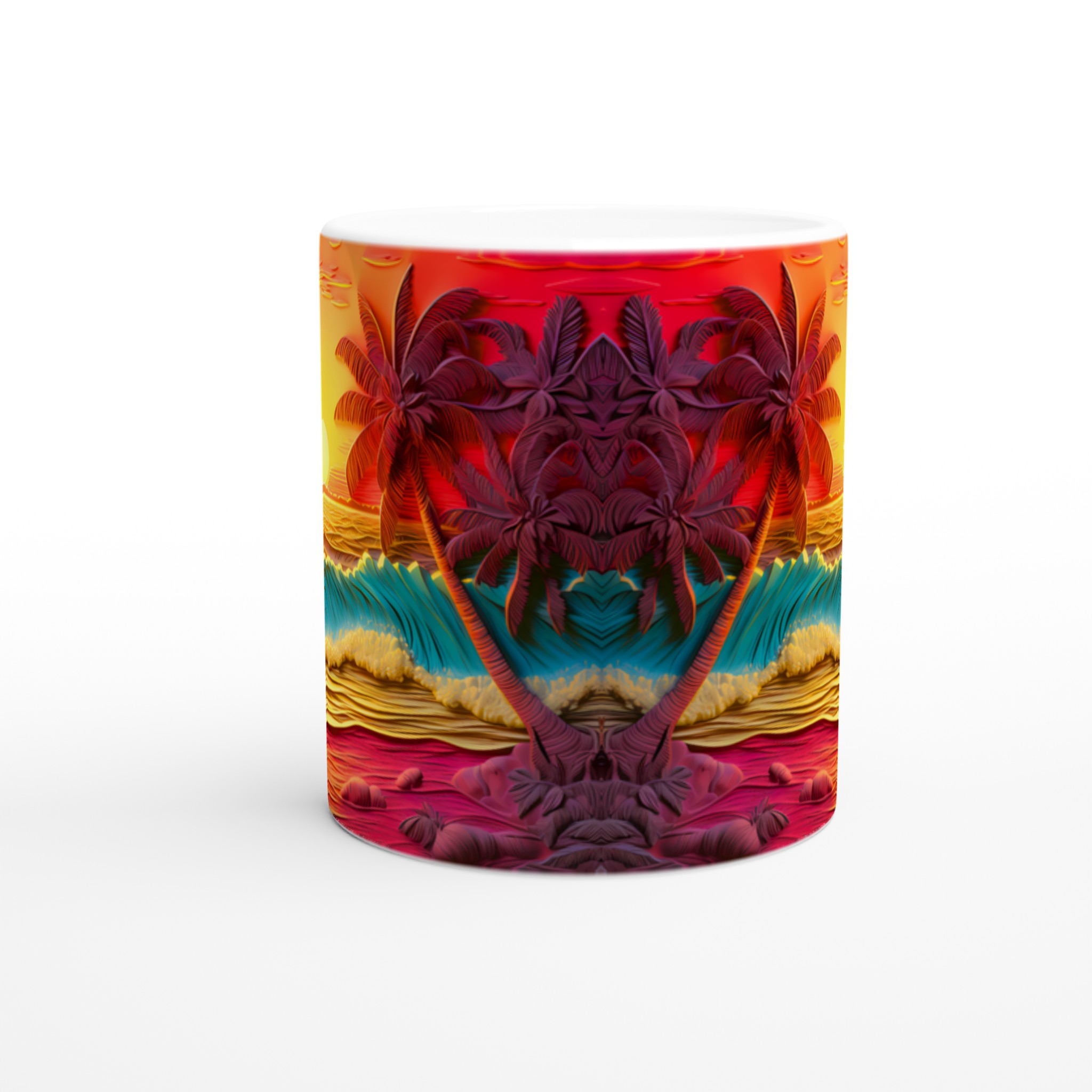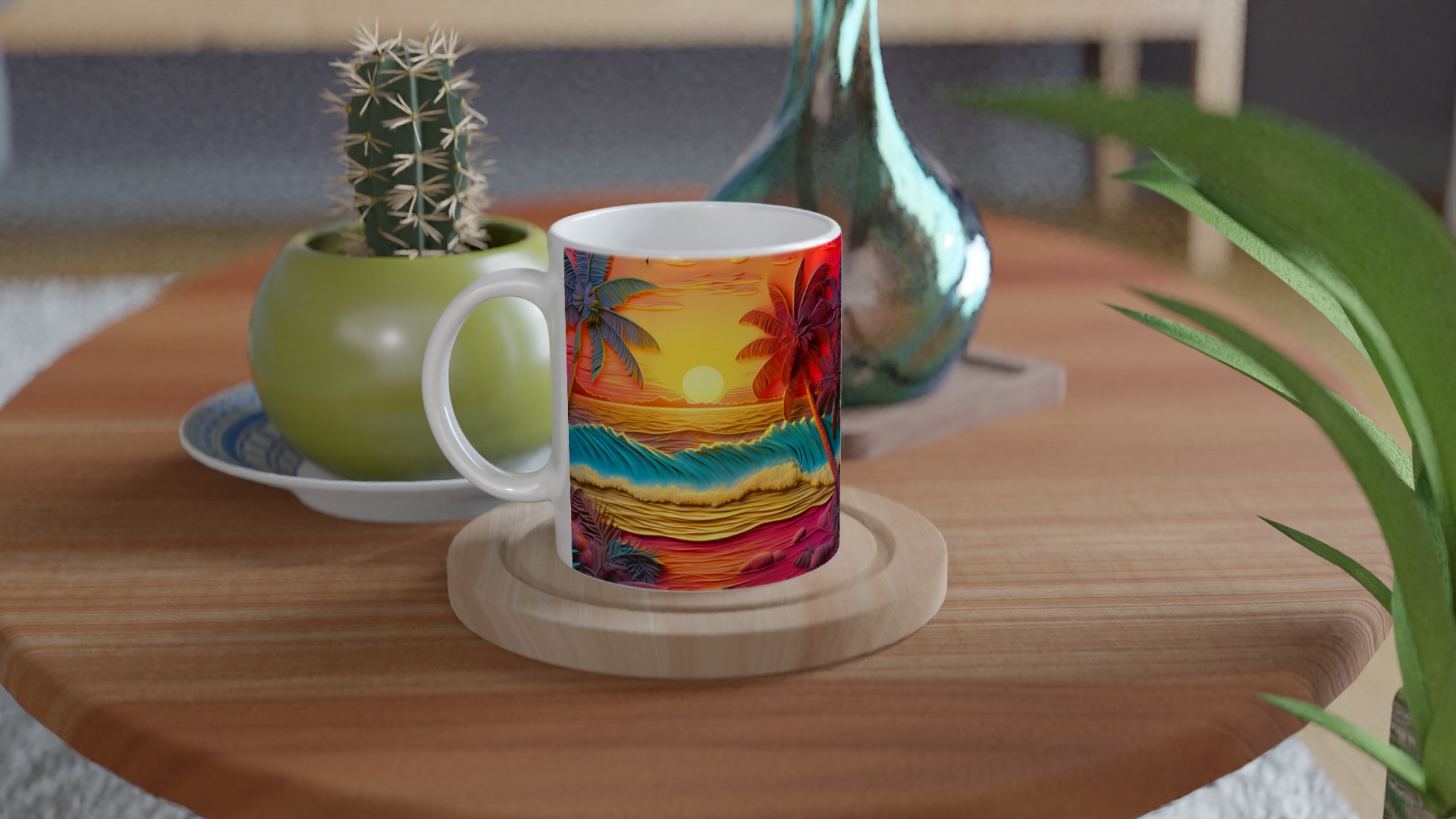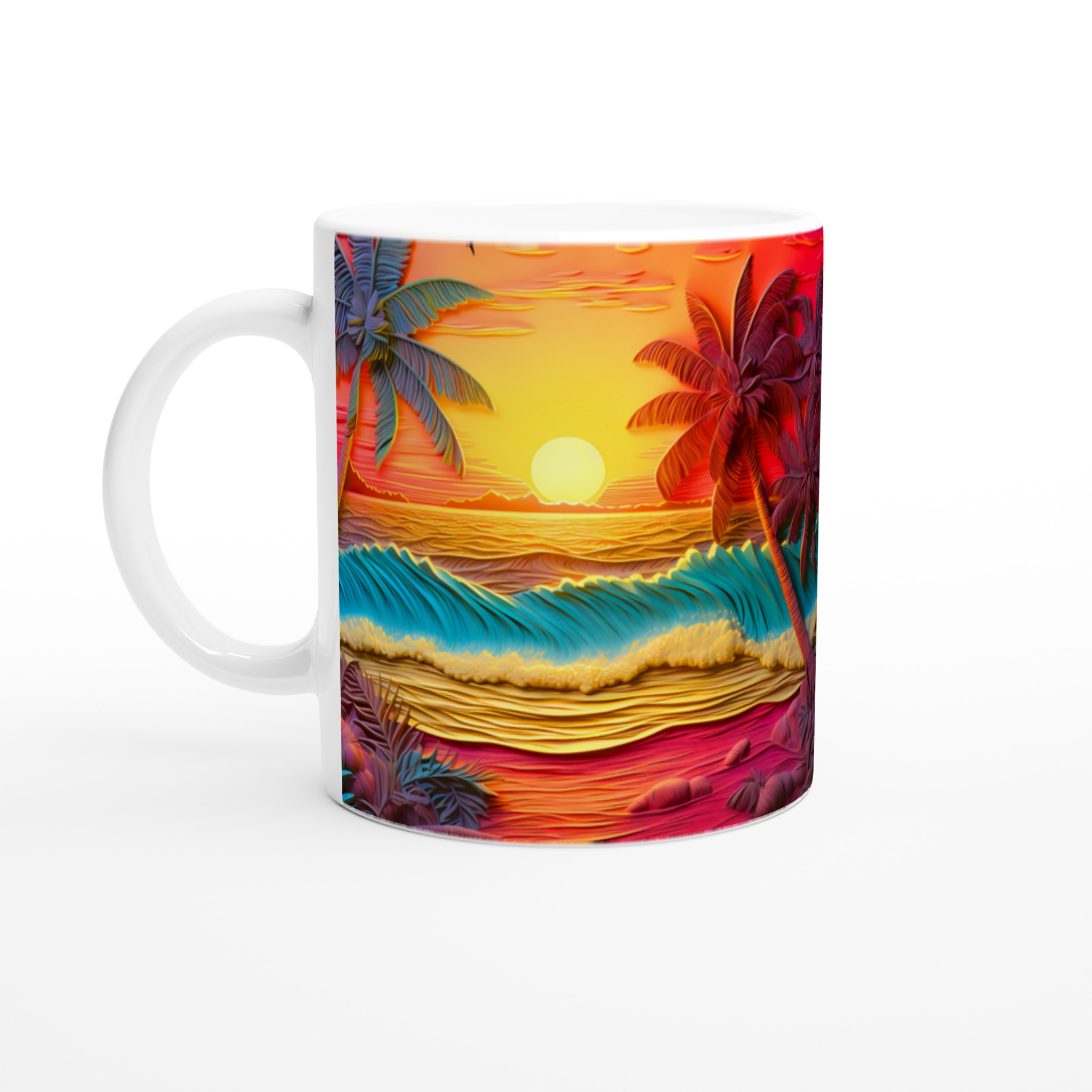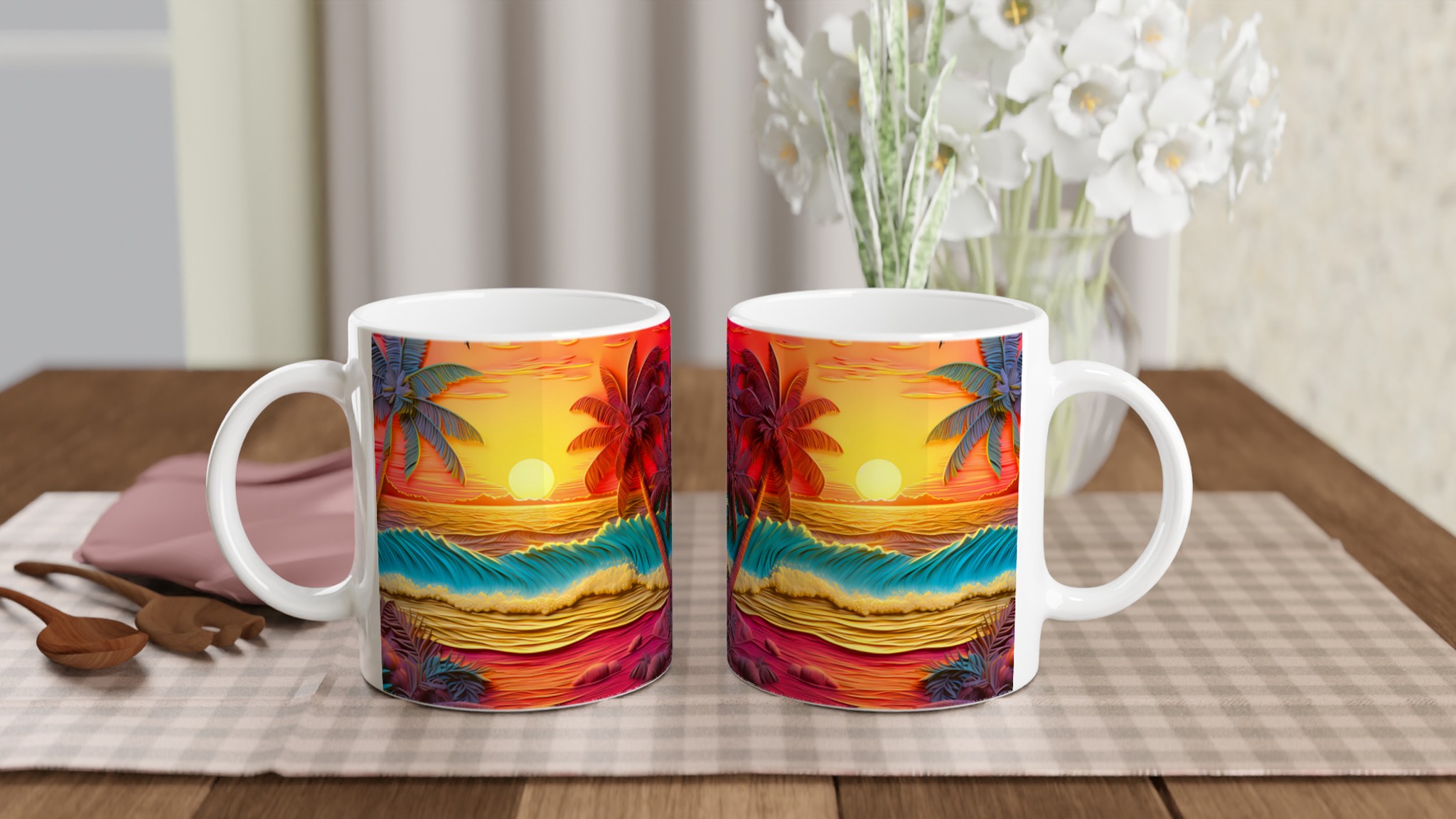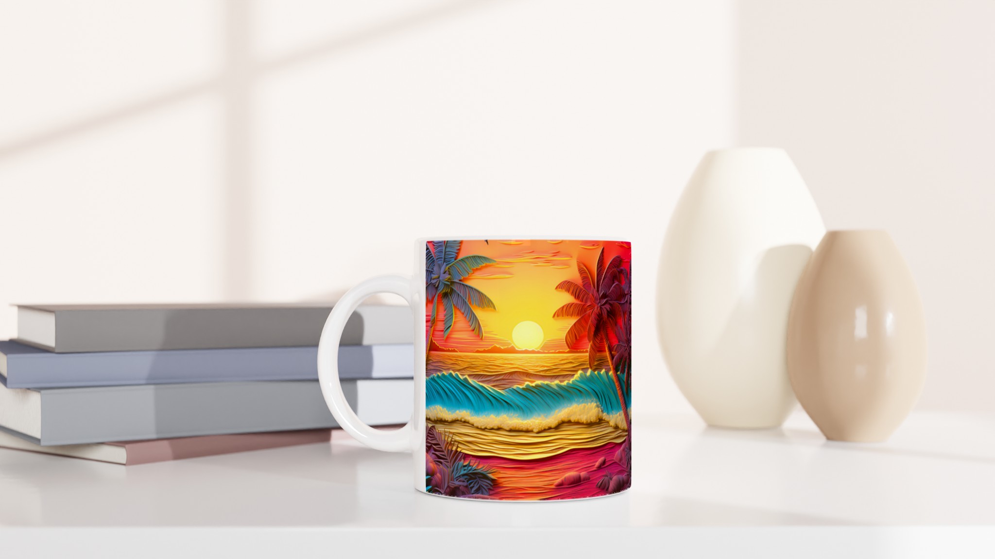 Fly vardagen och dröm dig bort till en tropisk solnedgång med denna iögonfallande keramiska mugg! Det pulserande motivet av palmer mot en djupröd och gyllene himmel, med glittrande turkosa vågor, fångar känslan av en perfekt kväll vid havet. Den här stilrena keramiska muggen blir snabbt en vardagsfavorit. Perfekt för morgonkaffet, kvällens varma choklad eller när du bara vill njuta av en kopp te. Den blanka vita ytan gör att trycken framhävs med klara och levande färger, som håller sig fina även efter många turer i mikron och diskmaskinen.