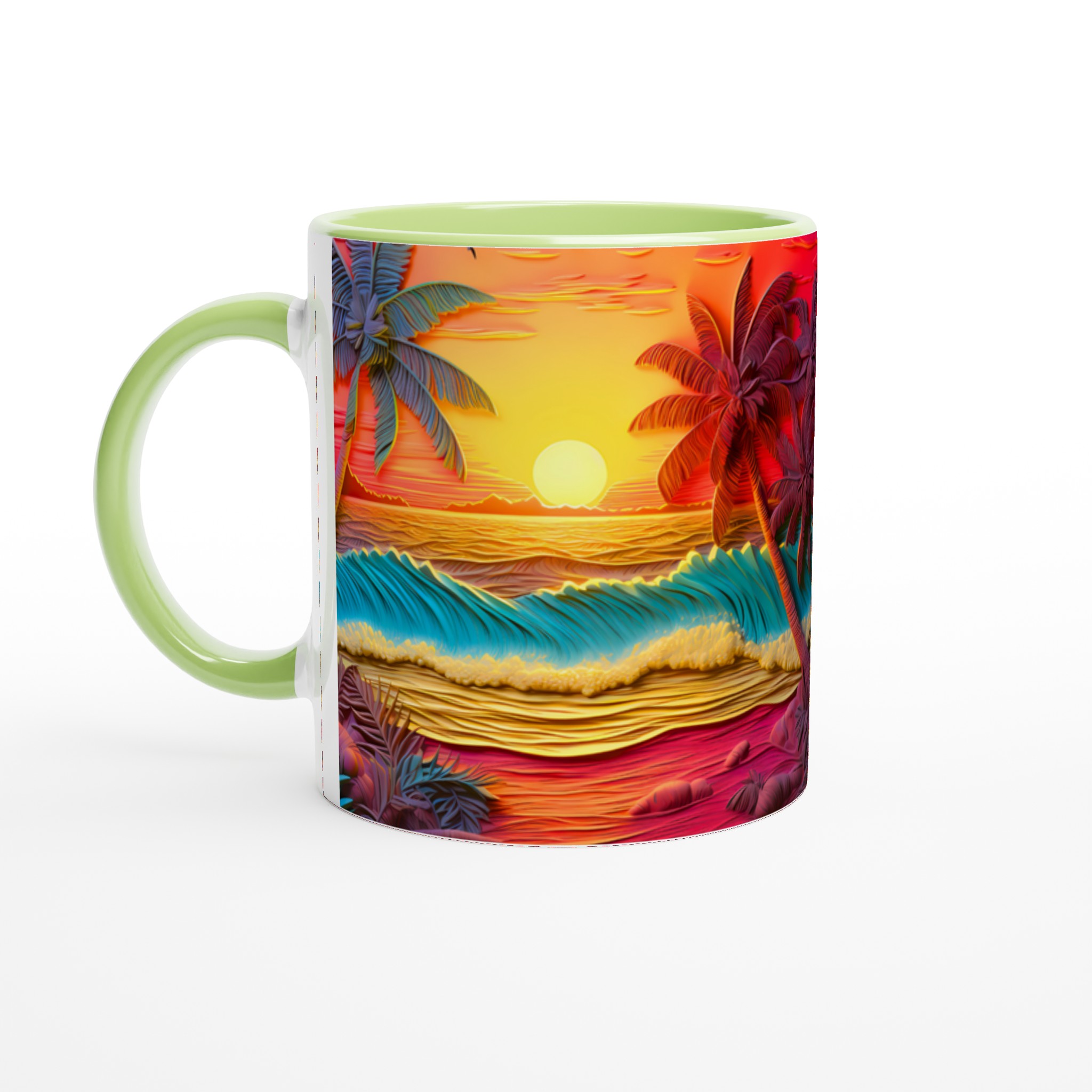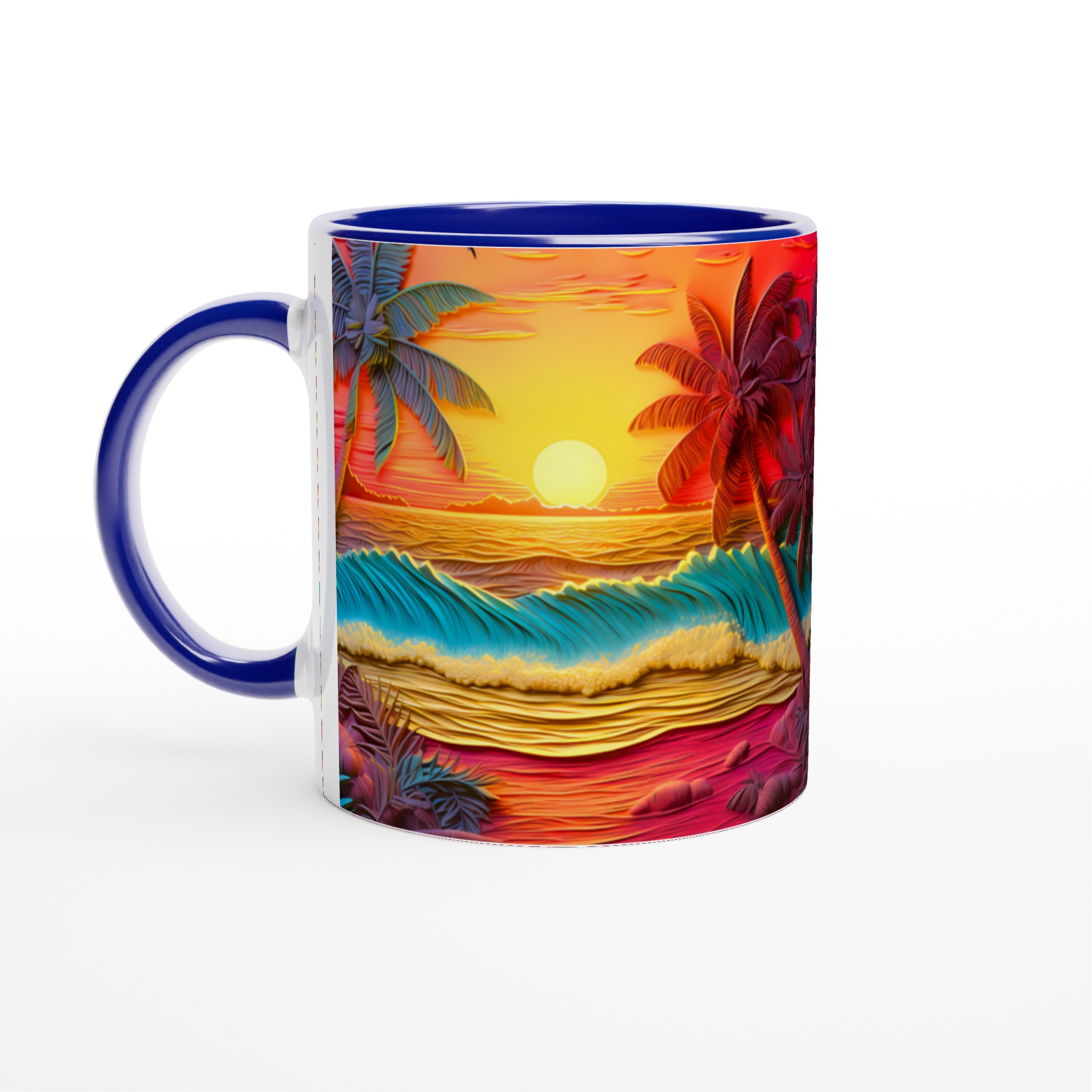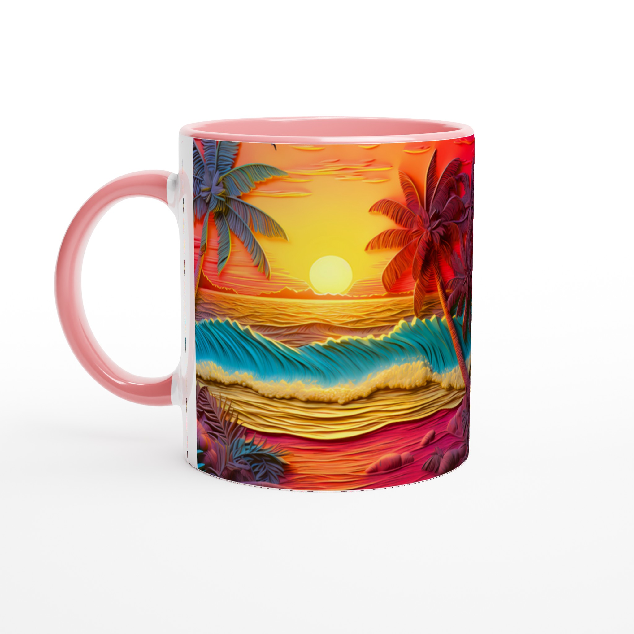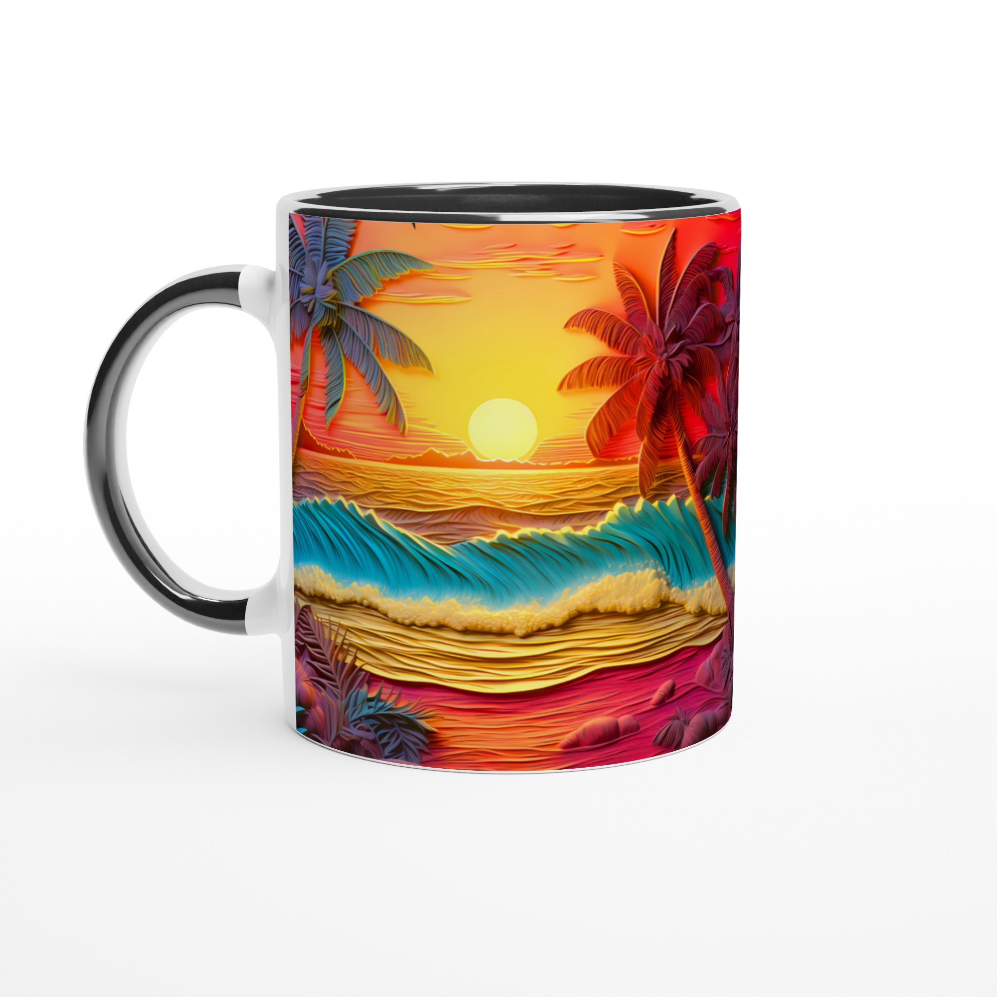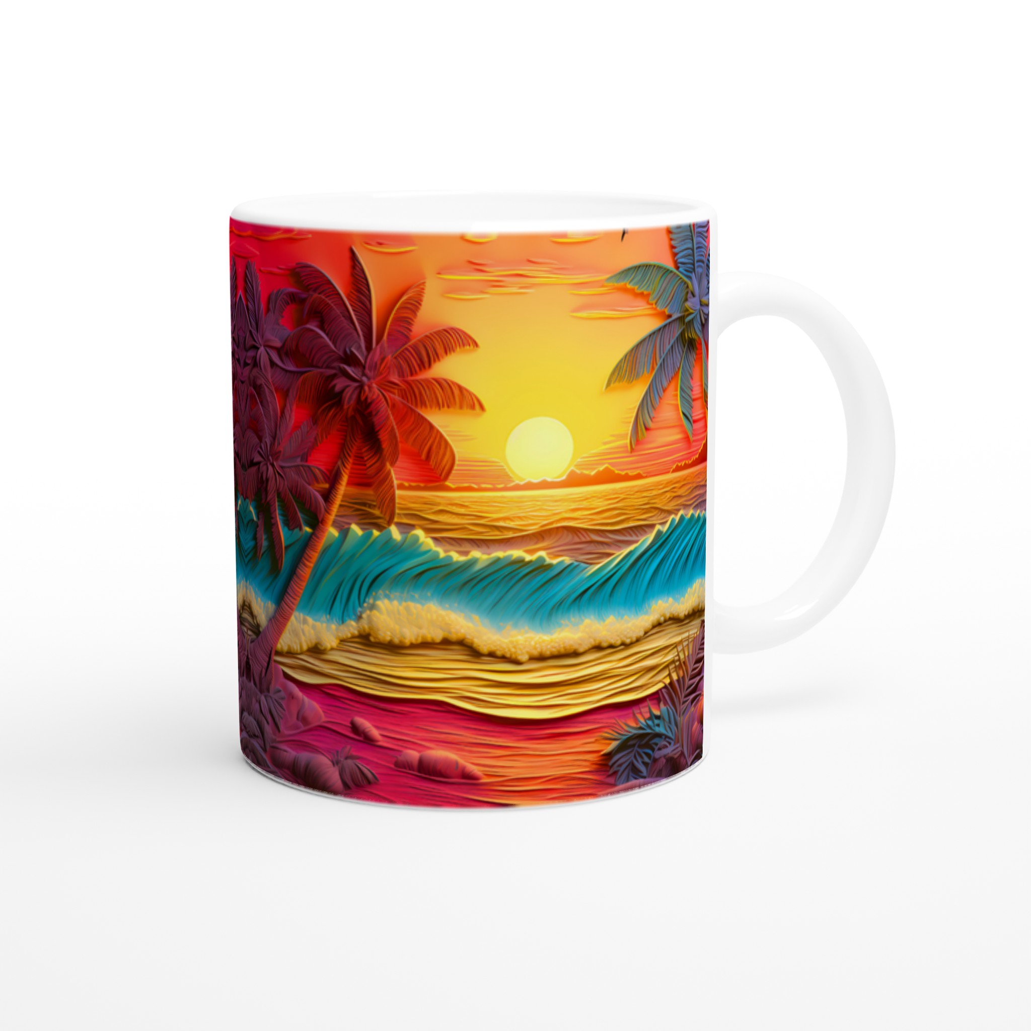 Fly vardagen och dröm dig bort till en tropisk solnedgång med denna iögonfallande keramiska mugg! Det pulserande motivet av palmer mot en djupröd och gyllene himmel, med glittrande turkosa vågor, fångar känslan av en perfekt kväll vid havet. Den här stilrena keramiska muggen blir snabbt en vardagsfavorit. Perfekt för morgonkaffet, kvällens varma choklad eller när du bara vill njuta av en kopp te. Den blanka vita ytan gör att trycken framhävs med klara och levande färger, som håller sig fina även efter många turer i mikron och diskmaskinen.