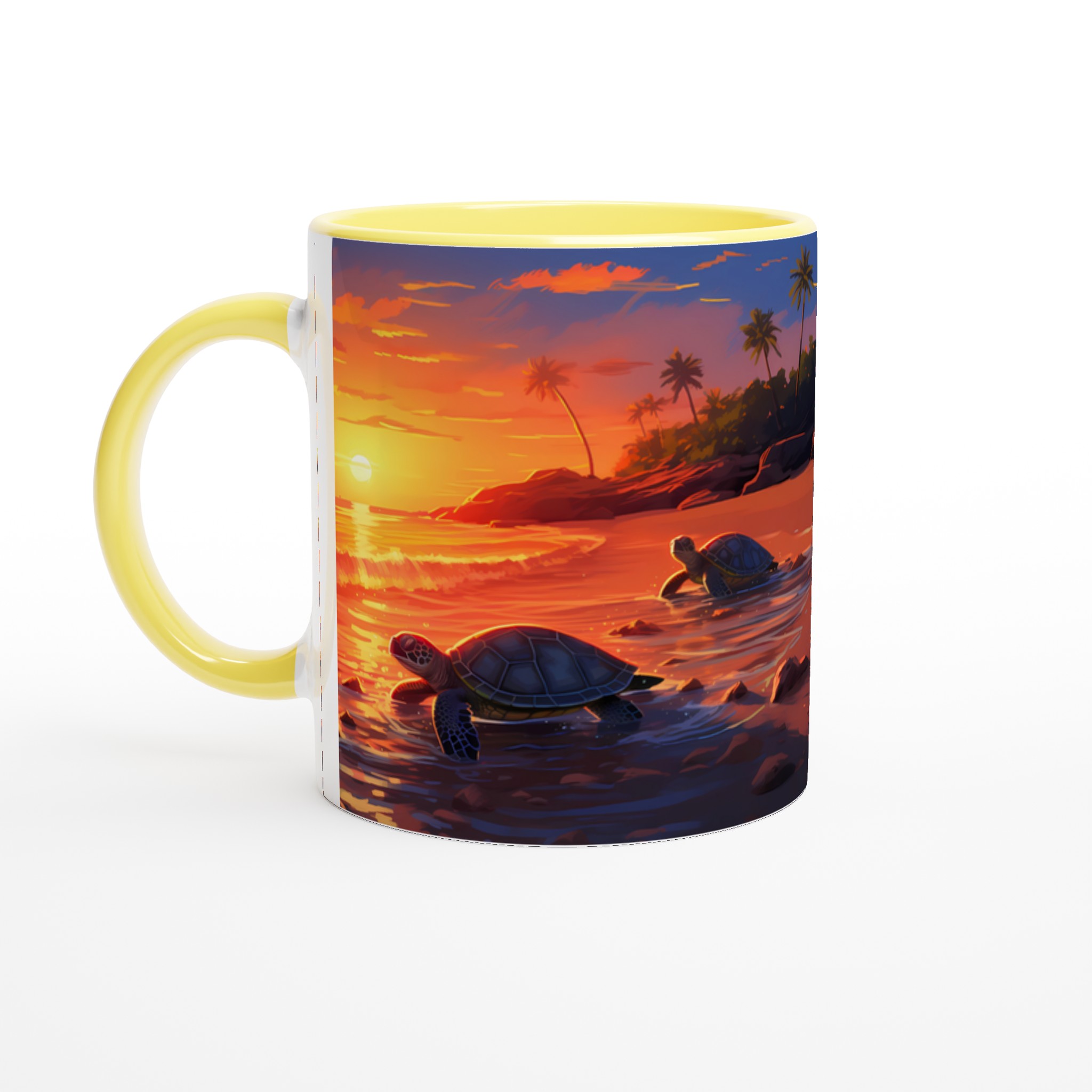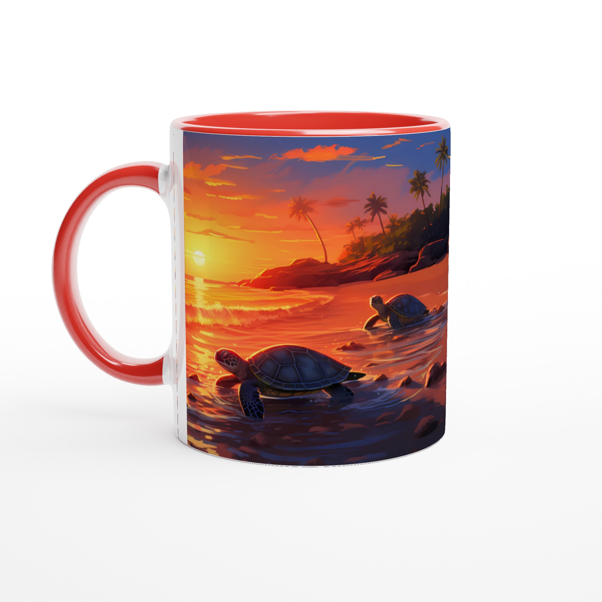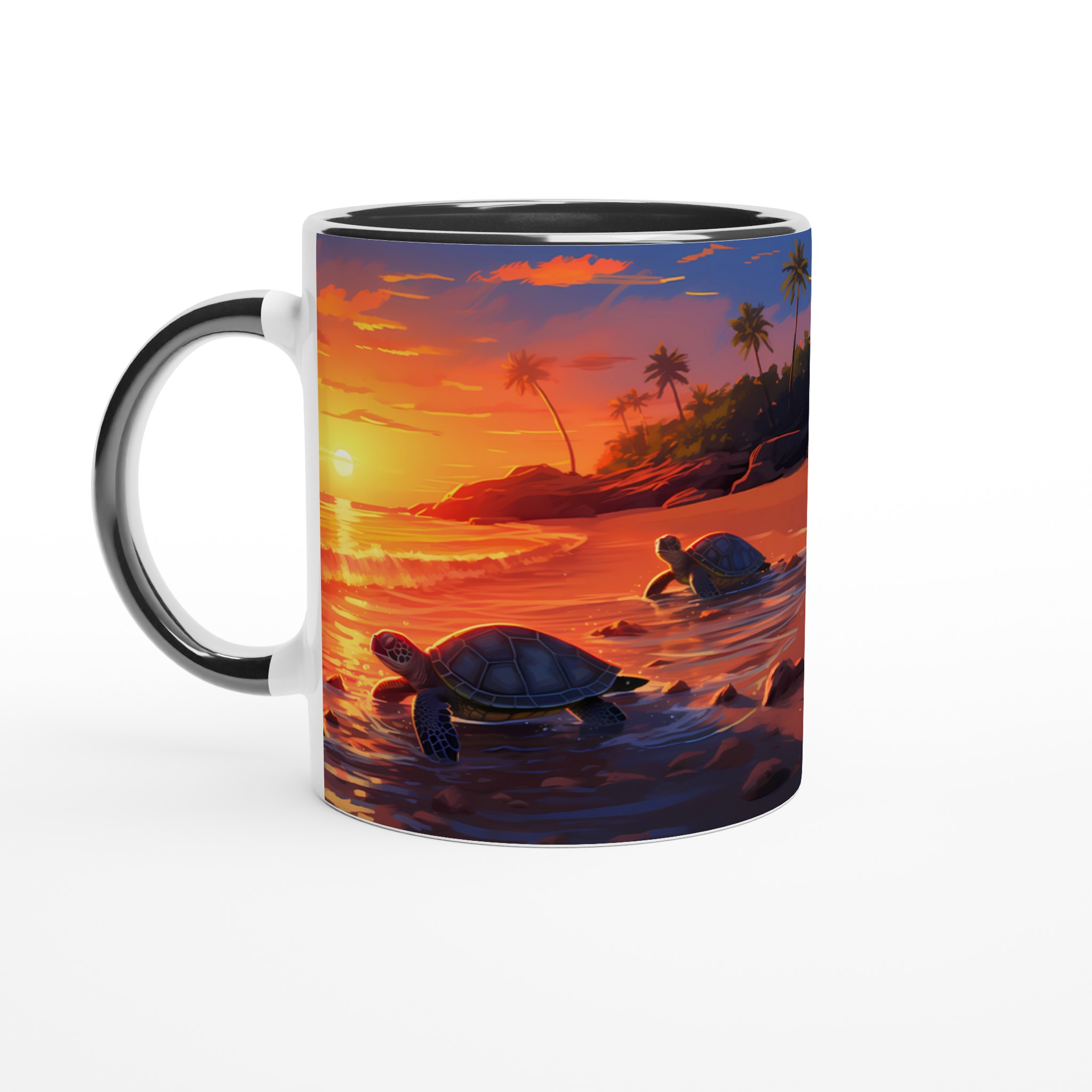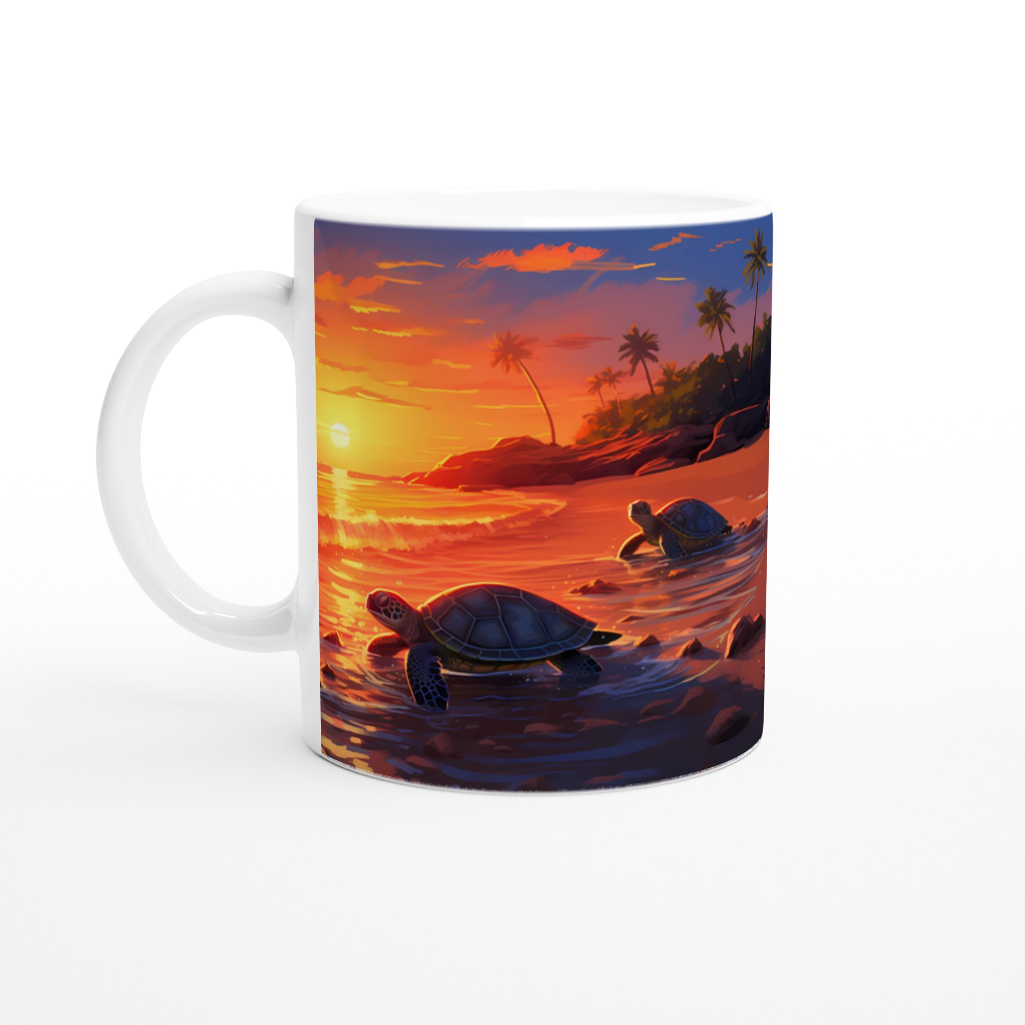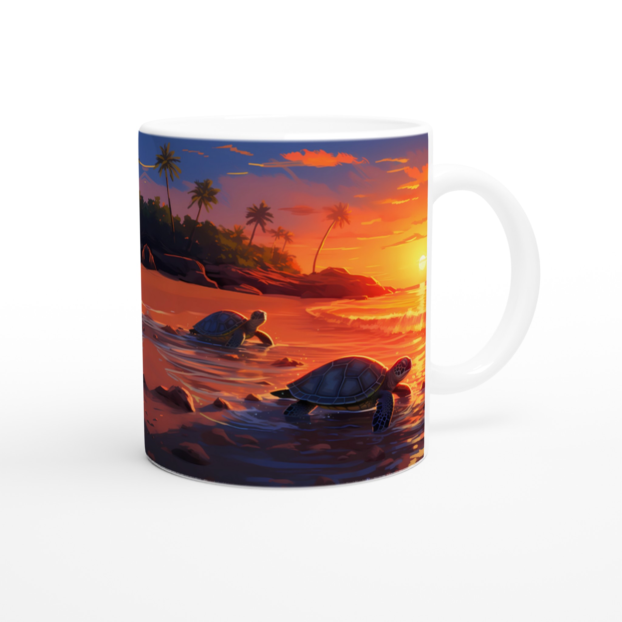 Fånga den magiska känslan av en tropisk solnedgång med denna underbara keramiska mugg, som pryds av ett konstnärligt motiv med sköldpaddor på väg ut i det glittrande havet. De varma, vibrerande färgerna – från djupa orange till lugnande blått – gör varje klunk till en liten semester. Perfekt för morgonkaffet, kvällens varma choklad eller när du bara vill njuta av en kopp te och drömma dig bort till paradiset.