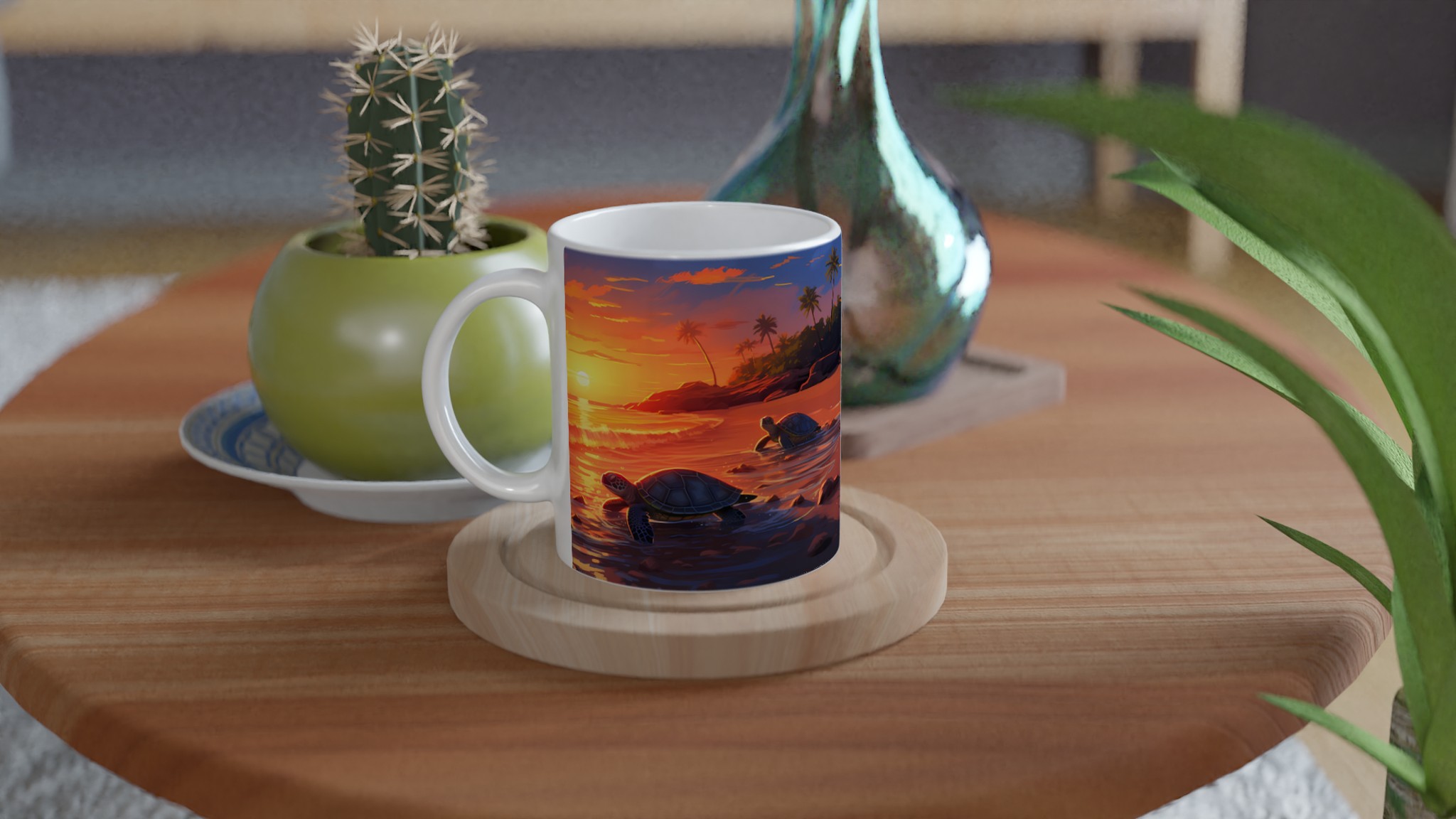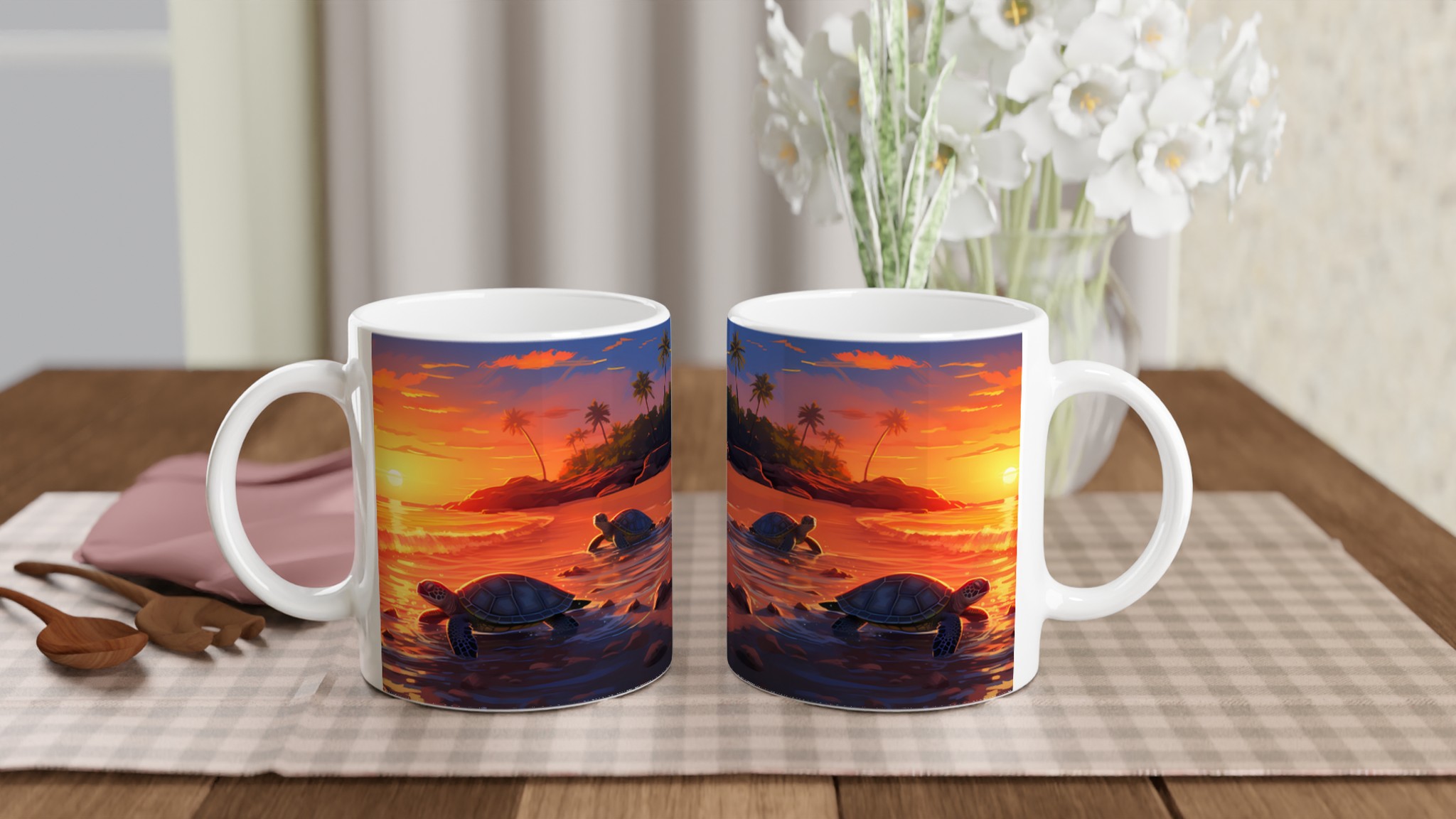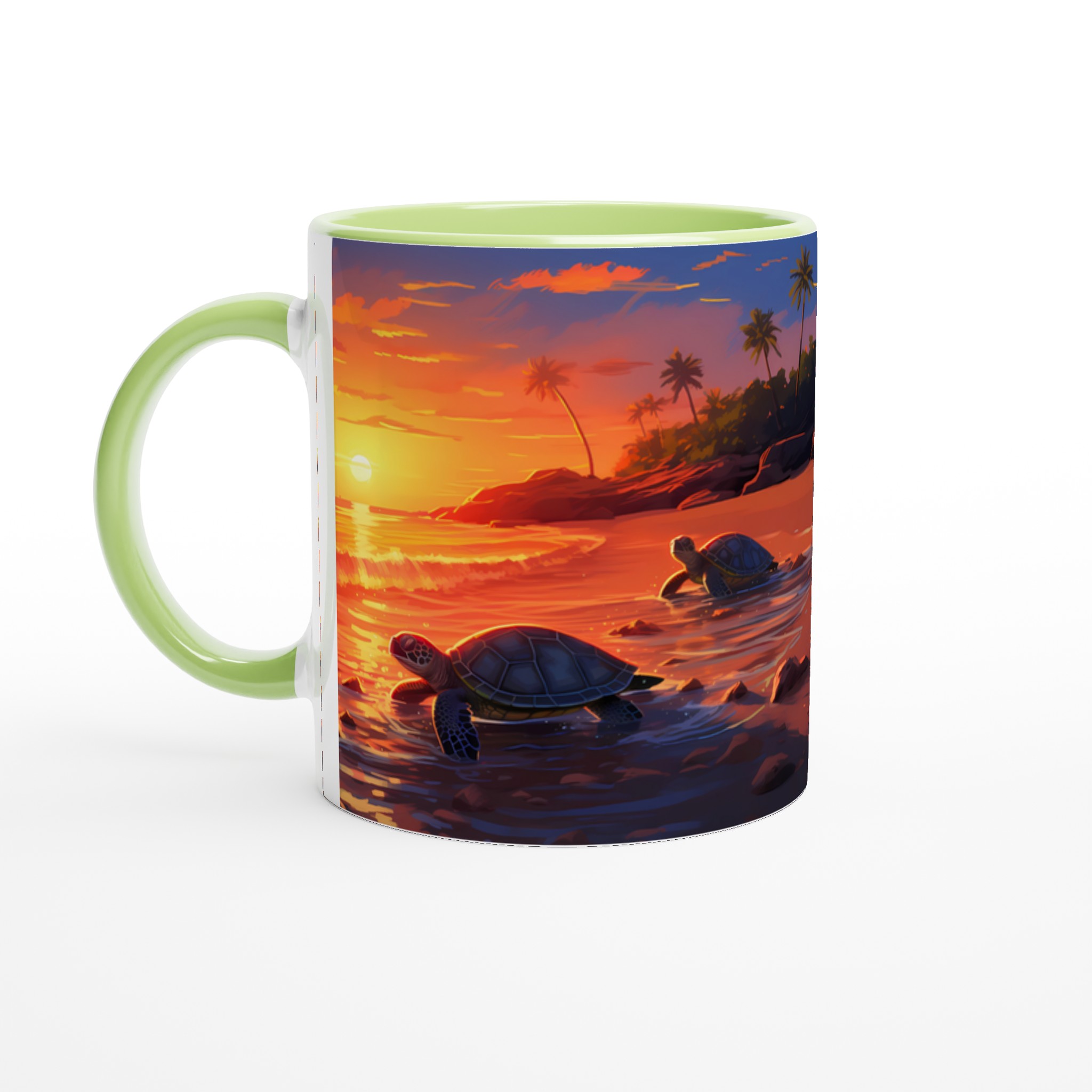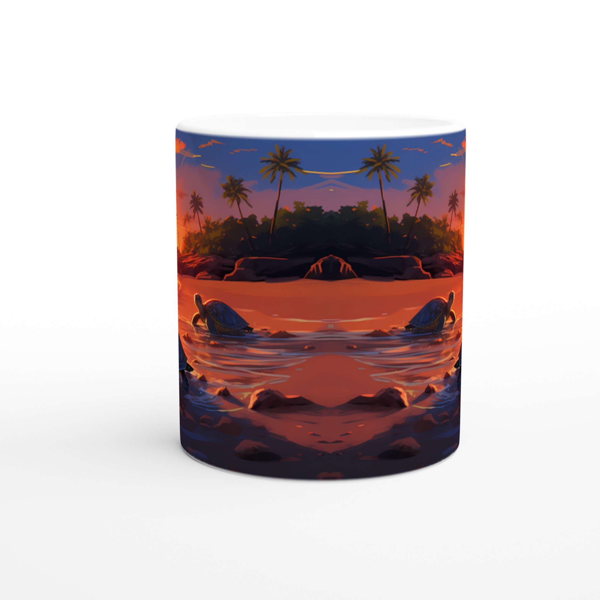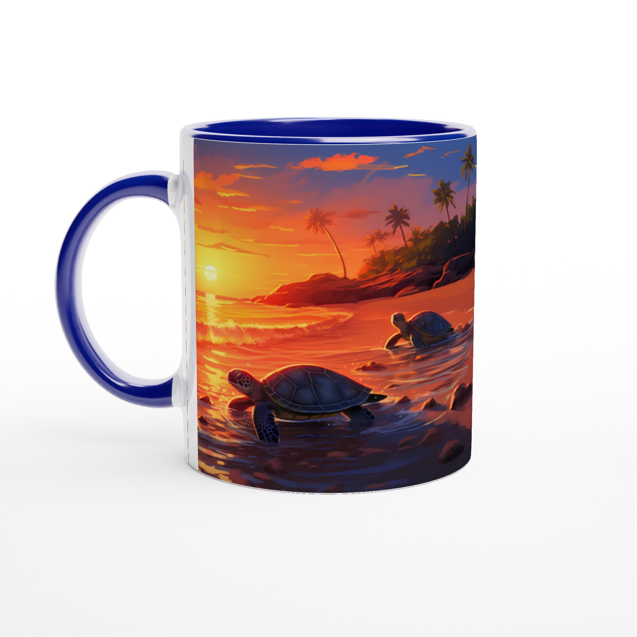 Fånga den magiska känslan av en tropisk solnedgång med denna underbara keramiska mugg, som pryds av ett konstnärligt motiv med sköldpaddor på väg ut i det glittrande havet. De varma, vibrerande färgerna – från djupa orange till lugnande blått – gör varje klunk till en liten semester. Perfekt för morgonkaffet, kvällens varma choklad eller när du bara vill njuta av en kopp te och drömma dig bort till paradiset.