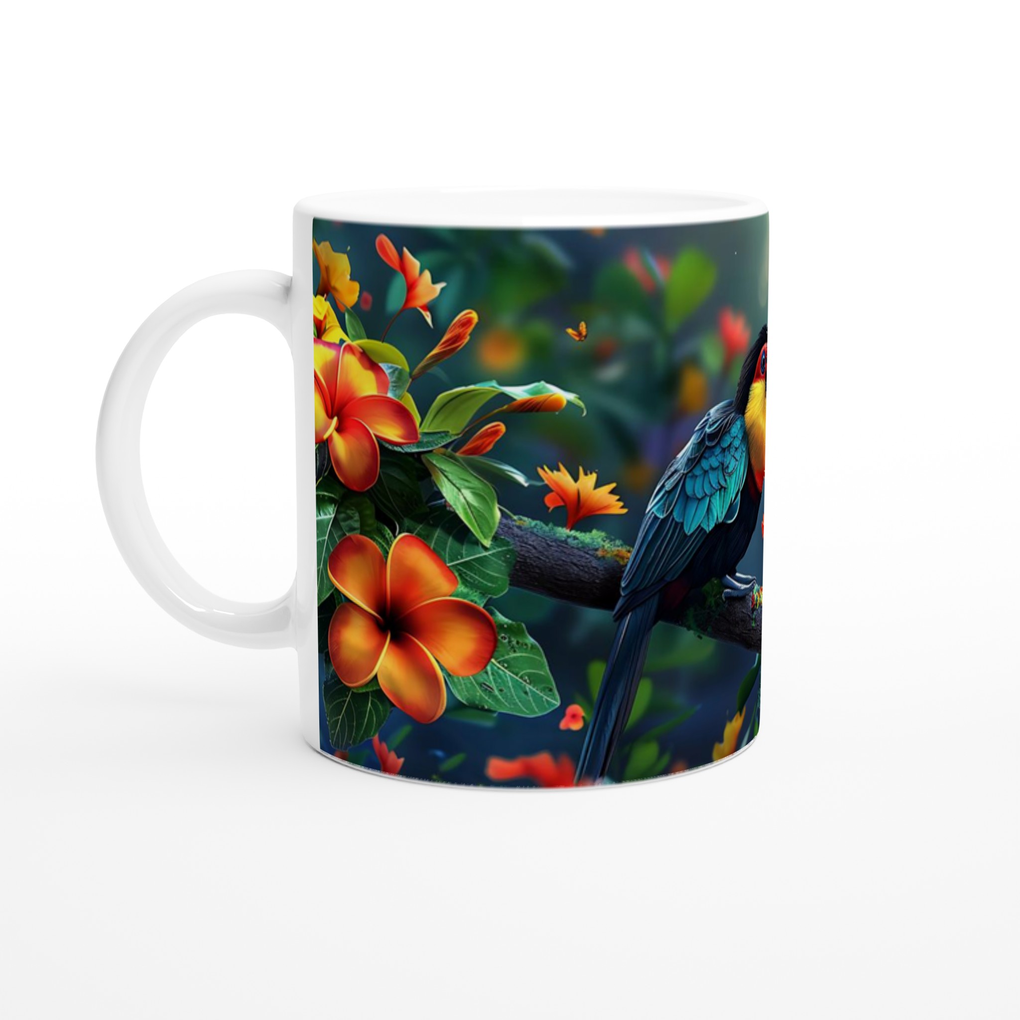 Dröm dig bort till en exotisk regnskog varje gång du tar en klunk med vår Tropiska Toucan Keramikmugg! Denna livfulla design med en färgsprakande toucan omgiven av frodiga blommor och fjärilar, förvandlar din dryckesupplevelse till en minisemester. Välj bland en palett av sju härliga färger – Ceramic White, Yellow, Pink, Green, Red, Black, och Blue – för att matcha din personliga stil eller ge bort som en oförglömlig present.