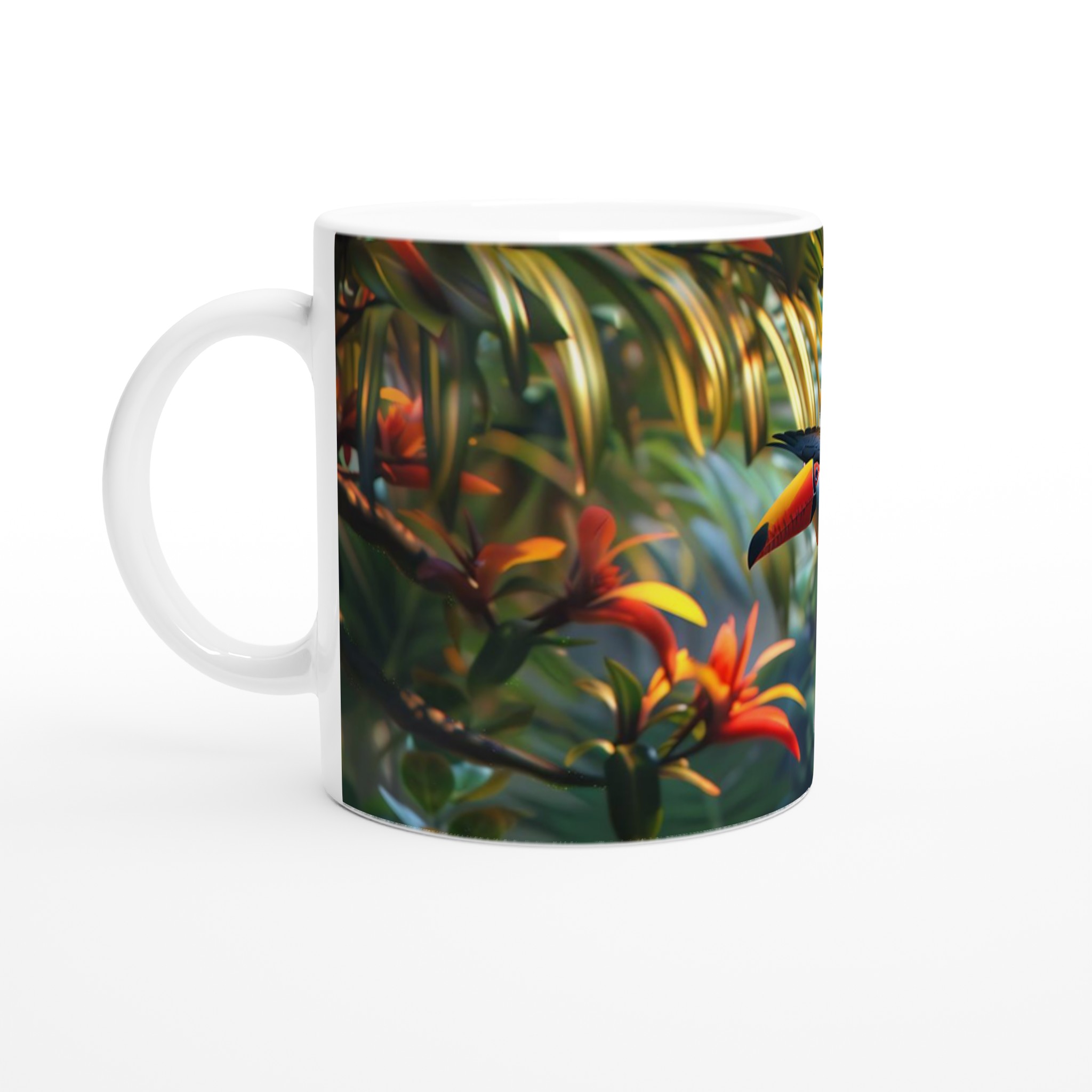 Inspirerad av den livfulla tropiska djungeln, fångar denna mugg essensen av äventyr och färg med en elegant toucan som svävar bland exotiska blommor. Den blanka vita ytan ger ett skarpt och levande tryck som verkligen sticker ut, oavsett om det är en personlig design, ett roligt citat eller en present till någon du tycker om.