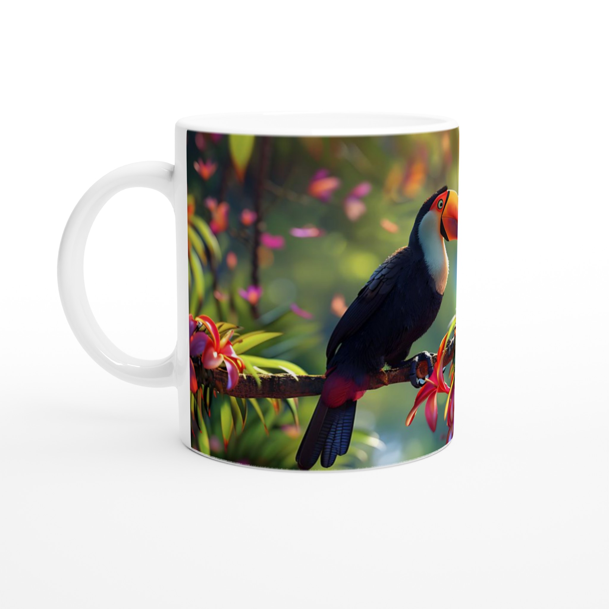 Dröm dig bort till en lummig regnskog med vår Tukan-mugg, där en majestätisk tukan med sin livfulla näbb sitter bland exotiska blommor i en explosion av rött, orange och rosa. Denna mugg fångar den glädjefyllda energin i djungeln, med ett konstnärligt uttryck som för tankarna till en fantasifull sagovärld. Vår blanka vita yta ger ett skarpt och levande tryck som verkligen sticker ut, oavsett om det är en personlig design, ett roligt citat eller en present till någon du tycker om.