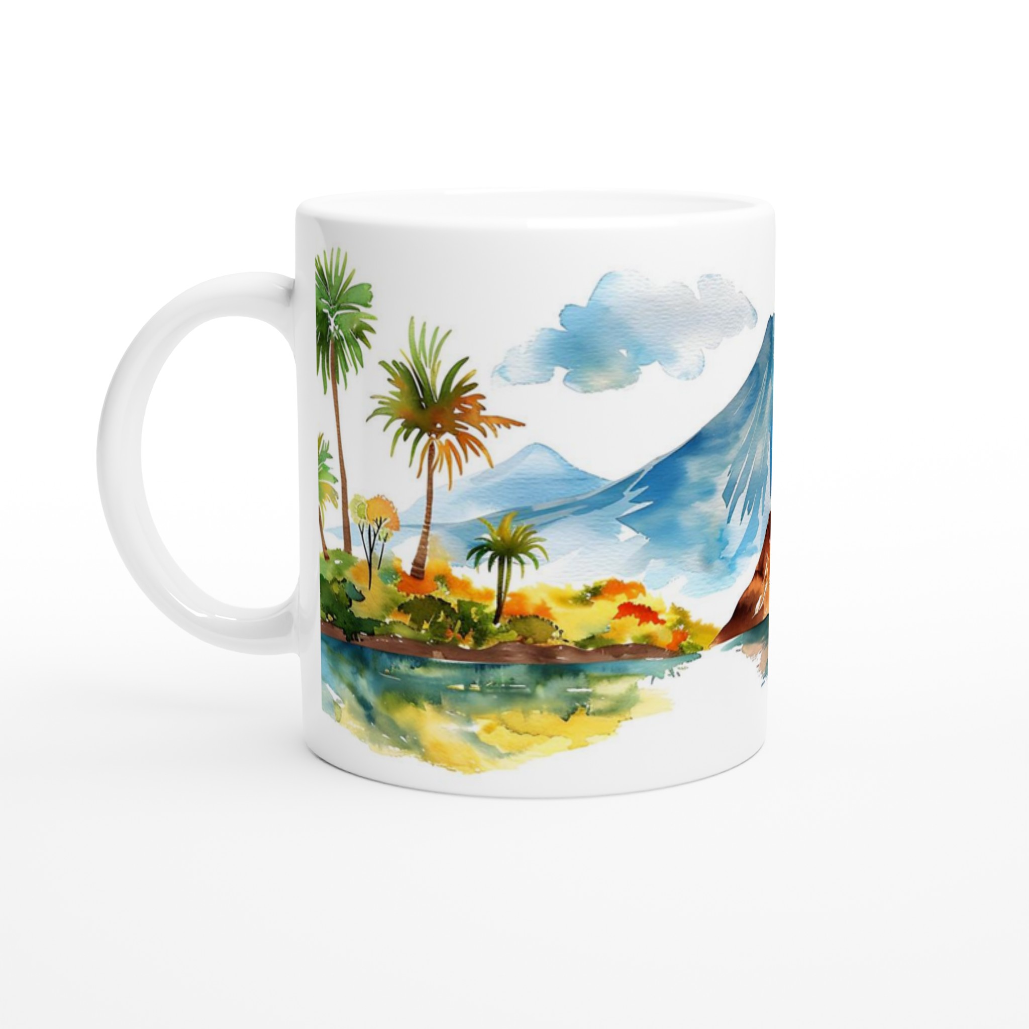 Föreställ dig en lugn tropisk oas varje gång du tar en klunk! Vår 11oz keramikmugg förvandlar din dryckesupplevelse med dess livfulla akvarelldesign av palmer, majestätiska berg och lugna vatten. Denna mugg är perfekt för alla som drömmer om avlägsna paradis och uppskattar konstnärlig charm i vardagen. Välj din favoritfärg bland sju fantastiska alternativ för att personifiera din upplevelse och addera en skvätt karibisk glädje till din samling.