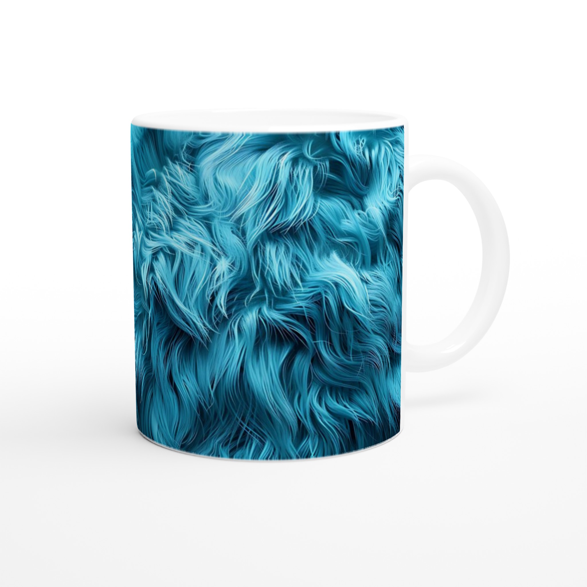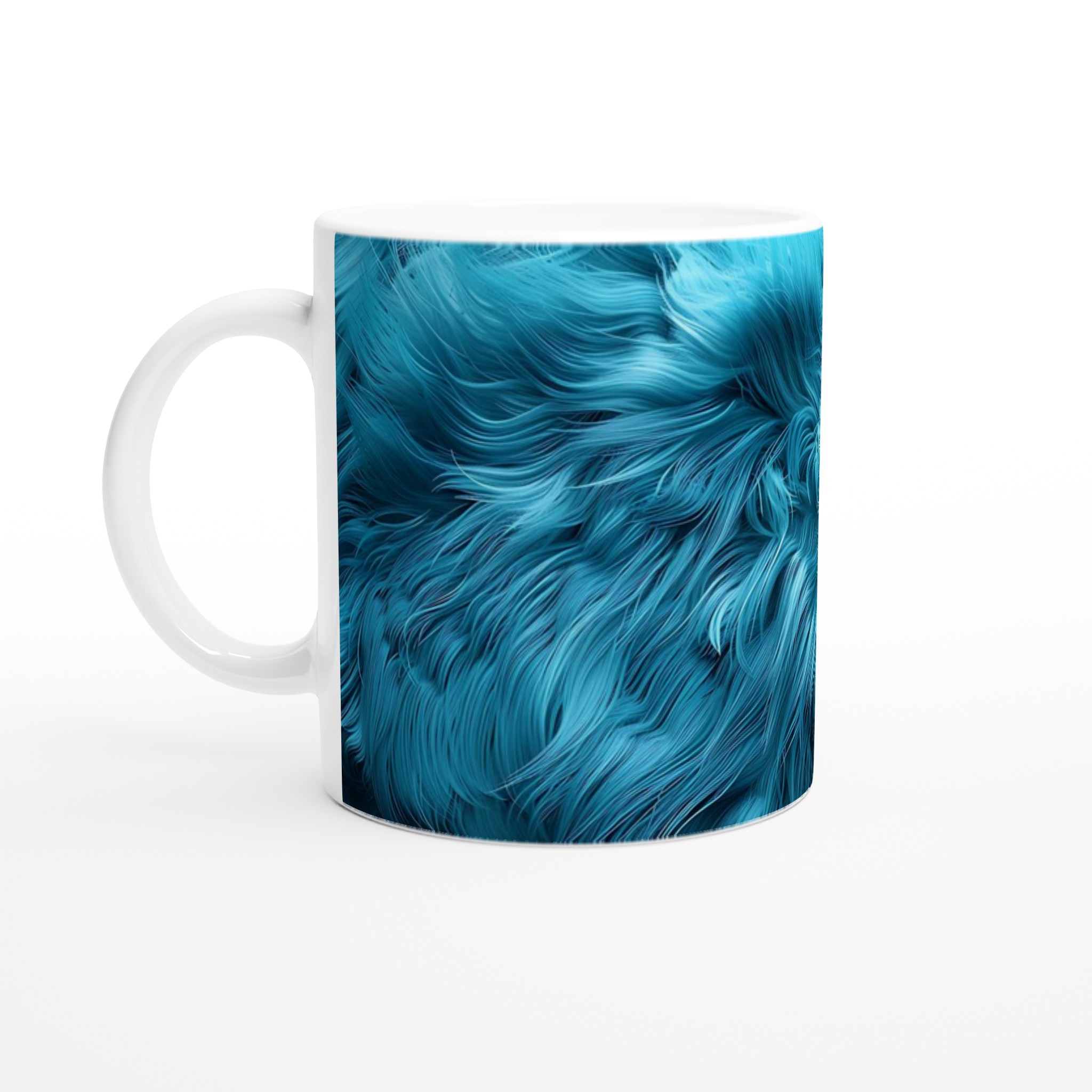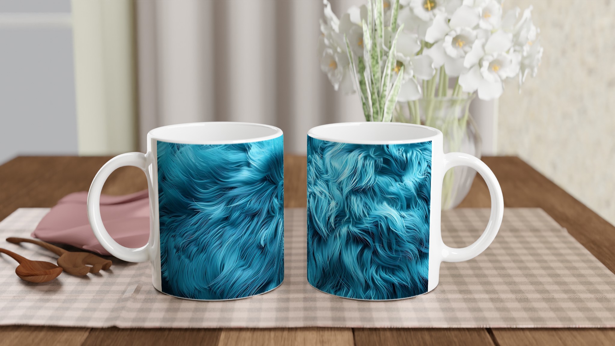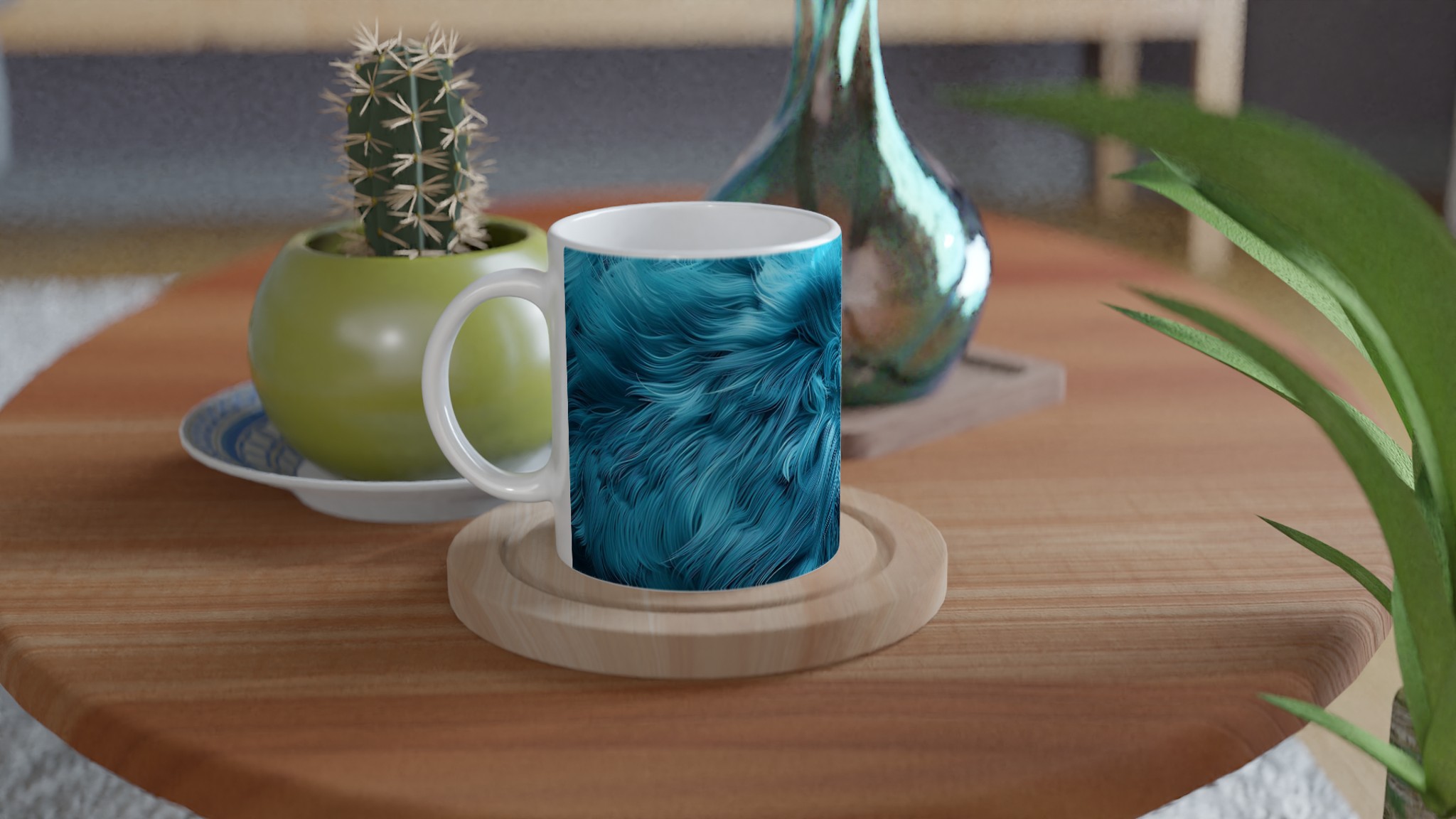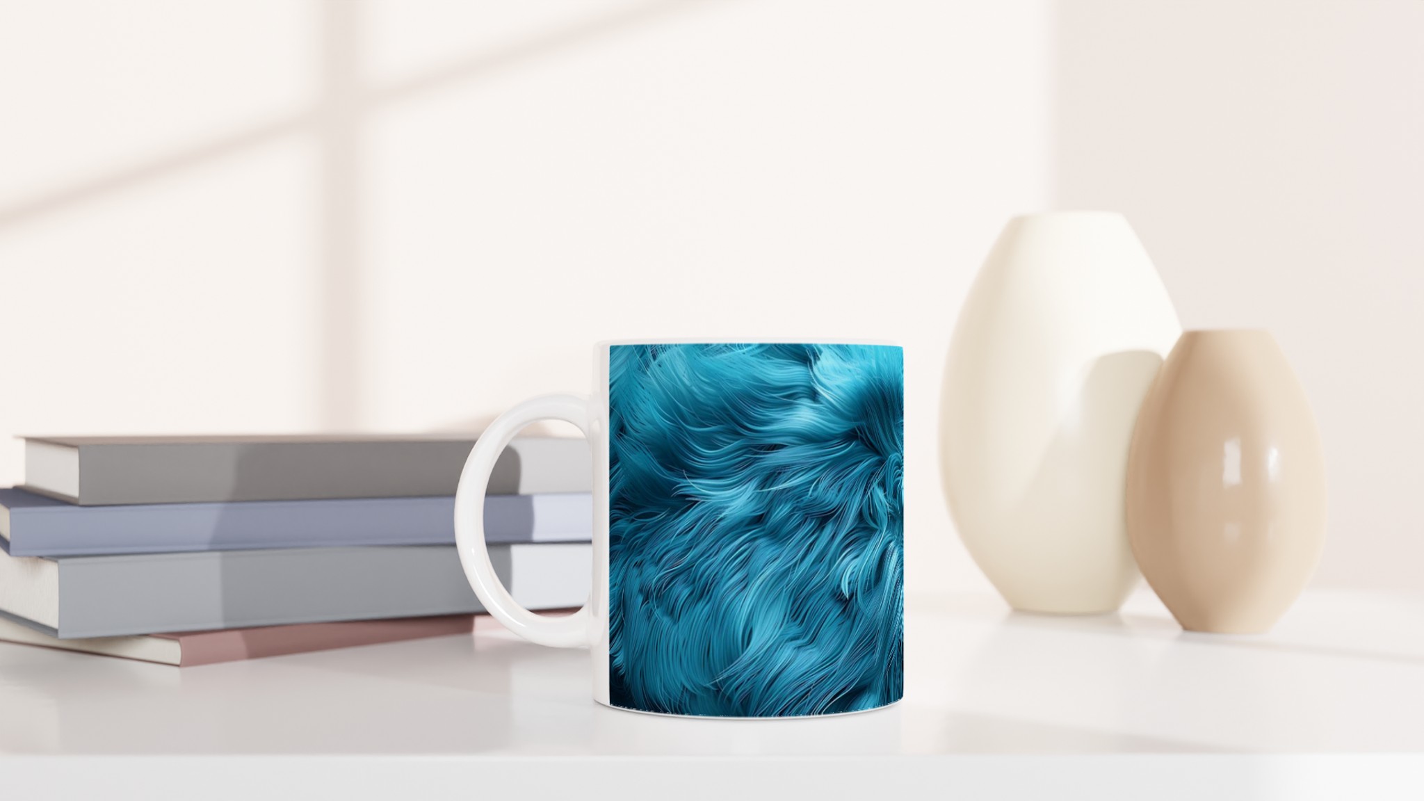 Kliv in i en värld av lugn och stil med denna keramiska mugg, prydd med ett förtrollande turkost vågmönster. Inspirationen från bildens djupblå toner och flytande former ger muggen en unik och avkopplande estetik. Den här stilrena keramiska muggen blir snabbt en vardagsfavorit. Perfekt för morgonkaffet, kvällens varma choklad eller när du bara vill njuta av en kopp te. Den blanka vita ytan gör att trycken framhävs med klara och levande färger, som håller sig fina även efter många turer i mikron och diskmaskinen.