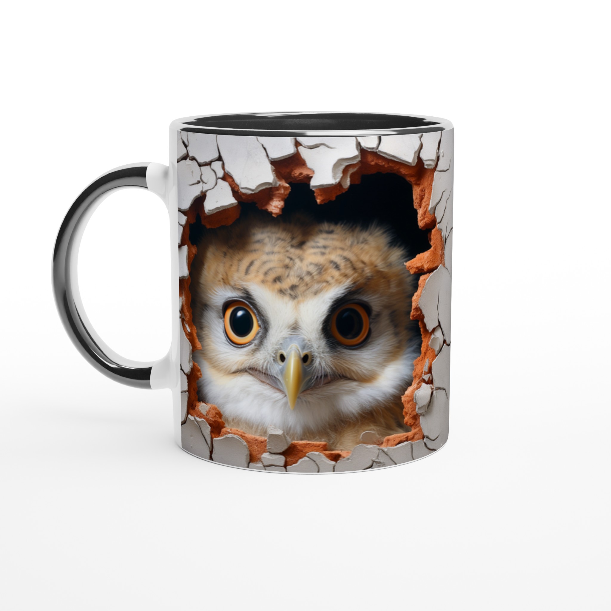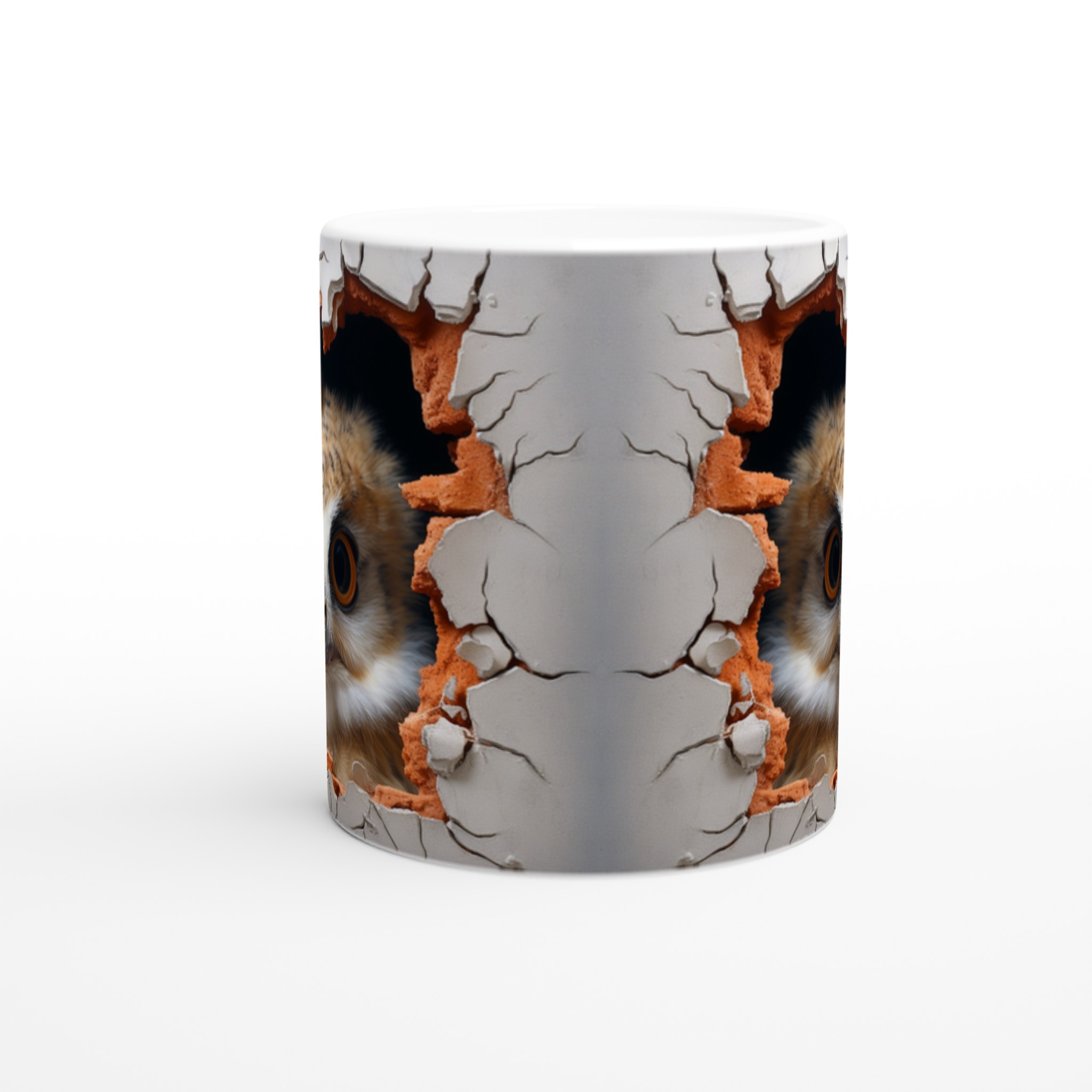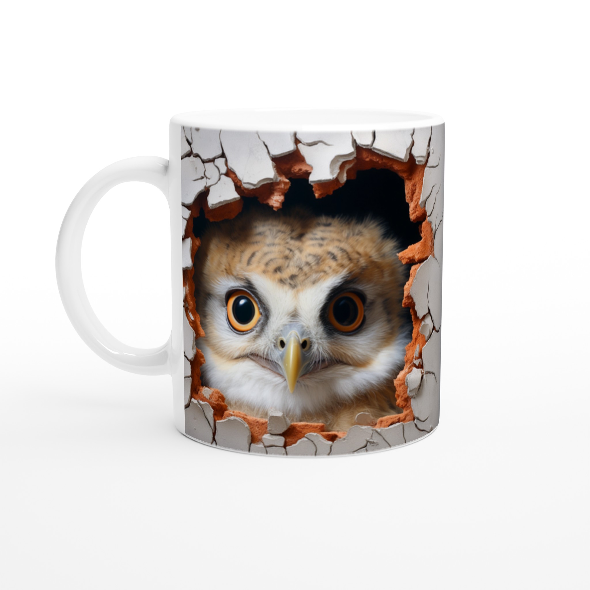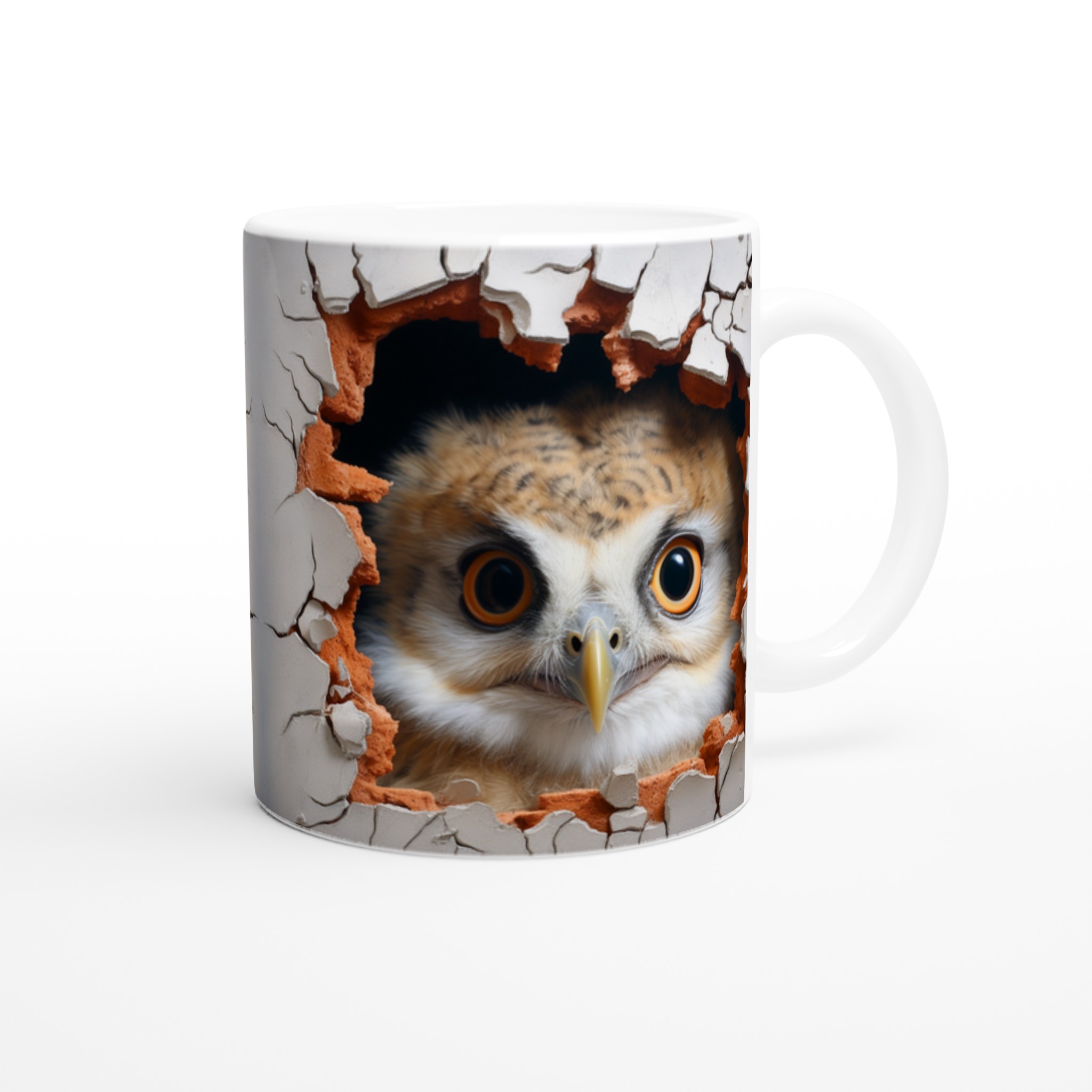Överraska dig själv eller någon du håller kär med denna oemotståndliga keramiska mugg, prydd med en förtrollande uggla som nyfiket kikar fram ur en sprucken vägg. Denna charmiga design skapar en känsla av mystik och lekfullhet, perfekt för dig som älskar djur och uppskattar en touch av det oväntade i vardagen. Med sina uttrycksfulla ögon och den varma färgpaletten av jordnära toner mot en neutral bakgrund, blir varje sip en liten upplevelse.