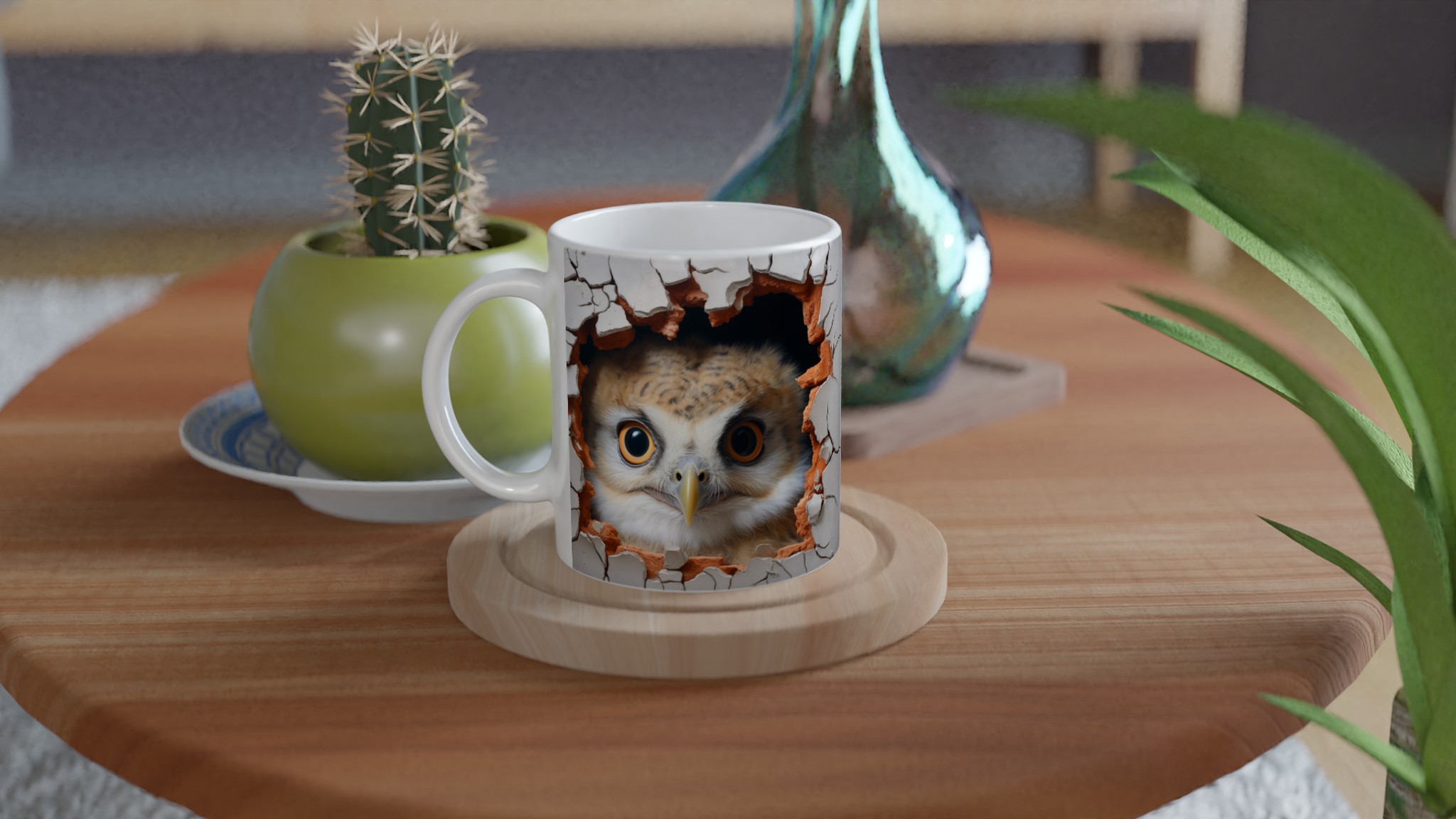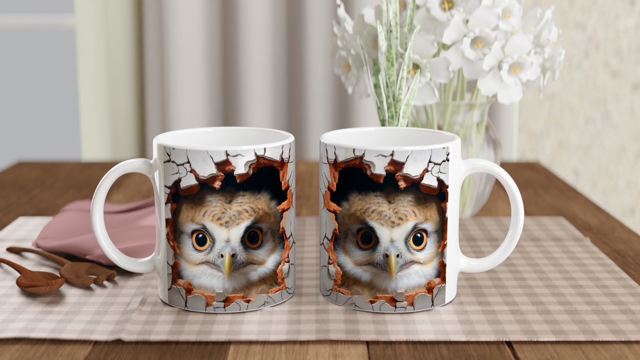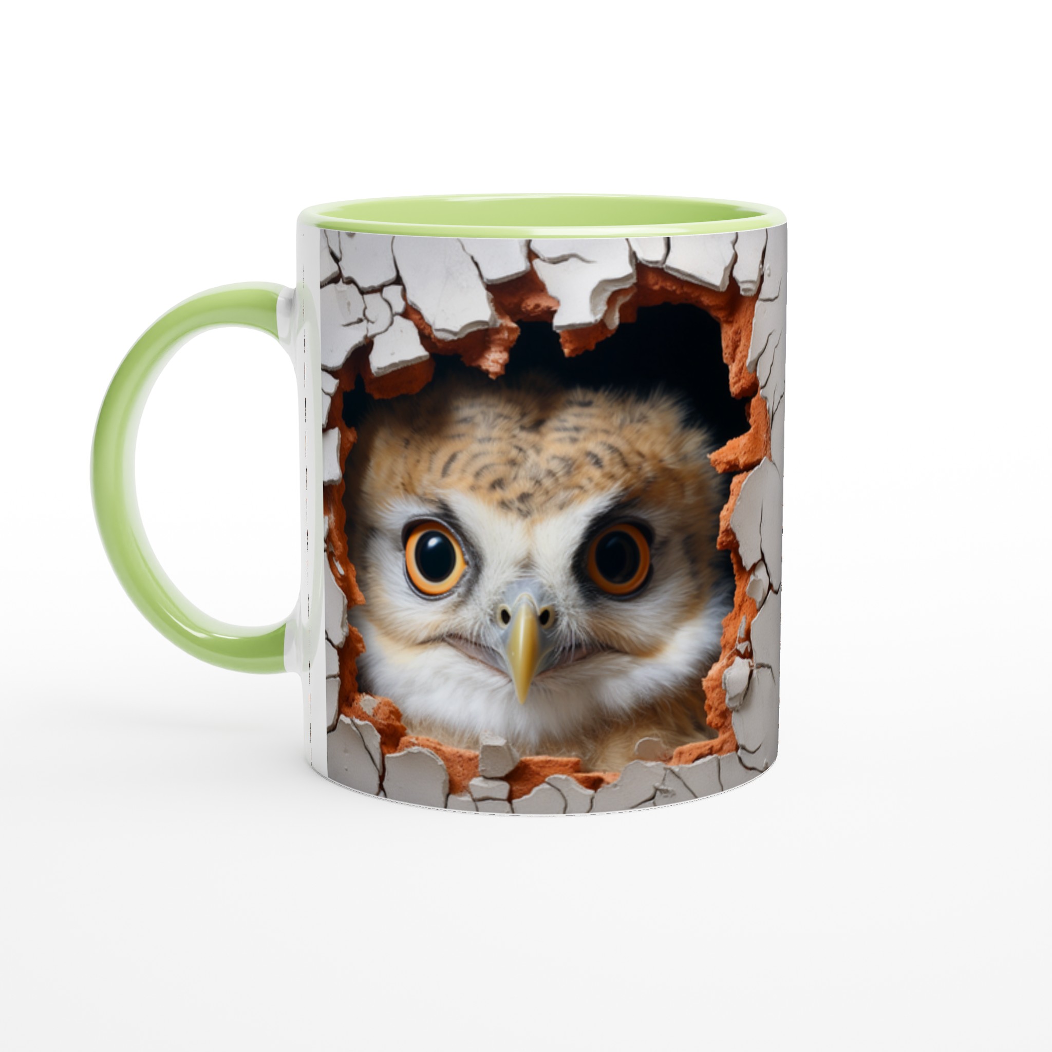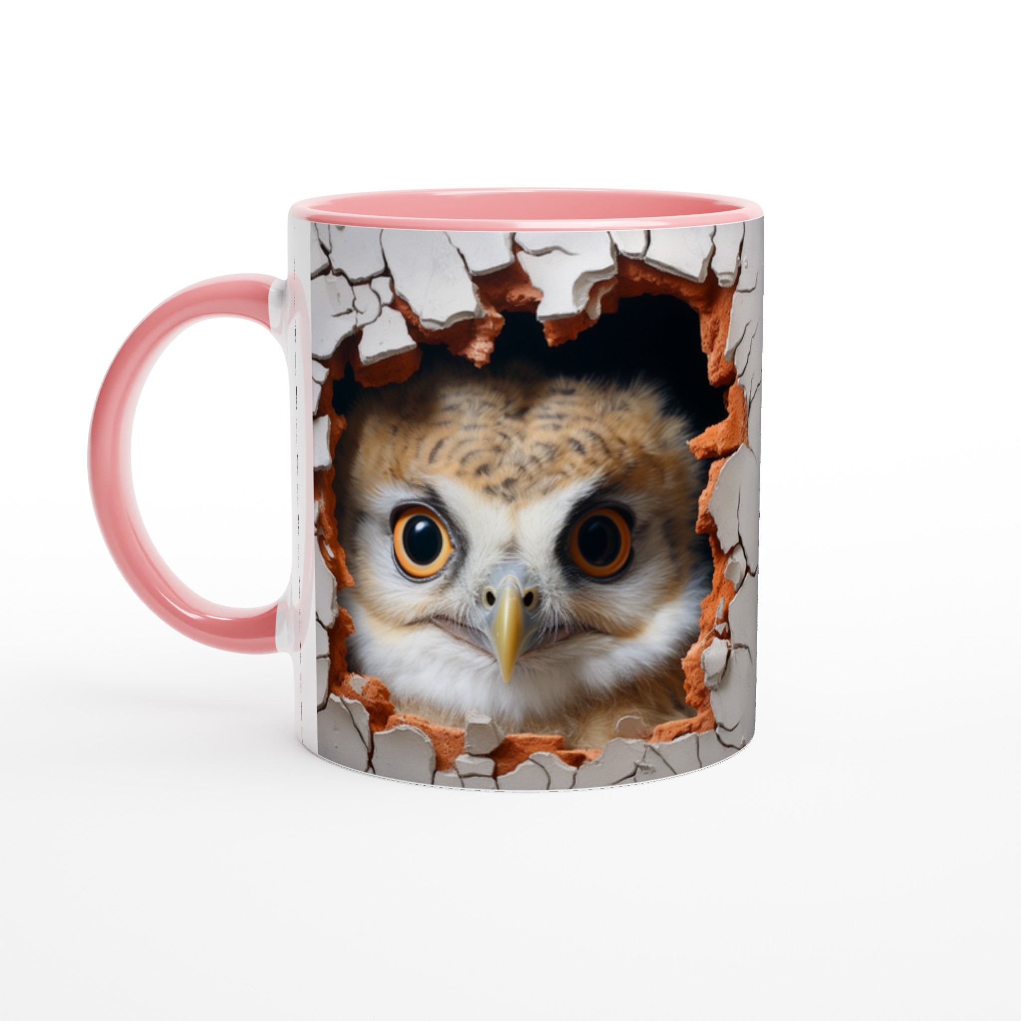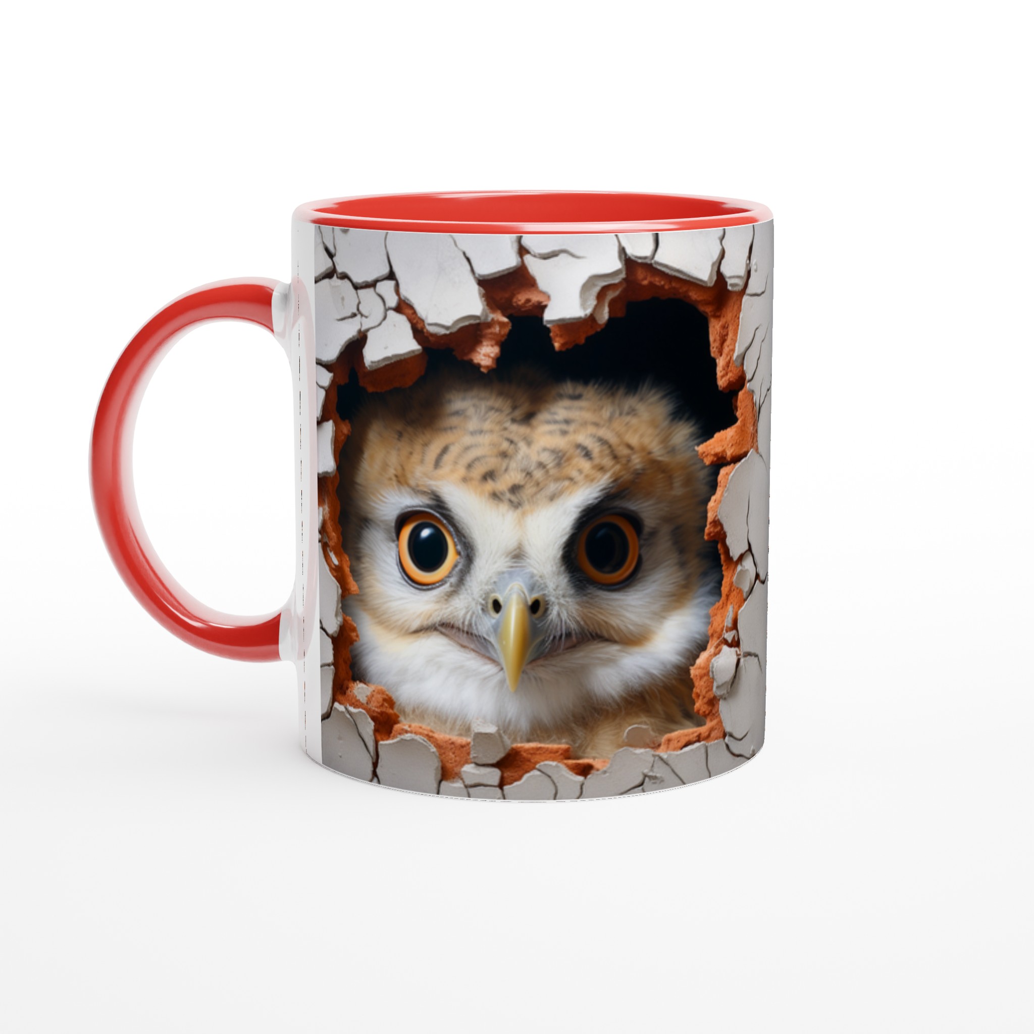 Överraska dig själv eller någon du håller kär med denna oemotståndliga keramiska mugg, prydd med en förtrollande uggla som nyfiket kikar fram ur en sprucken vägg. Denna charmiga design skapar en känsla av mystik och lekfullhet, perfekt för dig som älskar djur och uppskattar en touch av det oväntade i vardagen. Med sina uttrycksfulla ögon och den varma färgpaletten av jordnära toner mot en neutral bakgrund, blir varje sip en liten upplevelse.