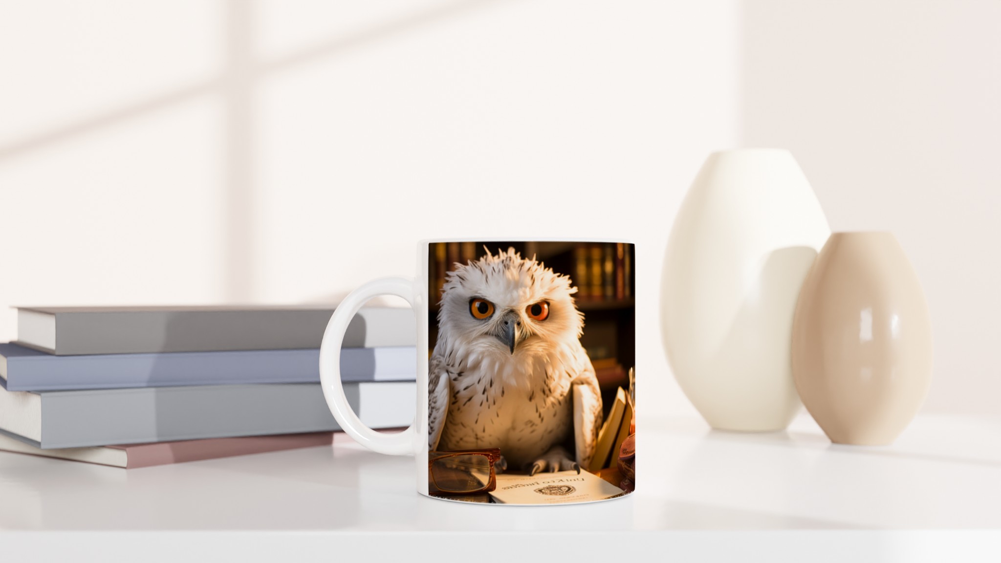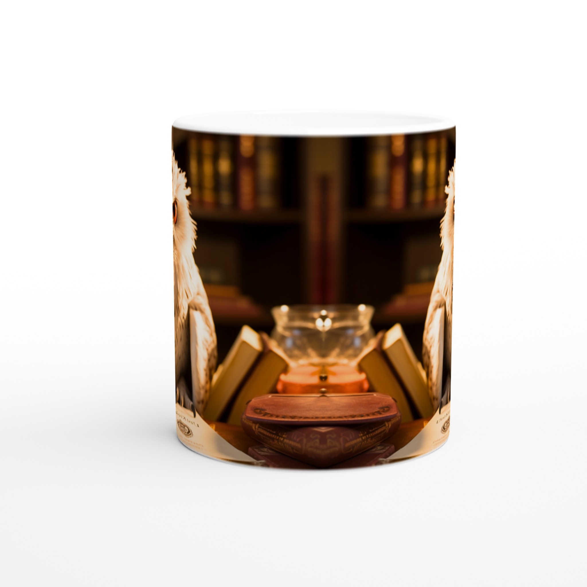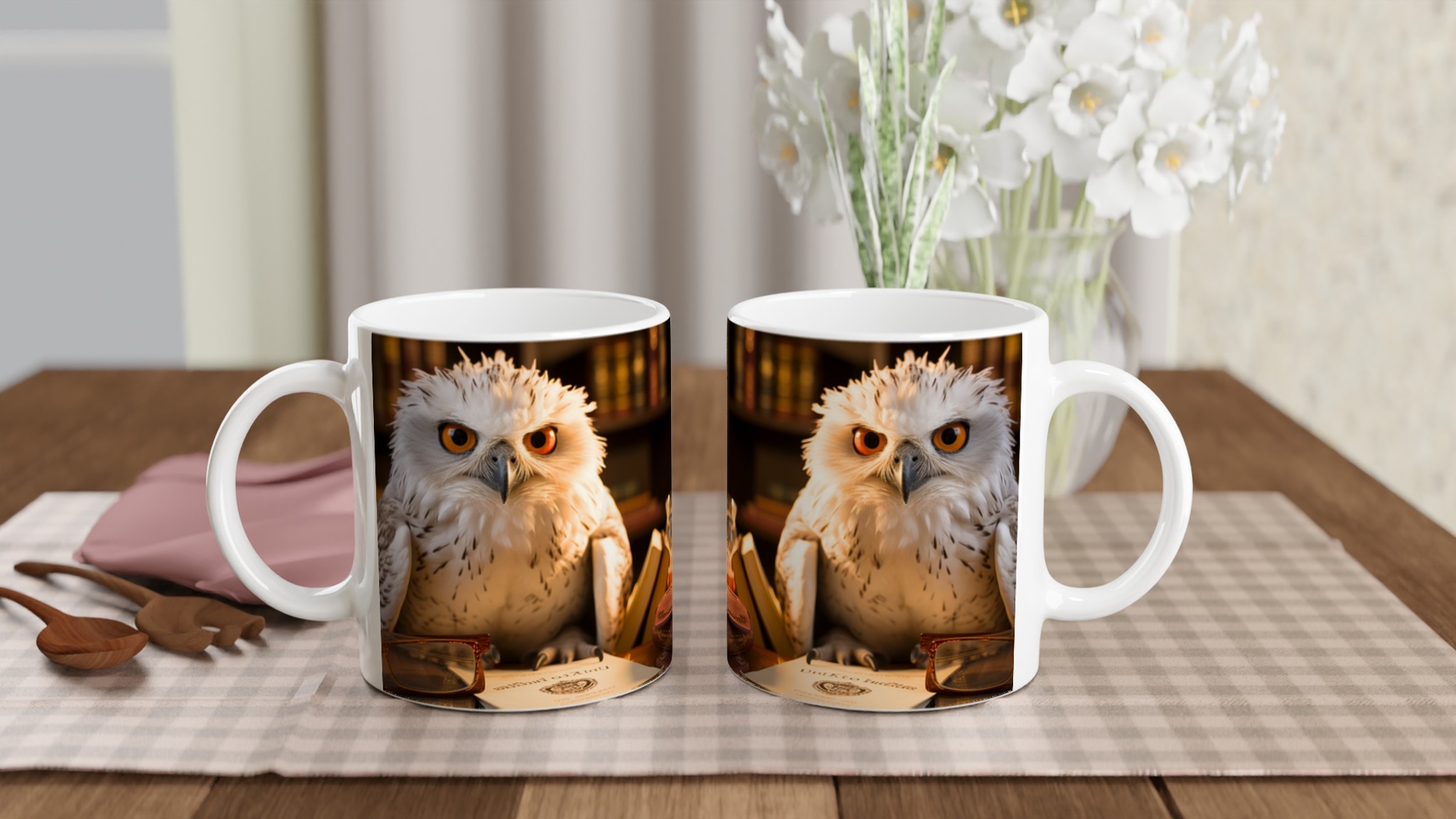 Låt dig inspireras av visdom och mystik med vår unika keramiska mugg, prydd med en majestätisk uggla i en bokfylld miljö. Denna mugg blir snabbt en vardagsfavorit, perfekt för att förhöja dina morgonkaffen, mysiga te-stunder eller när du djupdyker i en god bok. Den blanka vita ytan framhäver det intrikata ugglemotivet med klara och levande färger, som håller sig fina även efter otaliga turer i mikron och diskmaskinen.