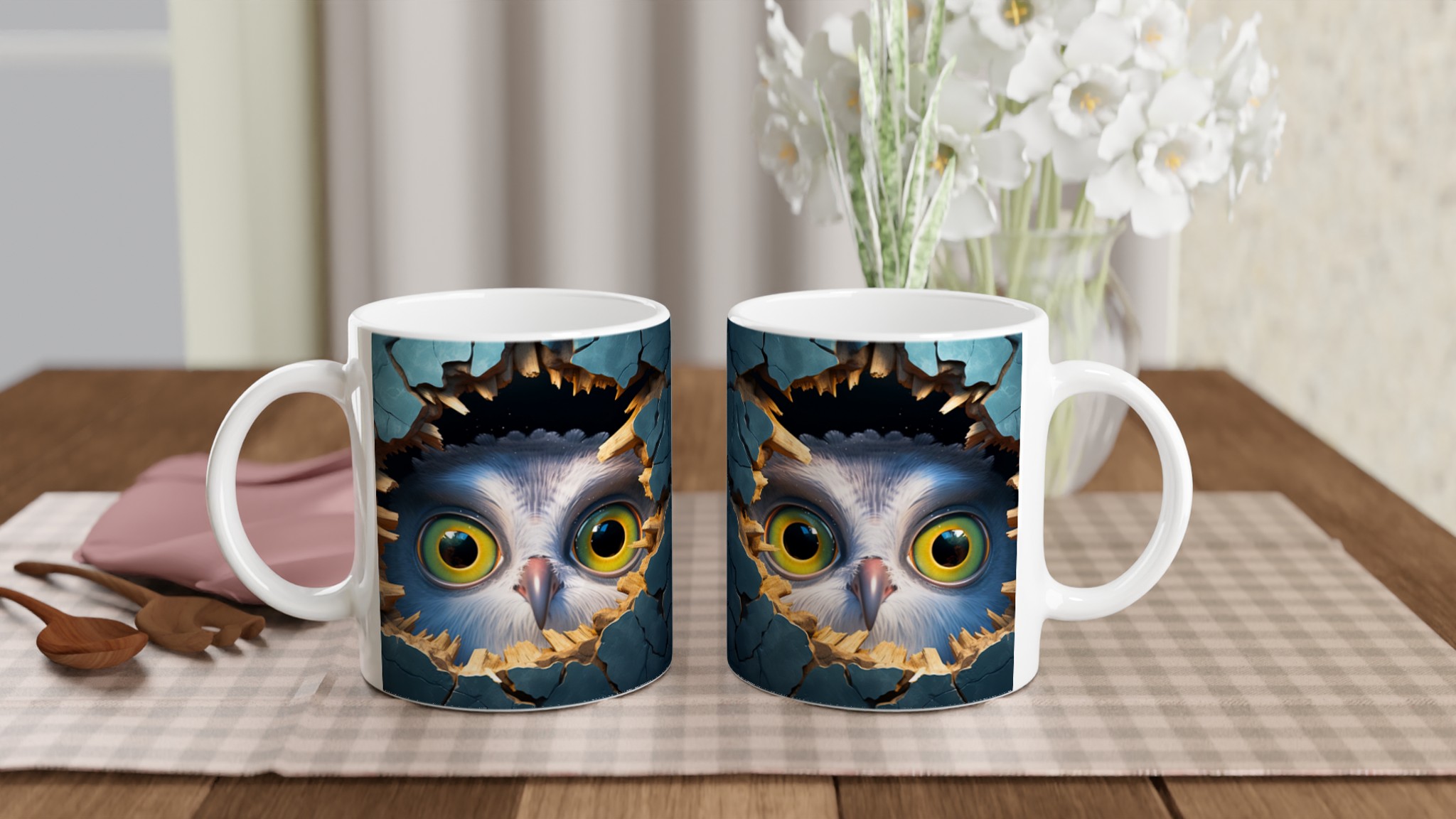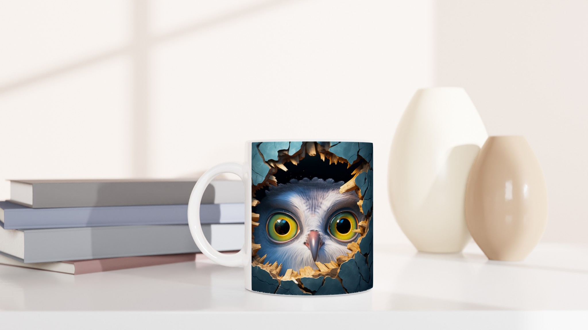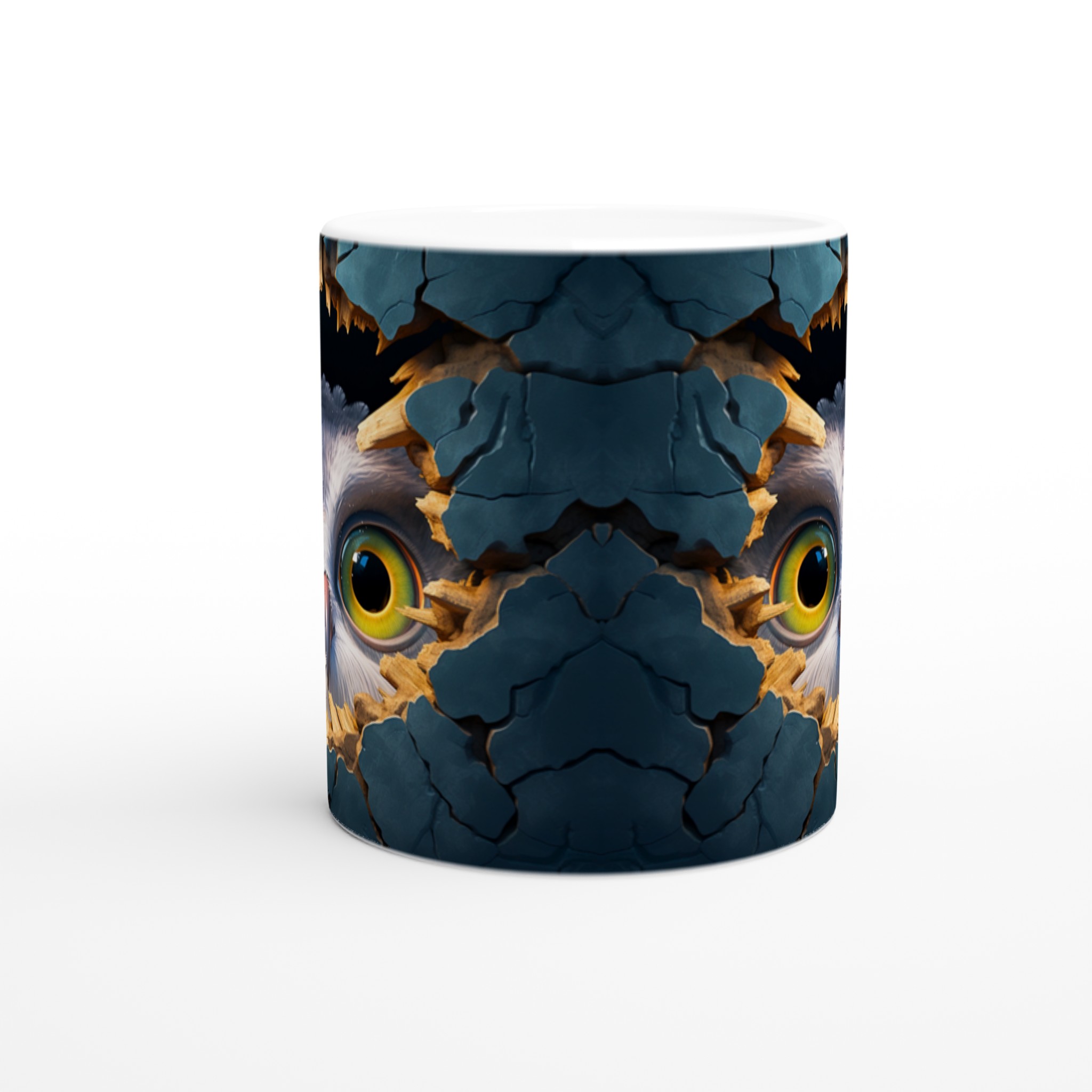 Låt denna unika keramiska mugg med sitt fängslande uggleögonmotiv bli din nya vardagsfavorit! De uttrycksfulla ögonen, som kikar fram ur en sprucken yta, ger varje sip en touch av mystik och charm. Perfekt för morgonkaffet, kvällens varma choklad eller när du bara vill njuta av en kopp te. Den blanka ytan gör att trycken framhävs med klara och levande färger, som håller sig fina även efter många turer i mikron och diskmaskinen.
