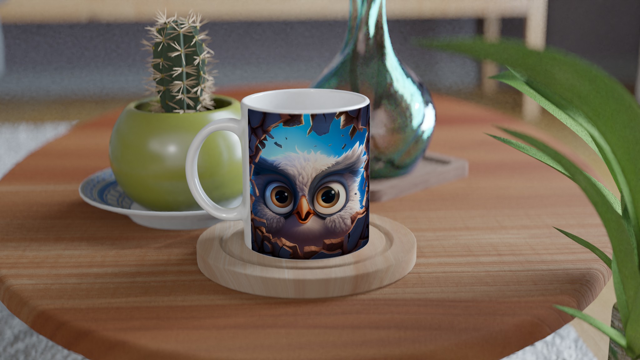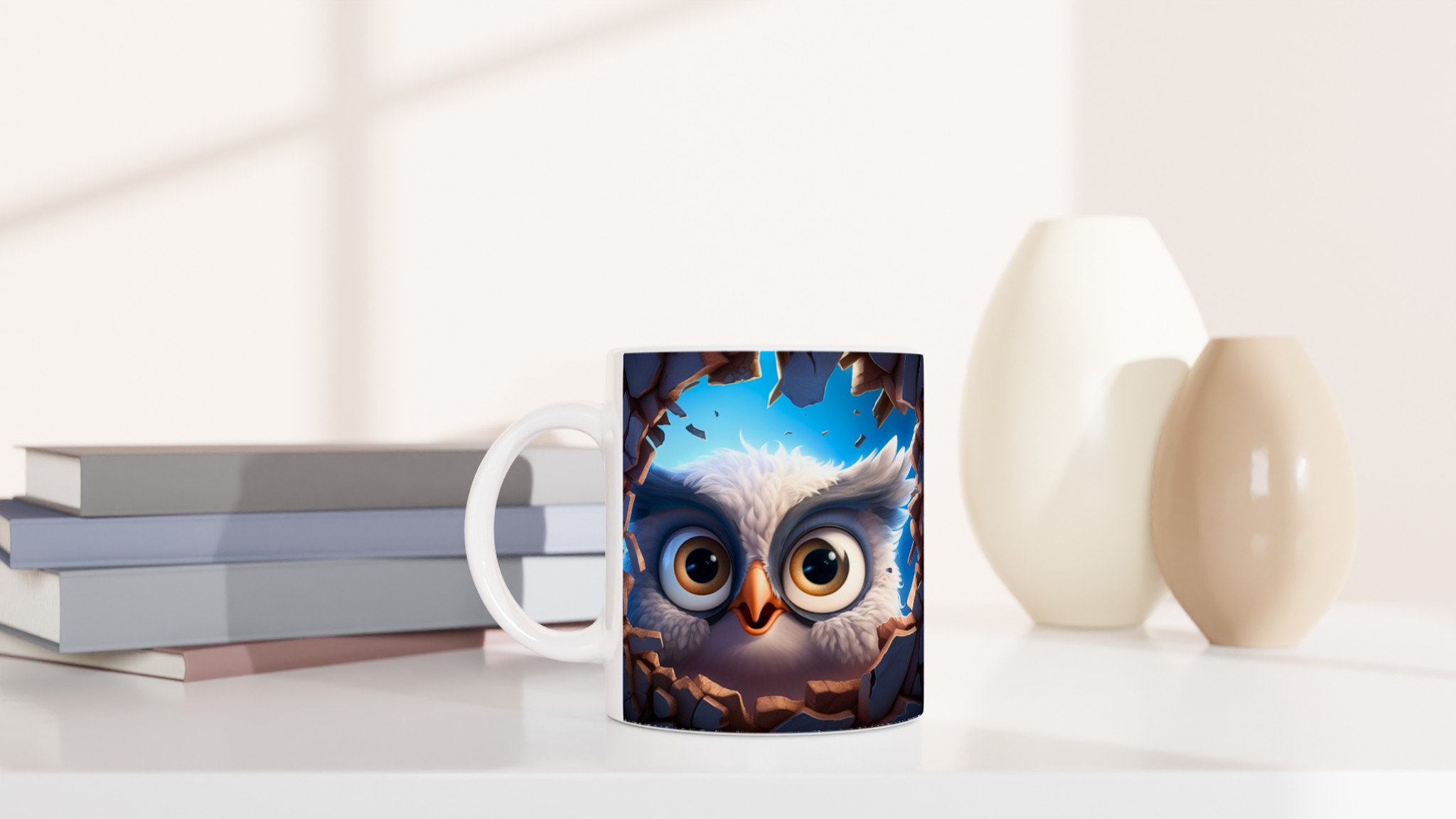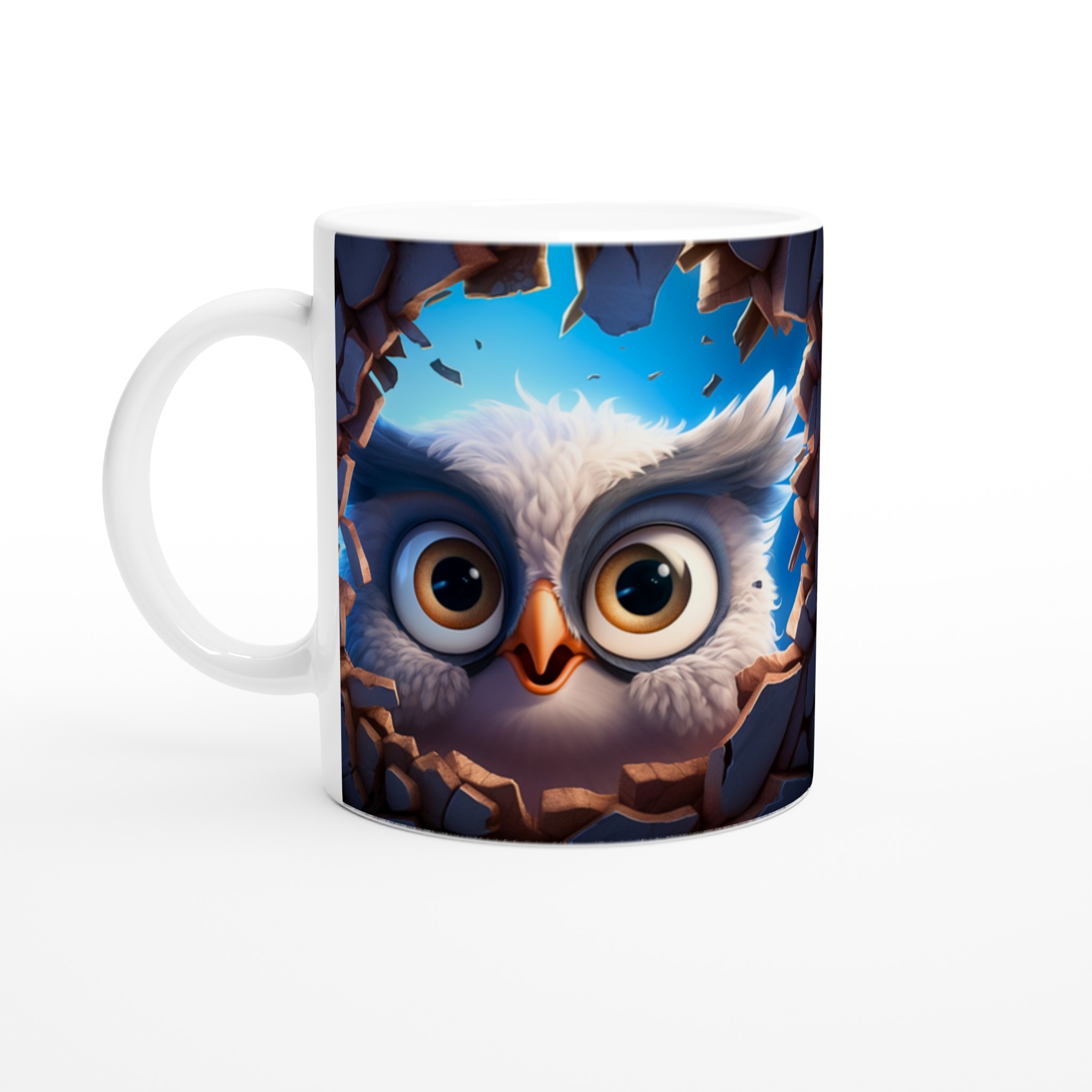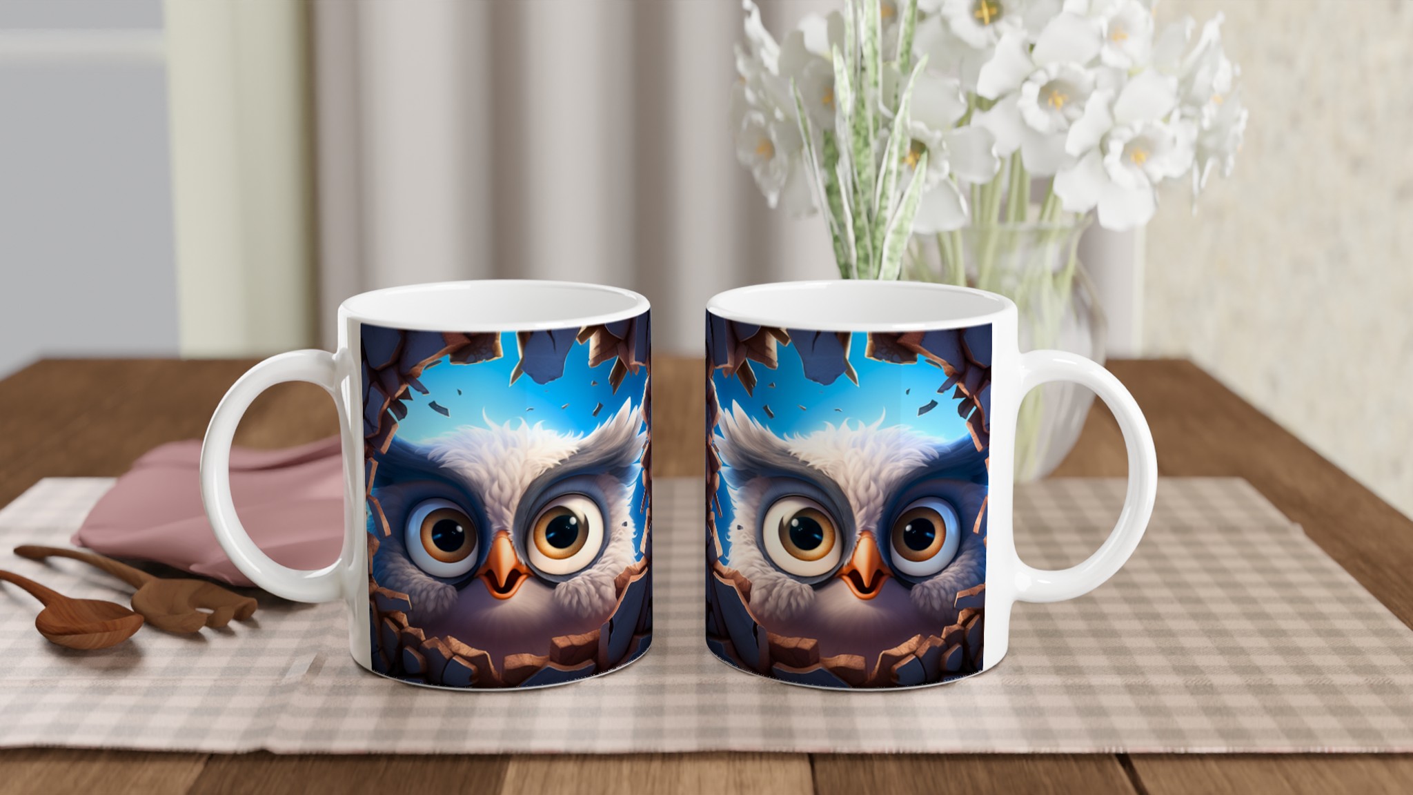 Låt dessa nyfikna små ugglor kika fram och förgylla din fikastund! Denna charmiga keramiska mugg blir snabbt en favorit för alla som älskar en touch av lekfull magi i vardagen. Perfekt för morgonkaffet, kvällens varma choklad eller när du bara vill njuta av en kopp te. Den blanka vita ytan gör att trycken framhävs med klara och levande färger, som håller sig fina även efter många turer i mikron och diskmaskinen.