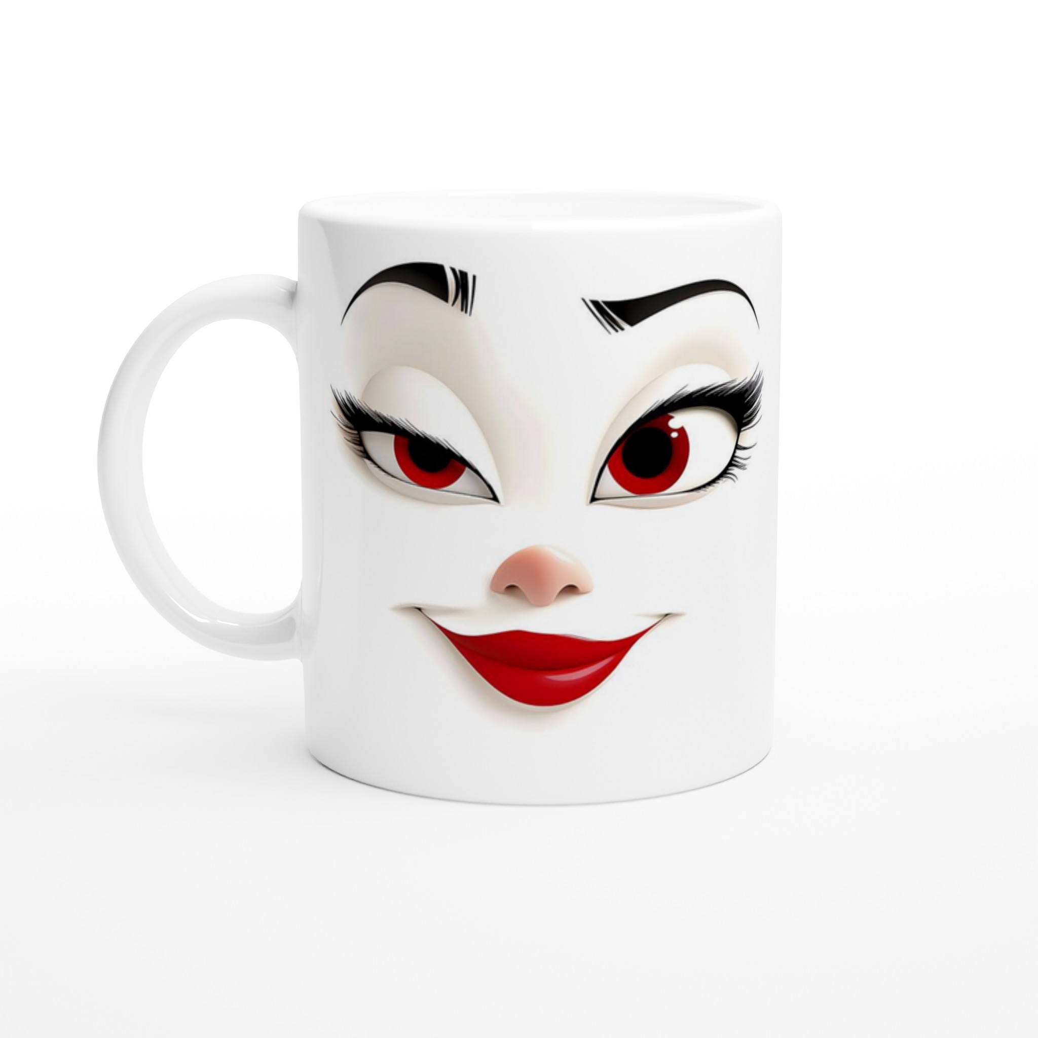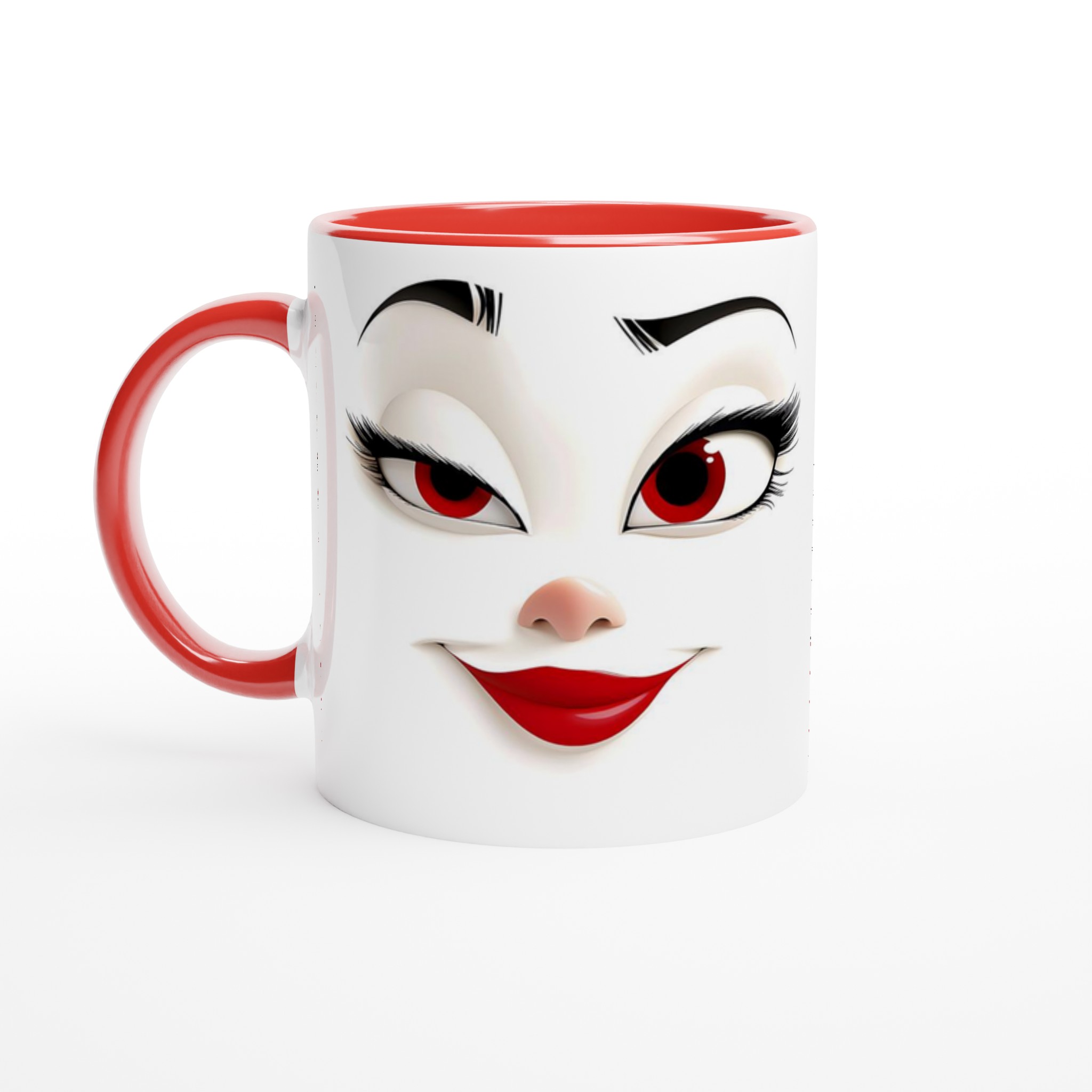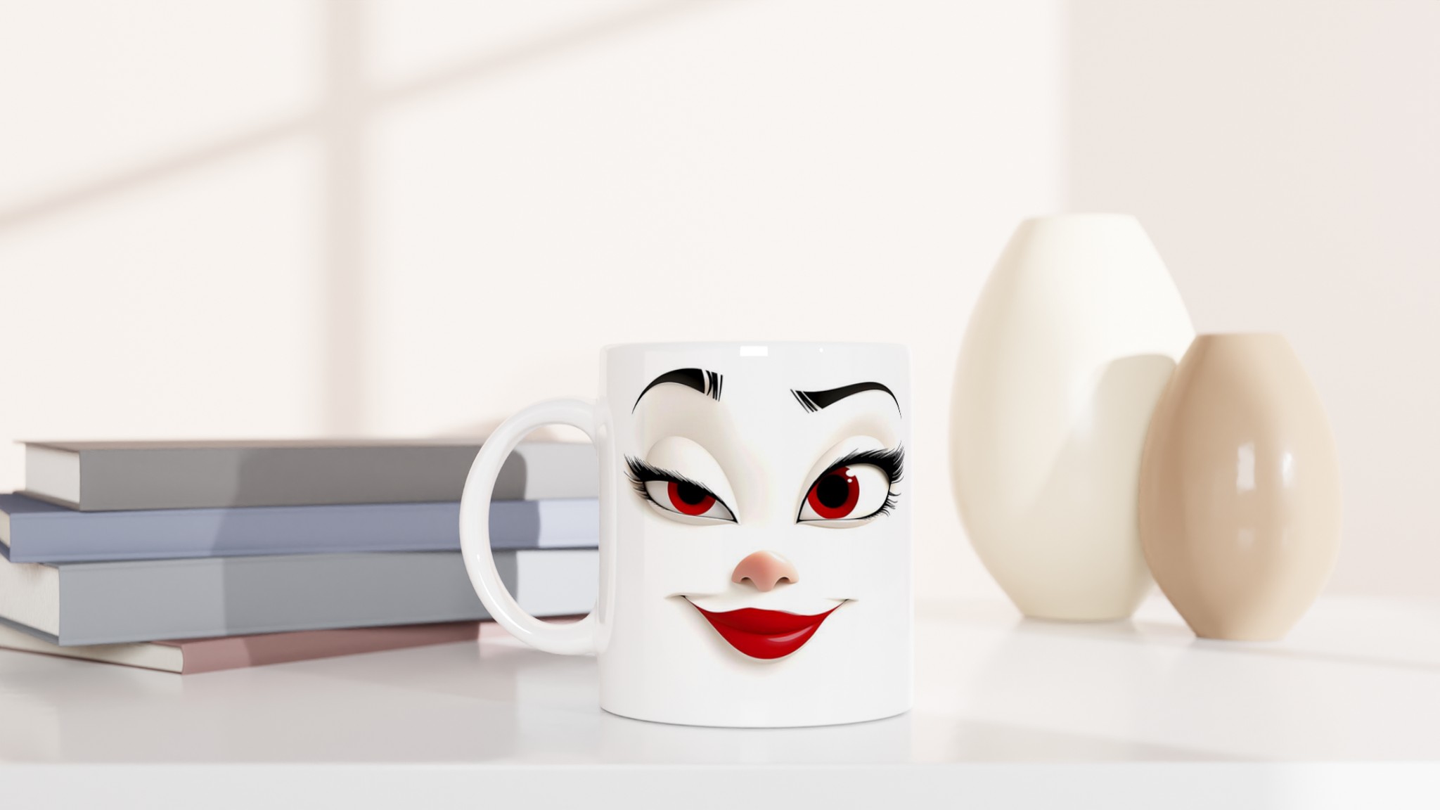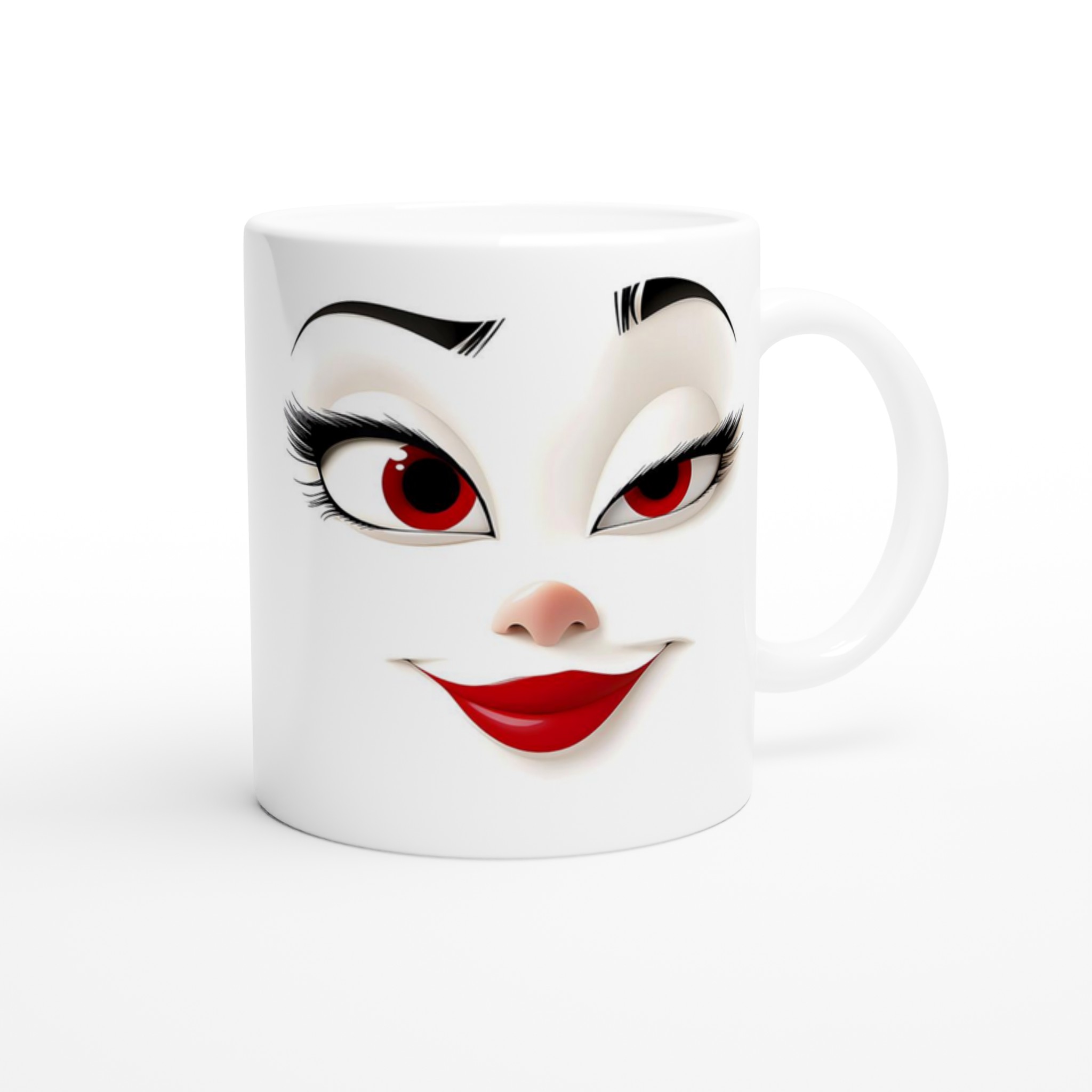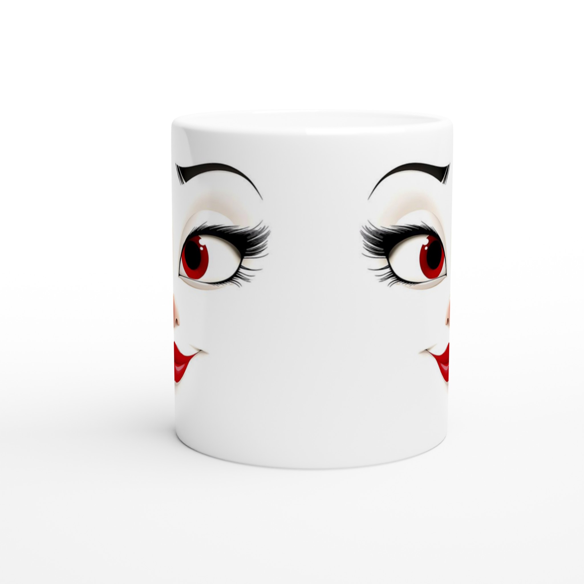 Lyft varje kaffestund med vår premium keramikmugg – stilren, hållbar och skapad för att låta ditt motiv glänsa. Denna mugg fångar blicken med sin distinkta design som påminner om en karaktäristisk ansiktsuttryck, komplett med livfulla röda ögon, mjukt böjda ögonbryn och sensuella röda läppar. Det är den perfekta konversationsstartaren för fikarasten eller en rolig present till den som älskar unika detaljer.