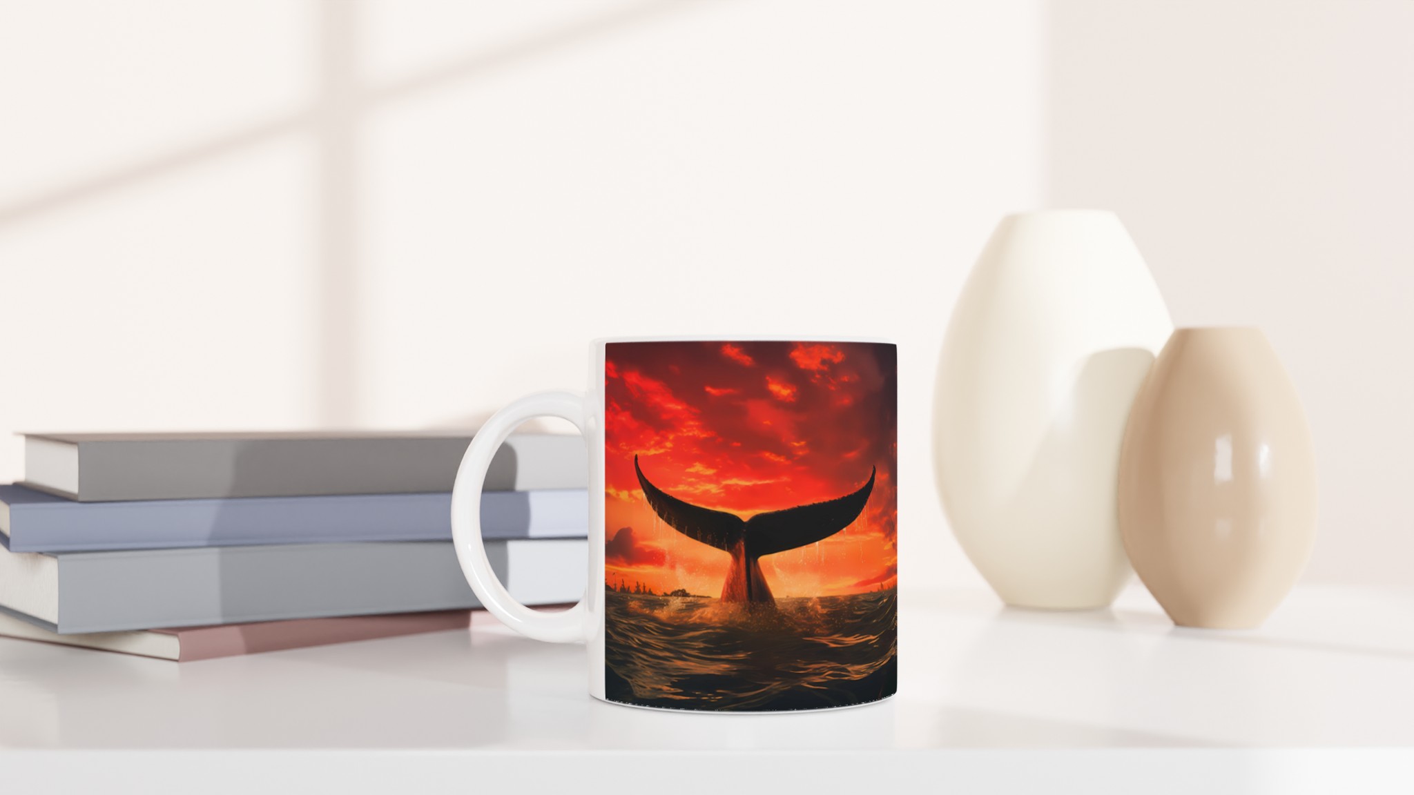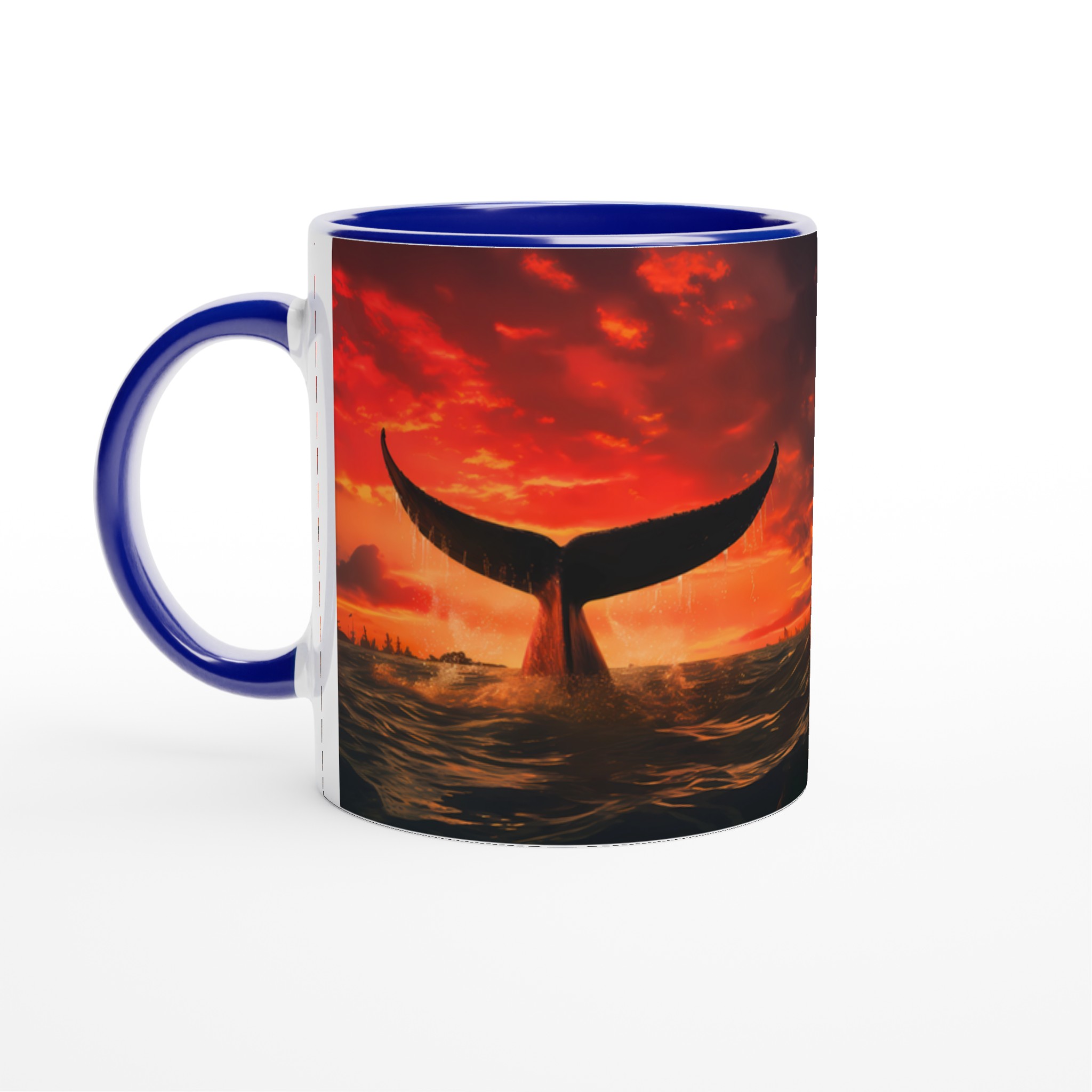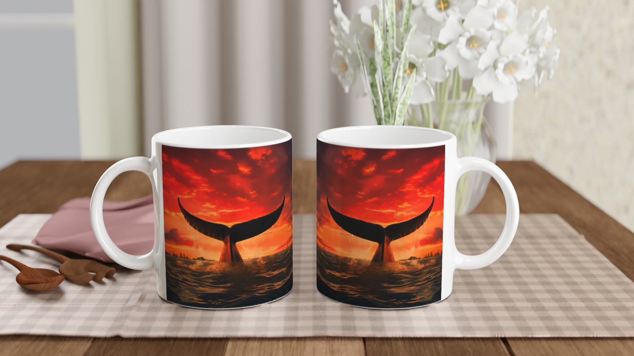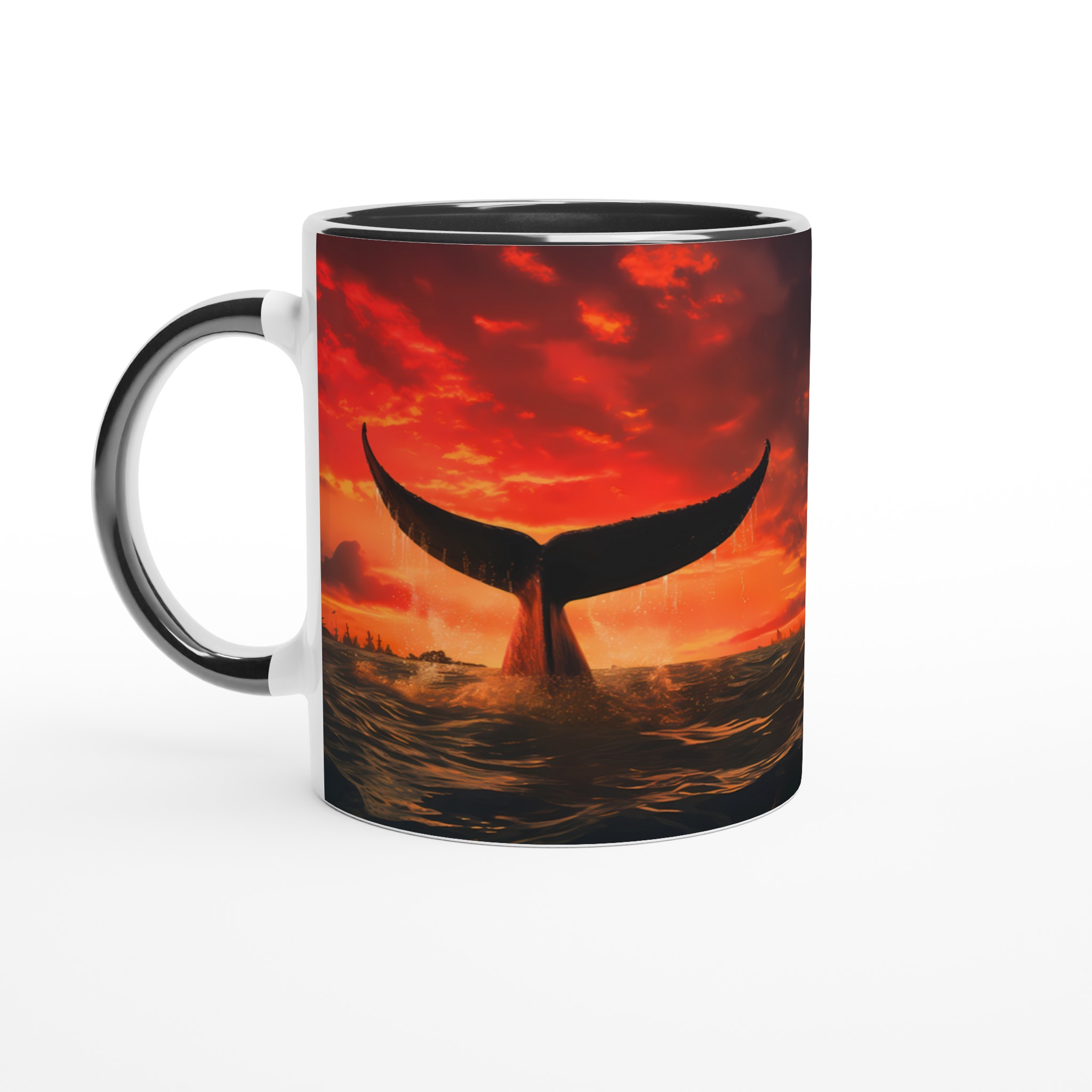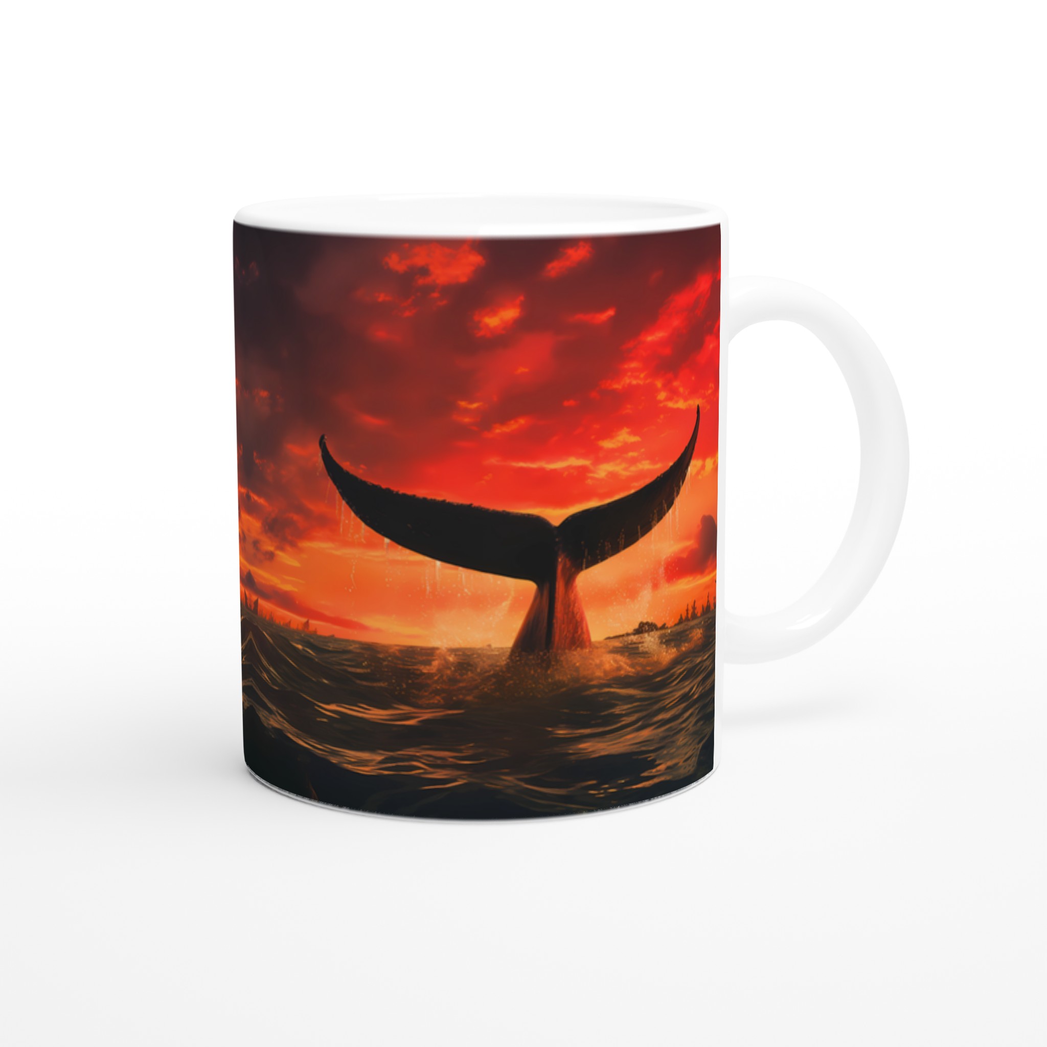 Föreställ dig en lugn solnedgång över havet, där en mäktig valfena bryter ytan i en explosion av stänk mot en himmel målad i eldröda och orange nyanser. Denna unika keramiska mugg fångar den dramatiska skönheten hos havet och dess invånare vid skymningen, vilket gör den till den perfekta följeslagaren för dina stunder av reflektion eller en livlig start på dagen.