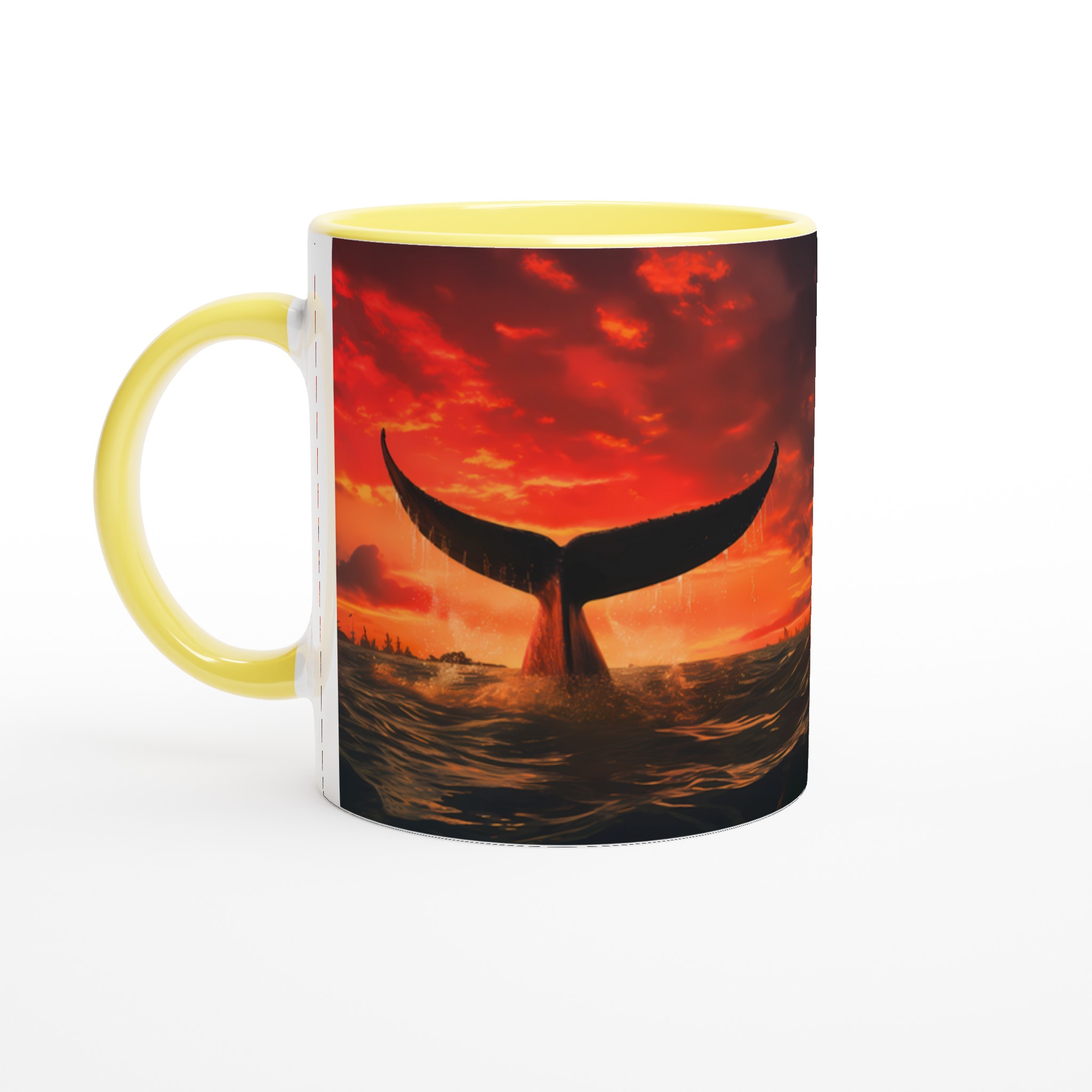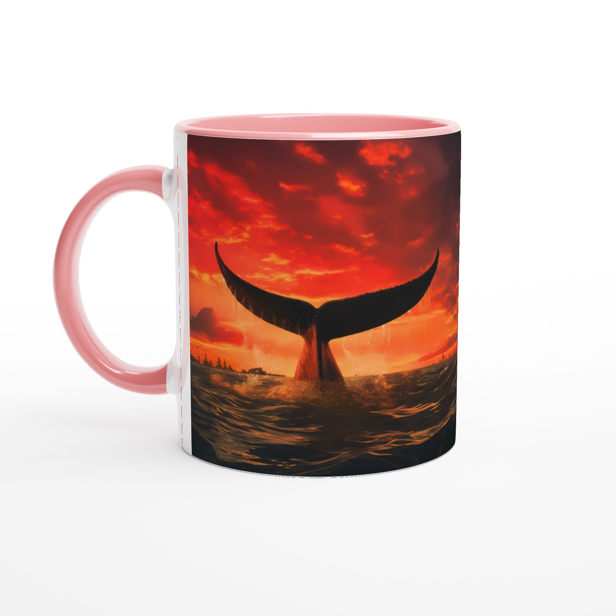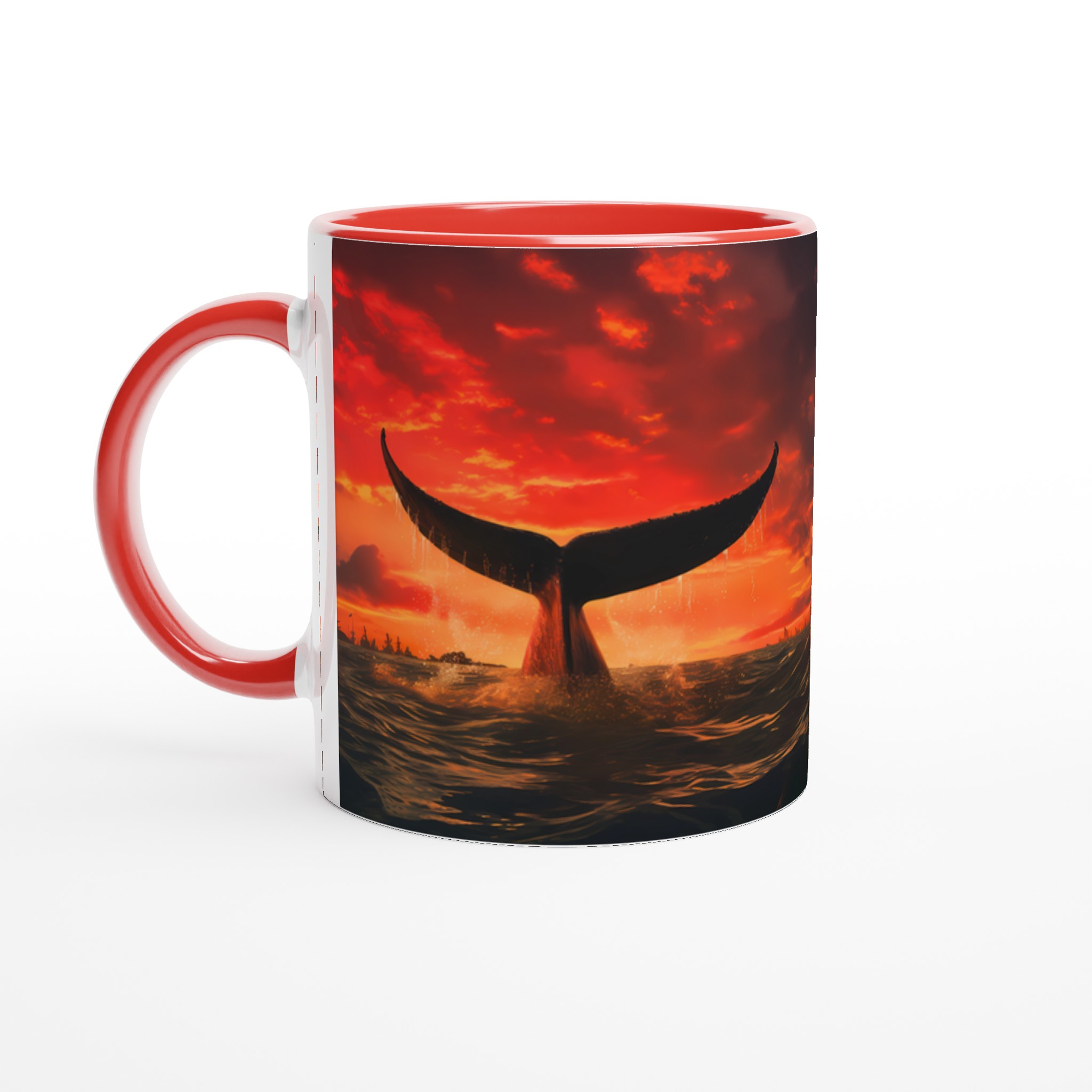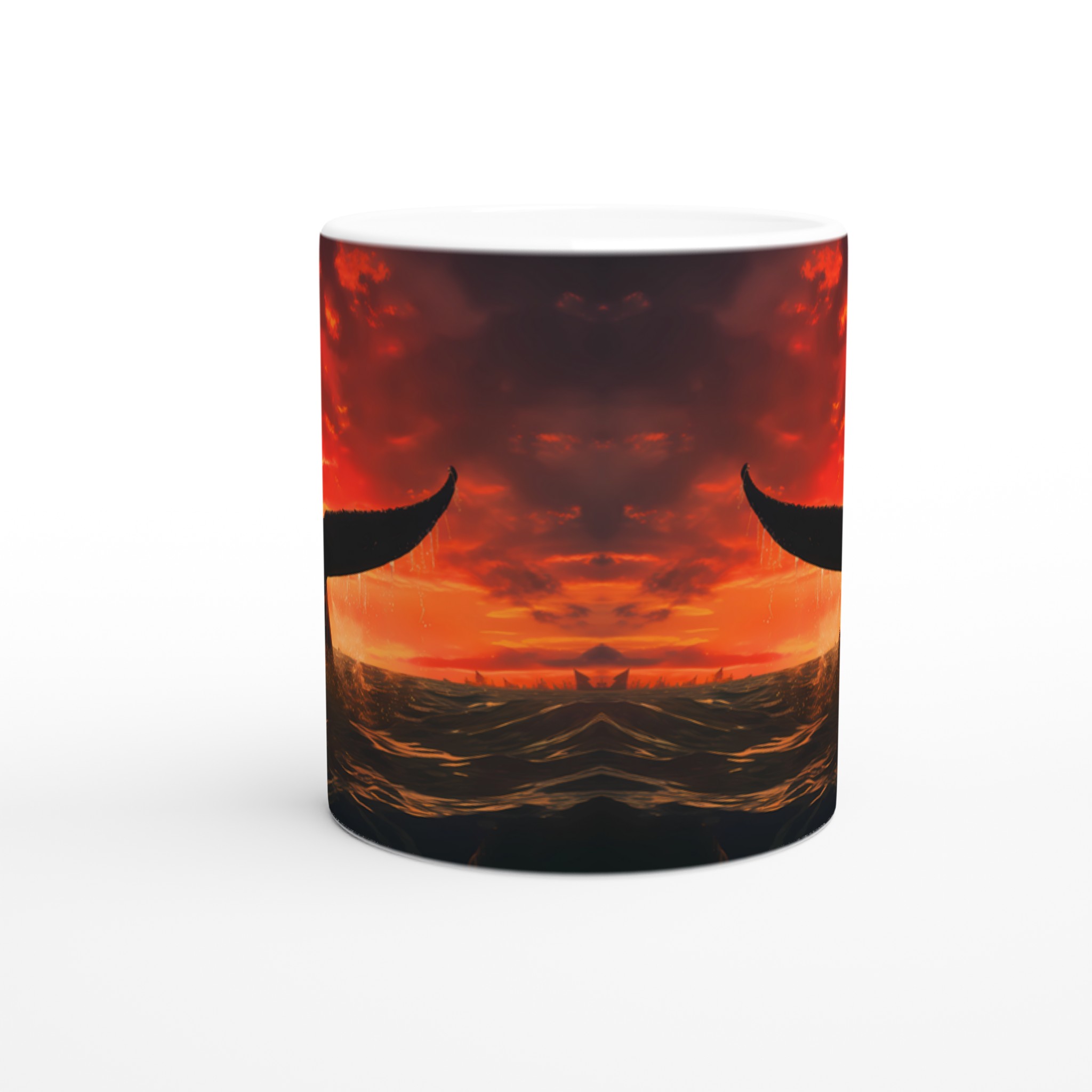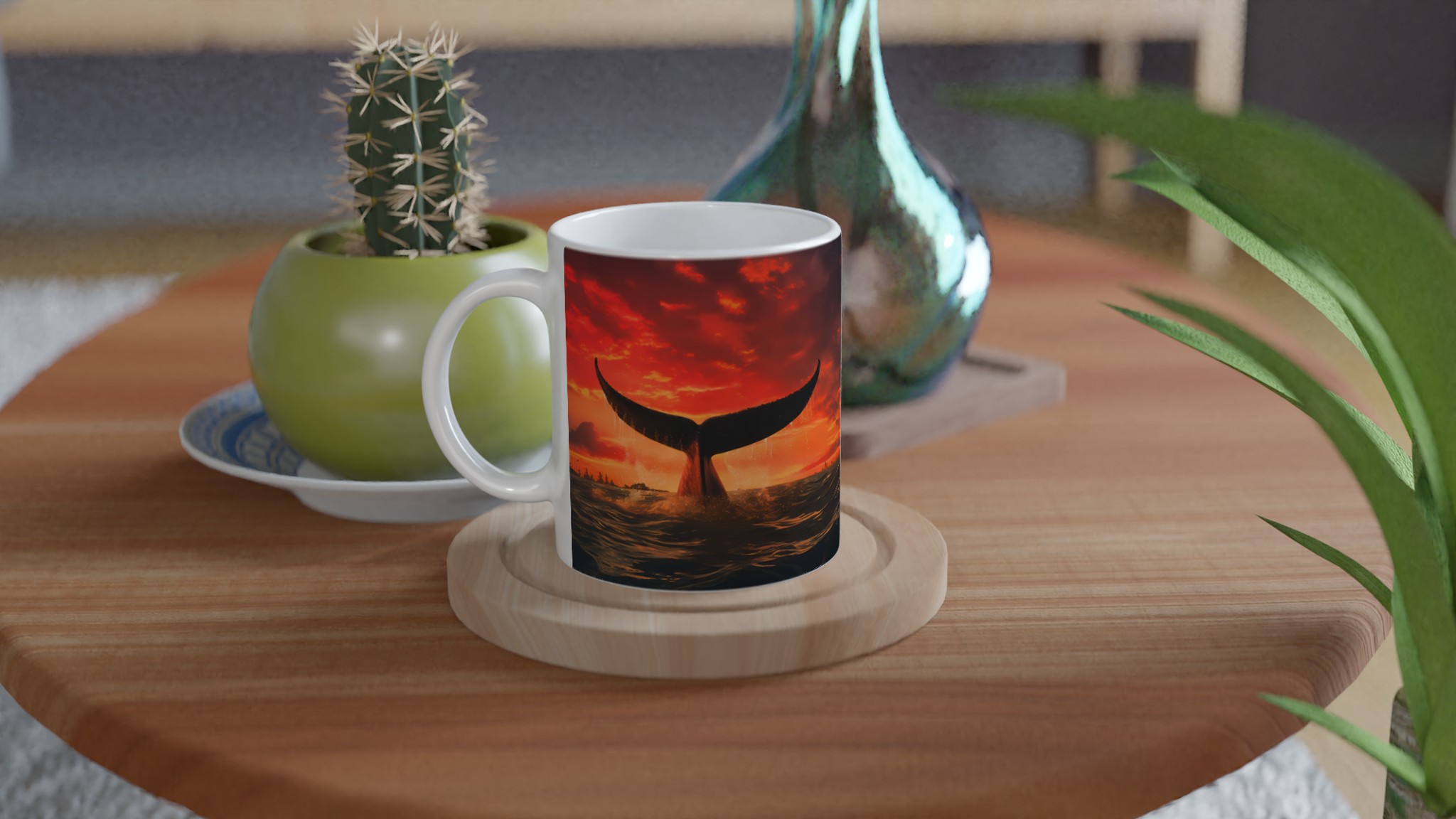 Föreställ dig en lugn solnedgång över havet, där en mäktig valfena bryter ytan i en explosion av stänk mot en himmel målad i eldröda och orange nyanser. Denna unika keramiska mugg fångar den dramatiska skönheten hos havet och dess invånare vid skymningen, vilket gör den till den perfekta följeslagaren för dina stunder av reflektion eller en livlig start på dagen.