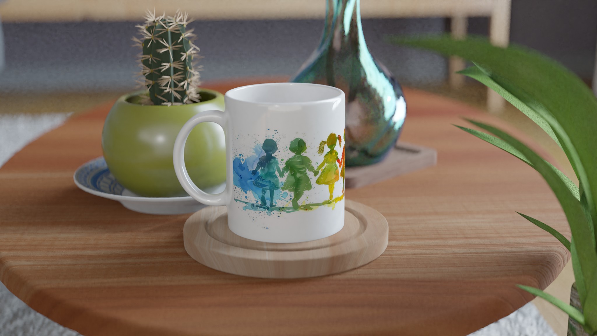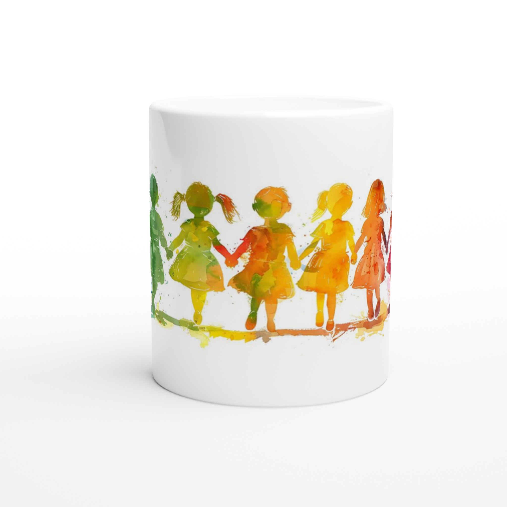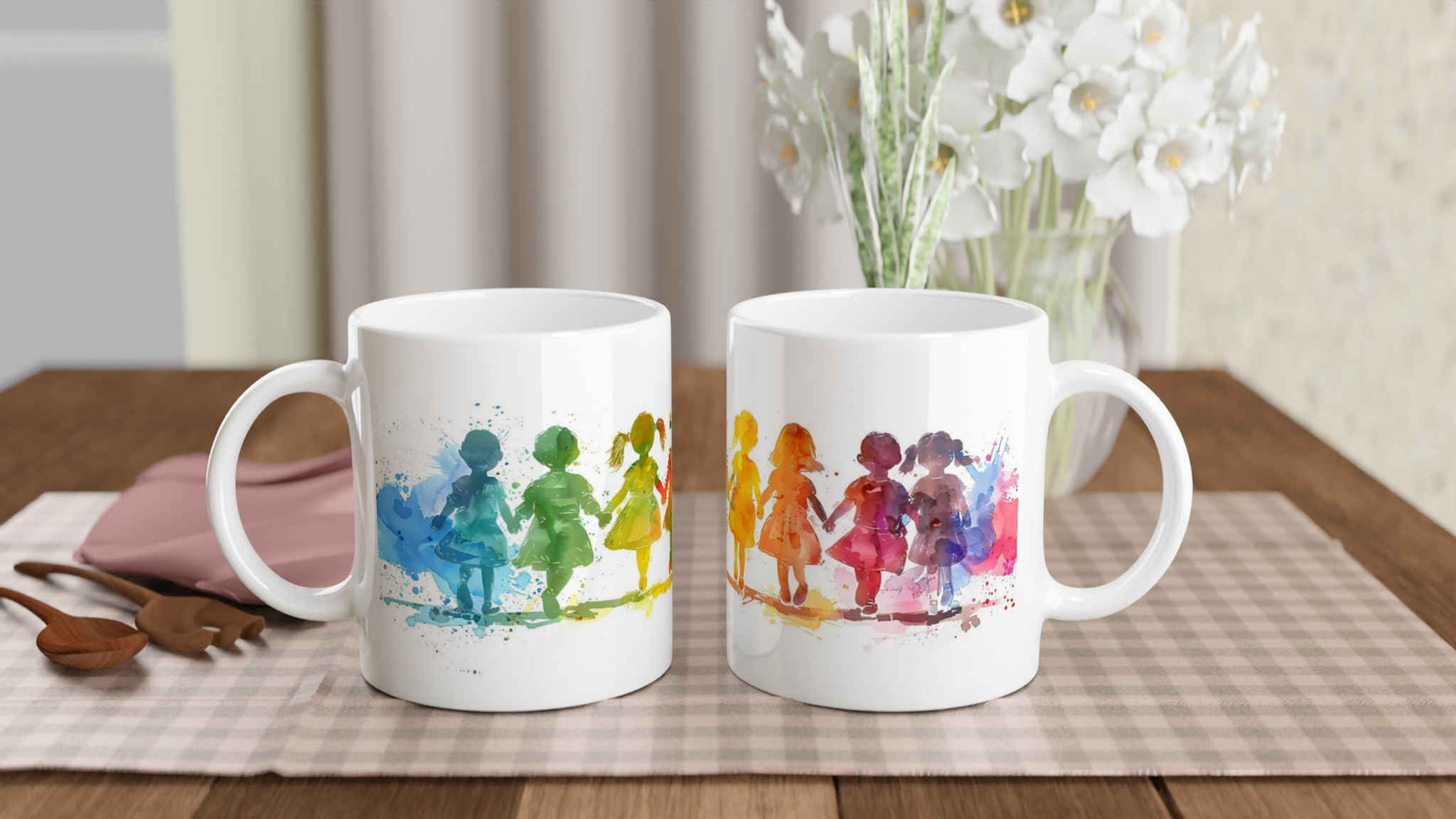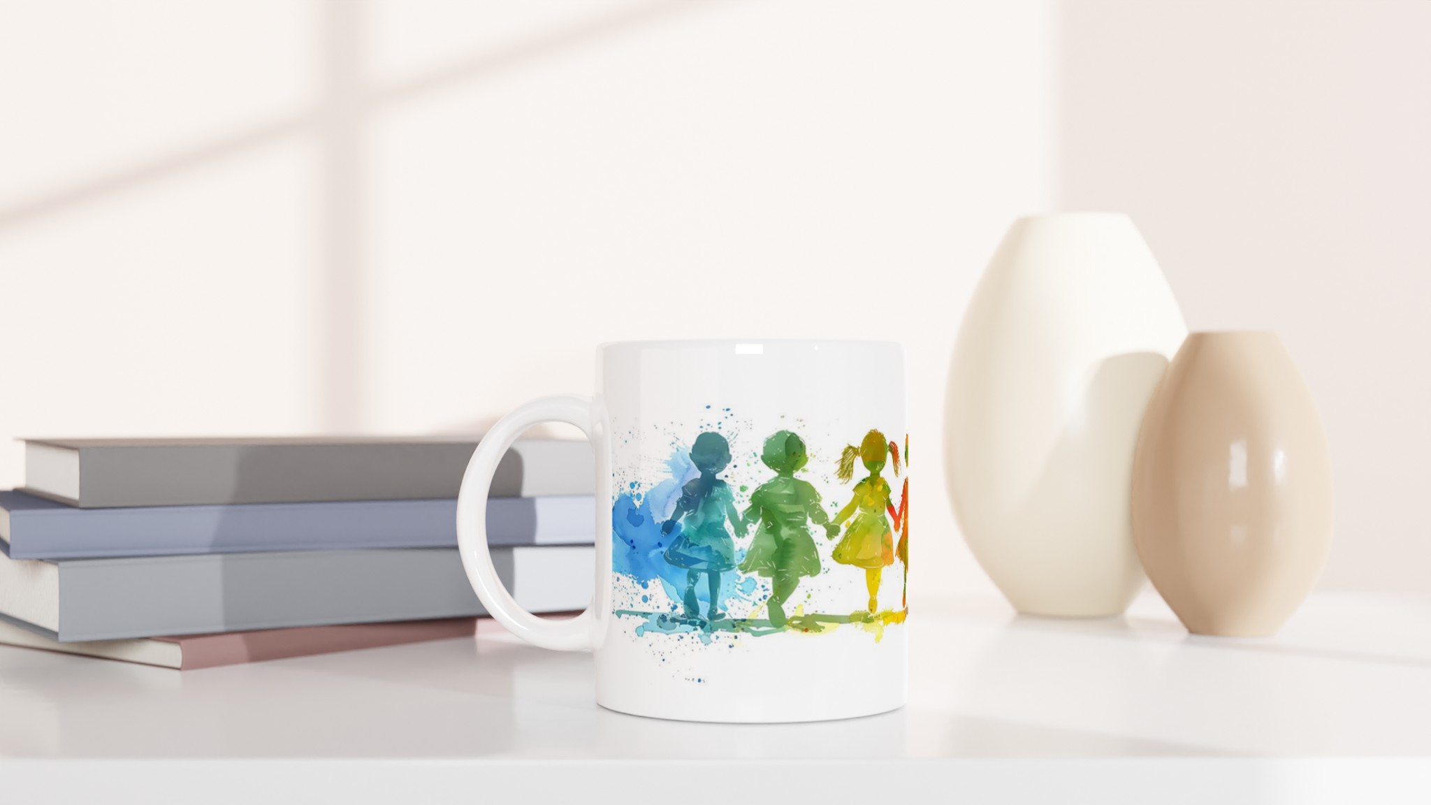 Låt din vardag fyllas med glädje och färg med vår ”Vänskap i Akvarell” keramiska mugg. Designen, som fångar lekfulla barnsiluetter hand i hand, skapar en känsla av gemenskap och varma minnen. Den akvarellinspirerade färgpaletten sträcker sig från svala blå och gröna toner till varma gula, orange och röda nyanser, vilket ger varje mugg en unik och levande karaktär som lyser upp varje ögonblick.