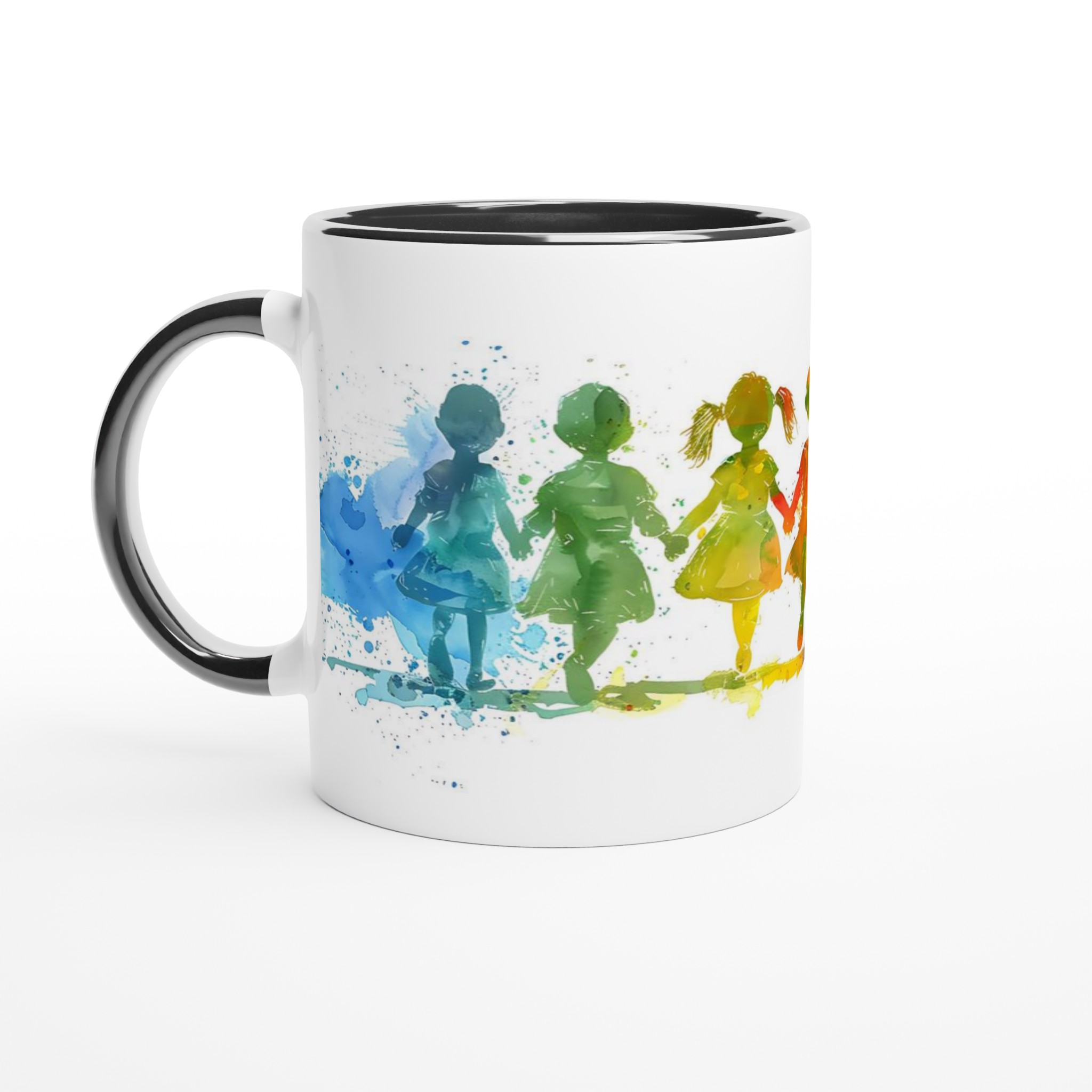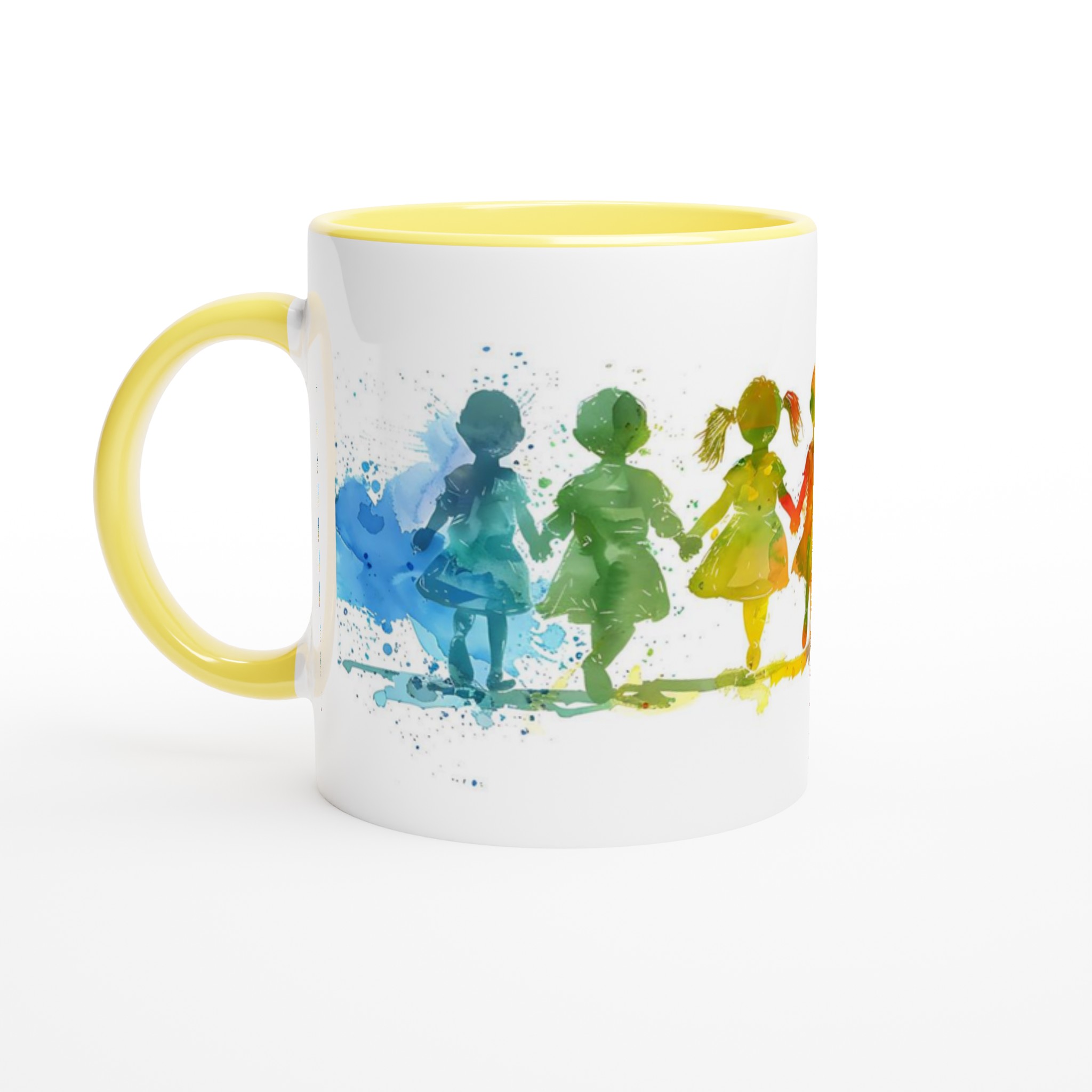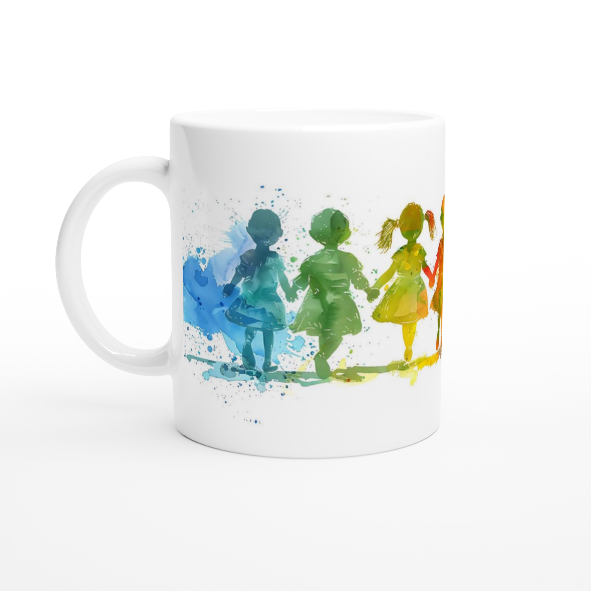 Låt din vardag fyllas med glädje och färg med vår ”Vänskap i Akvarell” keramiska mugg. Designen, som fångar lekfulla barnsiluetter hand i hand, skapar en känsla av gemenskap och varma minnen. Den akvarellinspirerade färgpaletten sträcker sig från svala blå och gröna toner till varma gula, orange och röda nyanser, vilket ger varje mugg en unik och levande karaktär som lyser upp varje ögonblick.