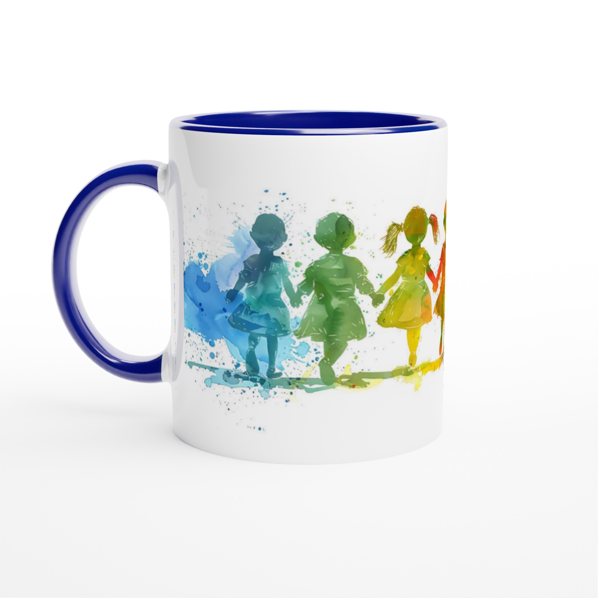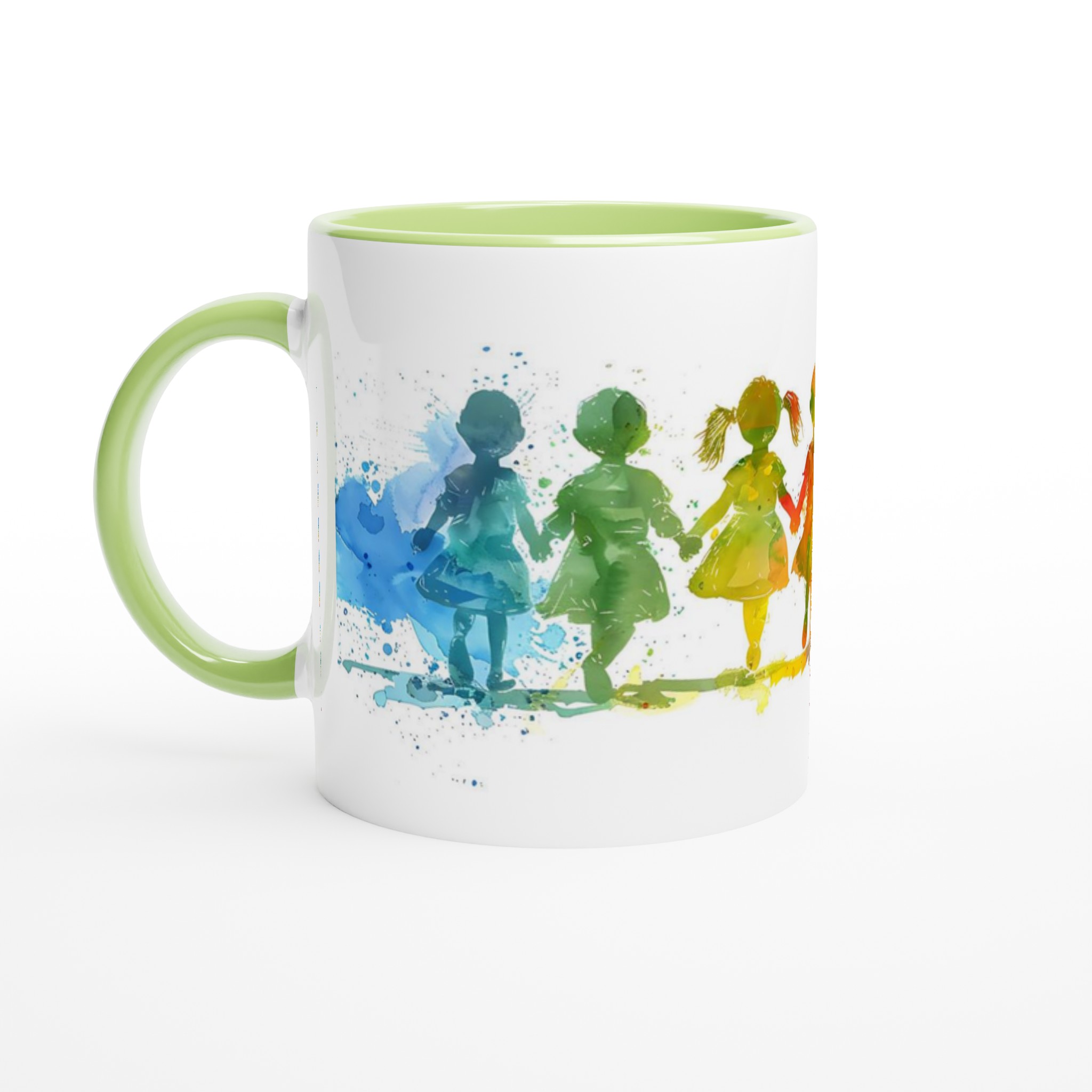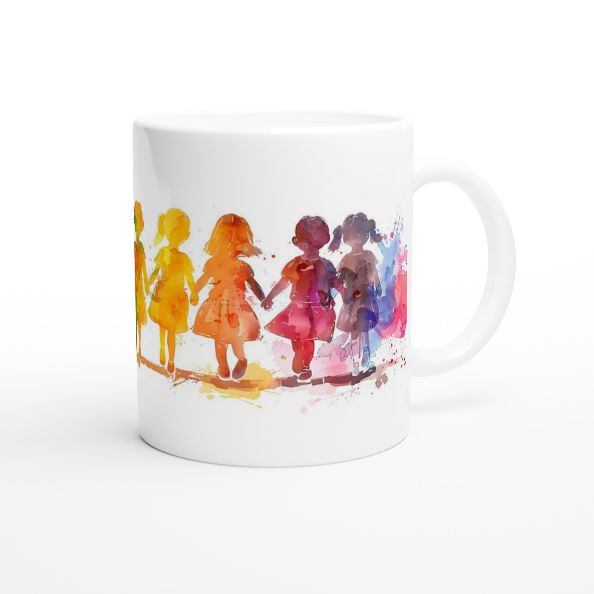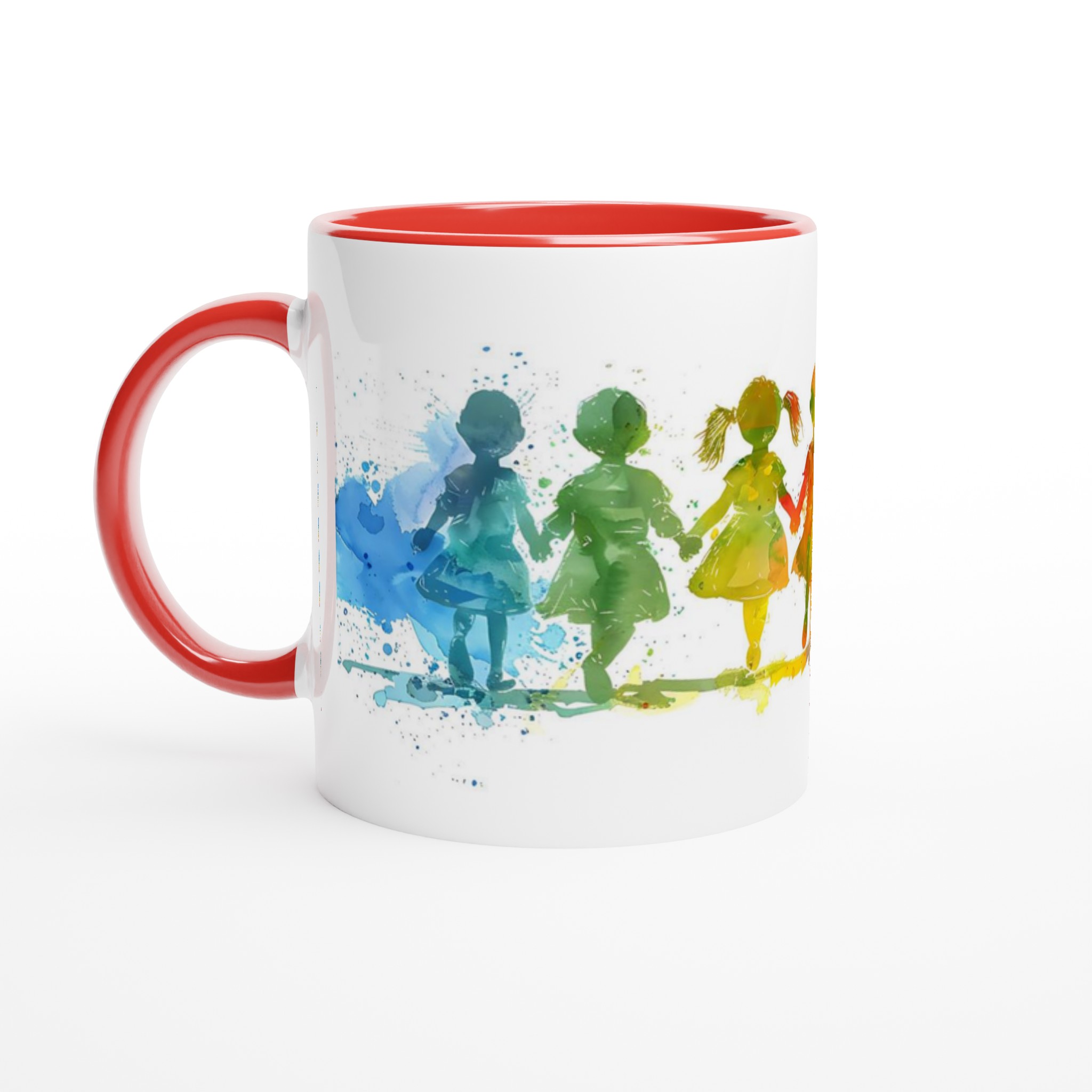 Låt din vardag fyllas med glädje och färg med vår ”Vänskap i Akvarell” keramiska mugg. Designen, som fångar lekfulla barnsiluetter hand i hand, skapar en känsla av gemenskap och varma minnen. Den akvarellinspirerade färgpaletten sträcker sig från svala blå och gröna toner till varma gula, orange och röda nyanser, vilket ger varje mugg en unik och levande karaktär som lyser upp varje ögonblick.