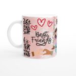 Fira de speciella banden i ditt liv med denna charmiga keramiska mugg, perfekt för att hylla dina ”besties” och ”best friends forever”! Denna mugg är prydd med en hjärtevärmande illustration av två vänner i en öm omfamning, omgiven av vackra gula blommor och lekfull typografi i guldtoner som utstrålar glädje och samhörighet. Den blir snabbt en vardagsfavorit, oavsett om det är för morgonkaffet, kvällens varma choklad, eller en mysig tekopp under en pratstund med en vän. Den blanka vita ytan ser till att trycken framhävs med klara och levande färger, som håller sig fina även efter många turer i mikron och diskmaskinen.